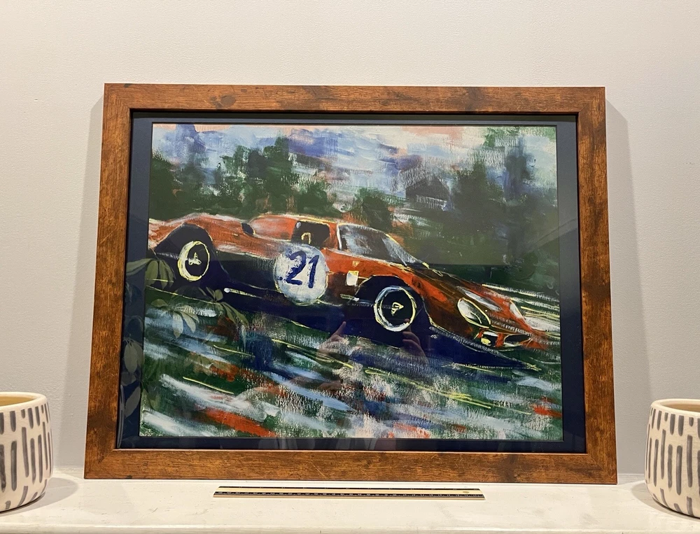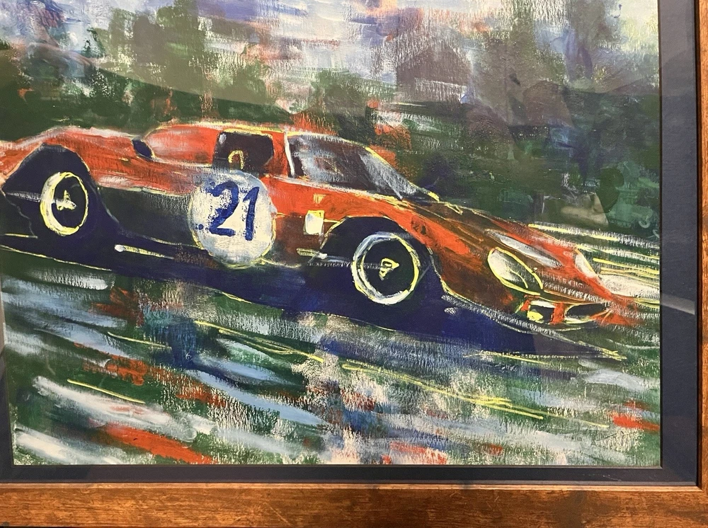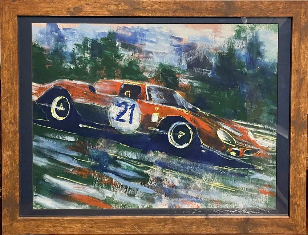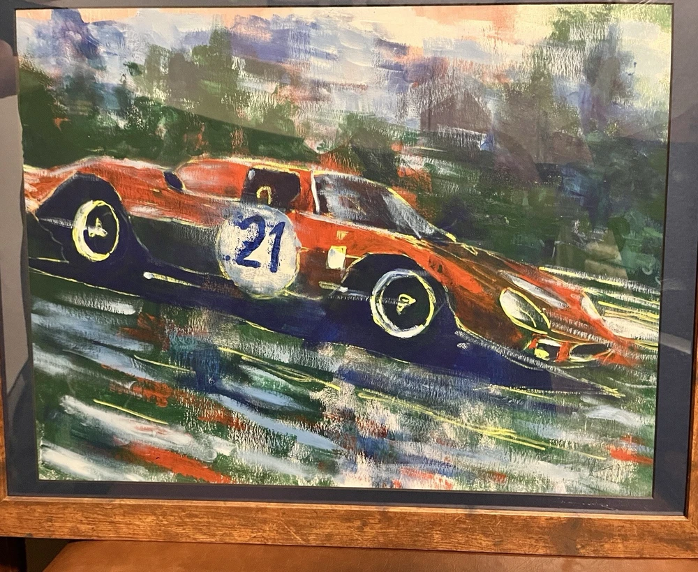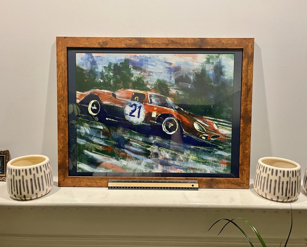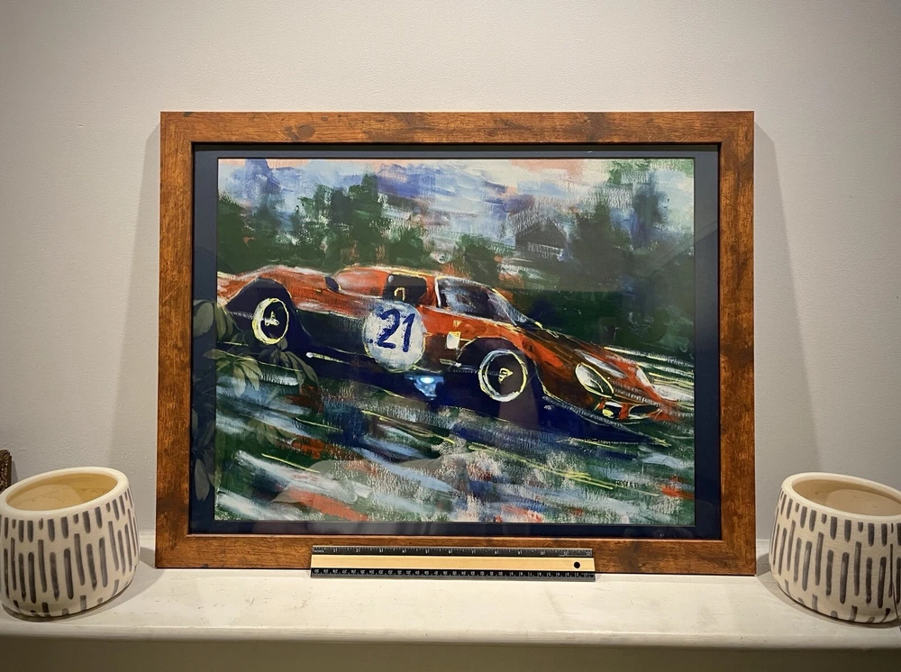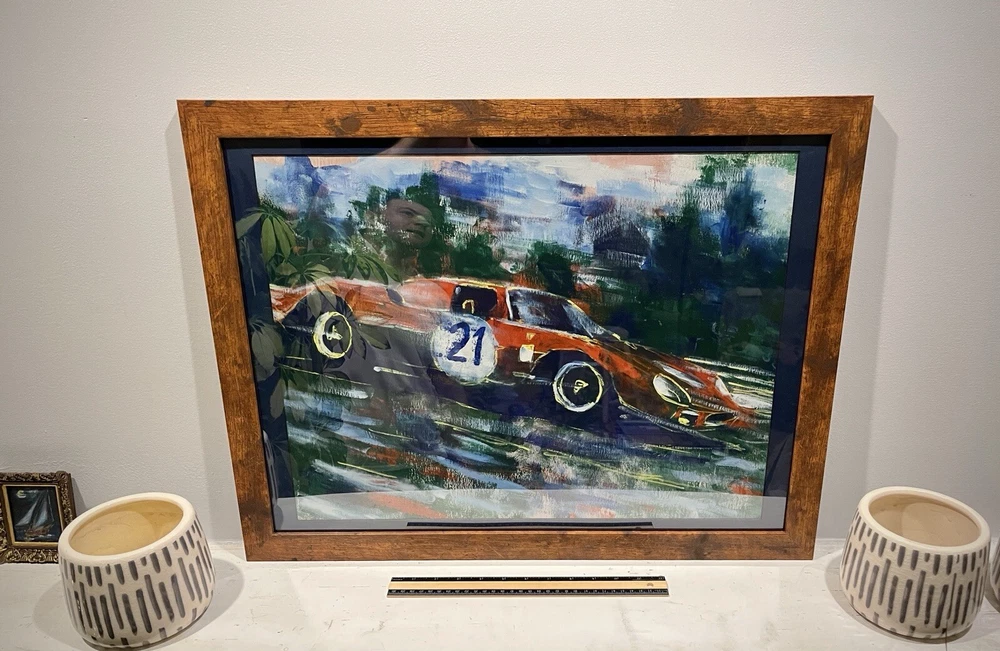 1965 Ferrari 250 LM in motion. This vehicle has been participated in Endurance race at the “24 Hours Le Mans” in 1965. Overall Dimensions approximately 20”x26”x1” painting is coming framed to a brown frame. Artwork is traditionally handmade unique and it is rare collector’s item. Can be perfect addition to fine art automotive collection.
