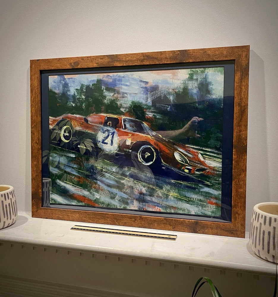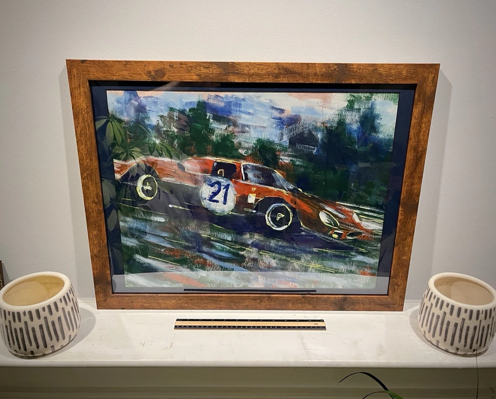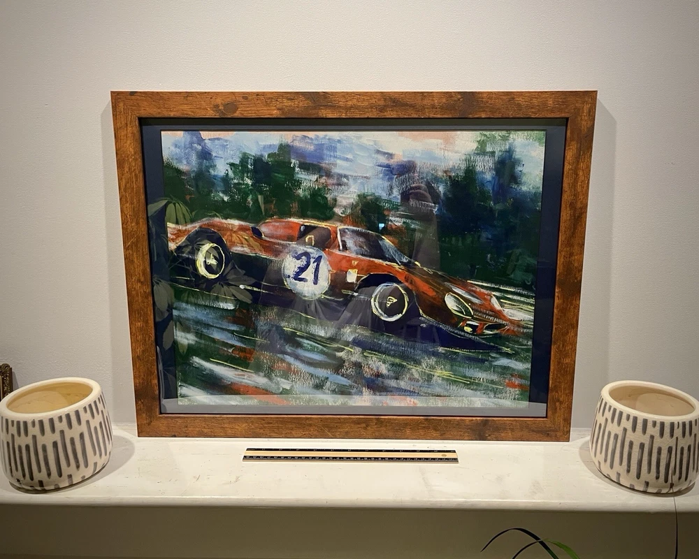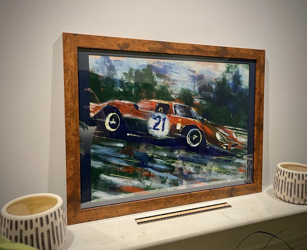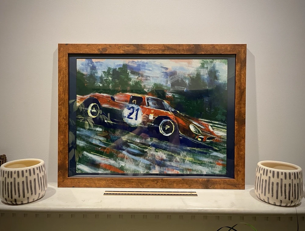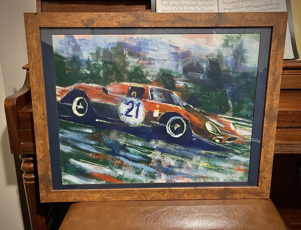 1965 Ferrari 250 LM in motion. This vehicle has been participated in Endurance race at the “24 Hours Le Mans” in 1965. Overall Dimensions approximately 20”x26”x1” painting is coming framed to a brown frame. Artwork is traditionally handmade unique and it is rare collector’s item. Can be perfect addition to fine art automotive collection.