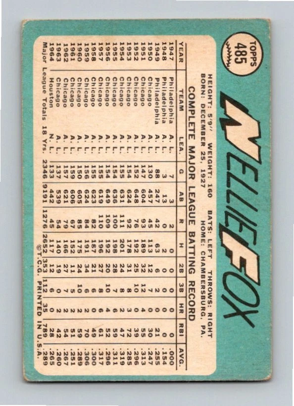 Sport: Baseball Type: Sports Cards Manufacturer: Topps Set: 1965 Topps Player/Athlete: Nellie Fox Card Number: 485 Year Manufactured: 1965