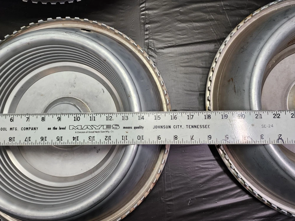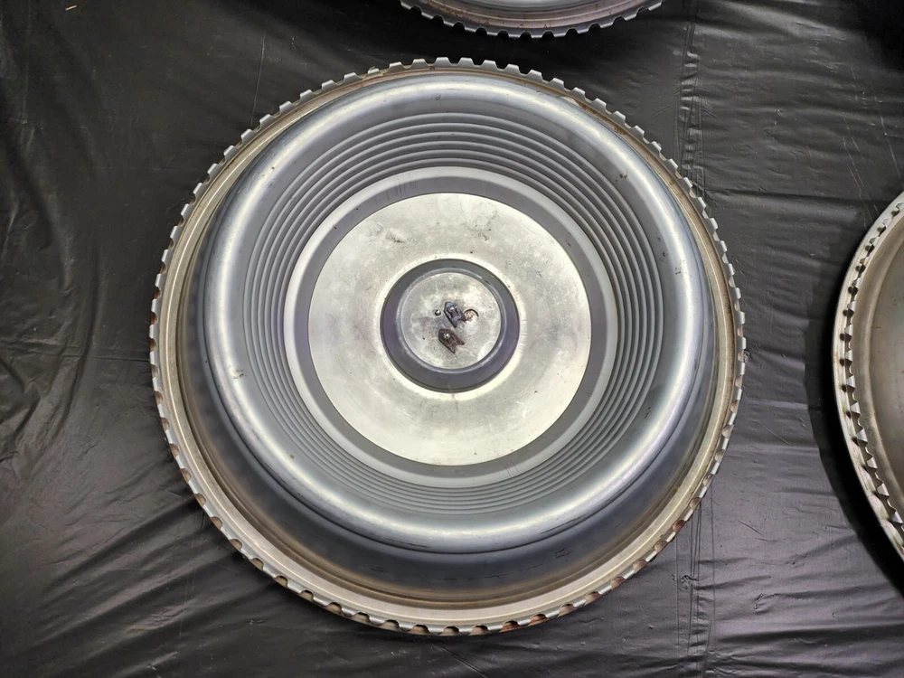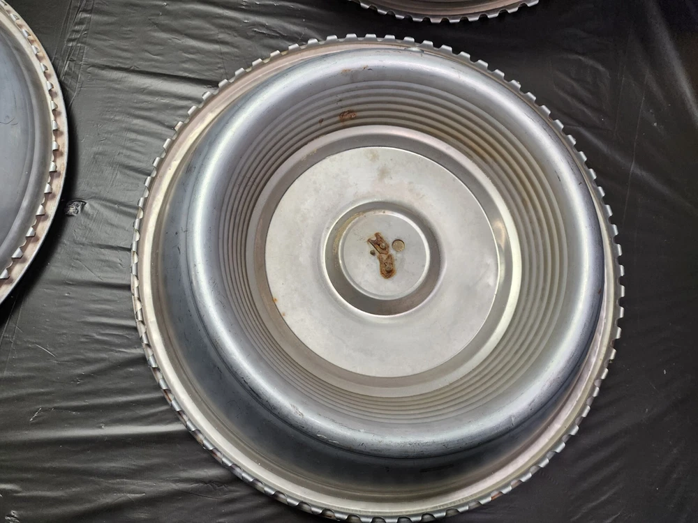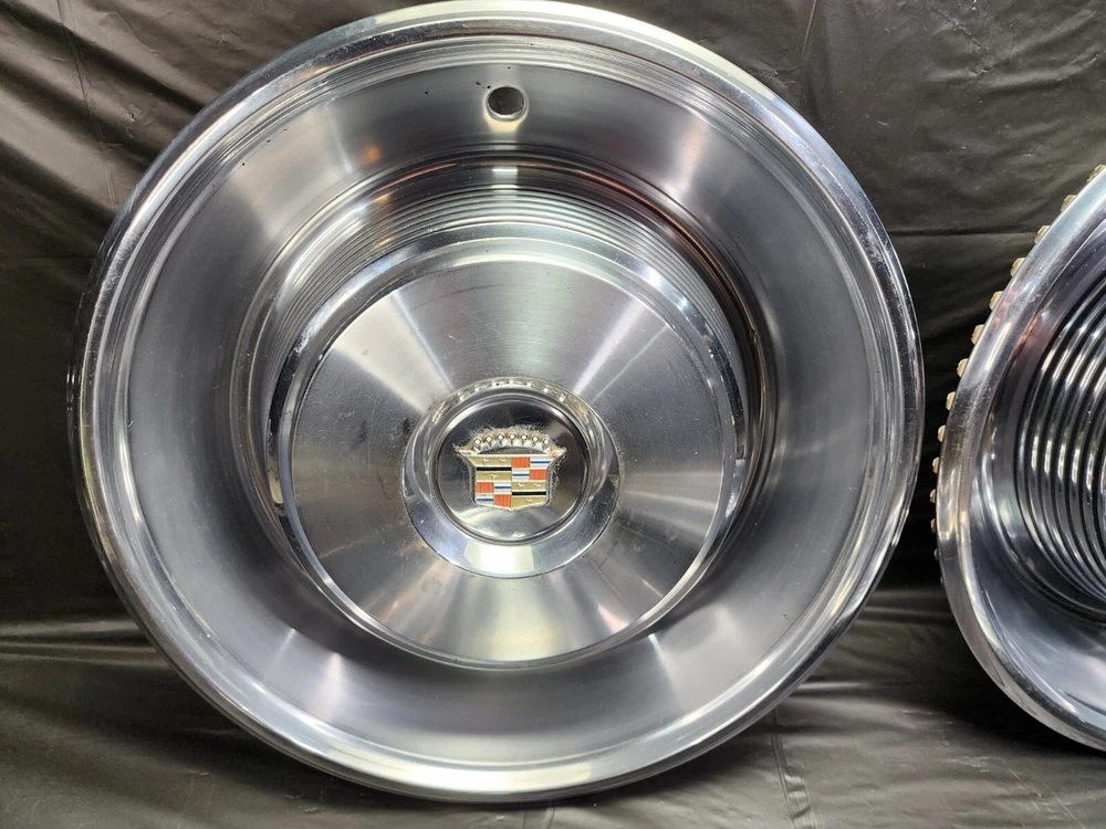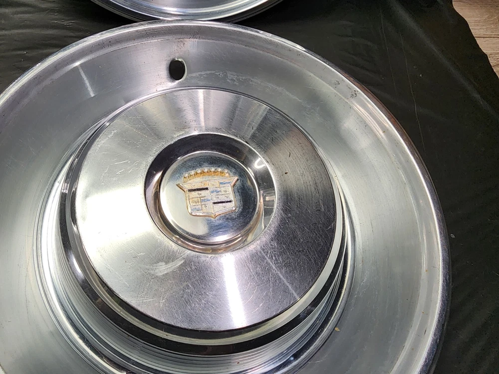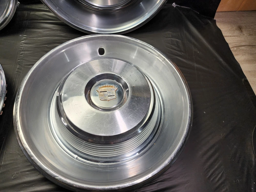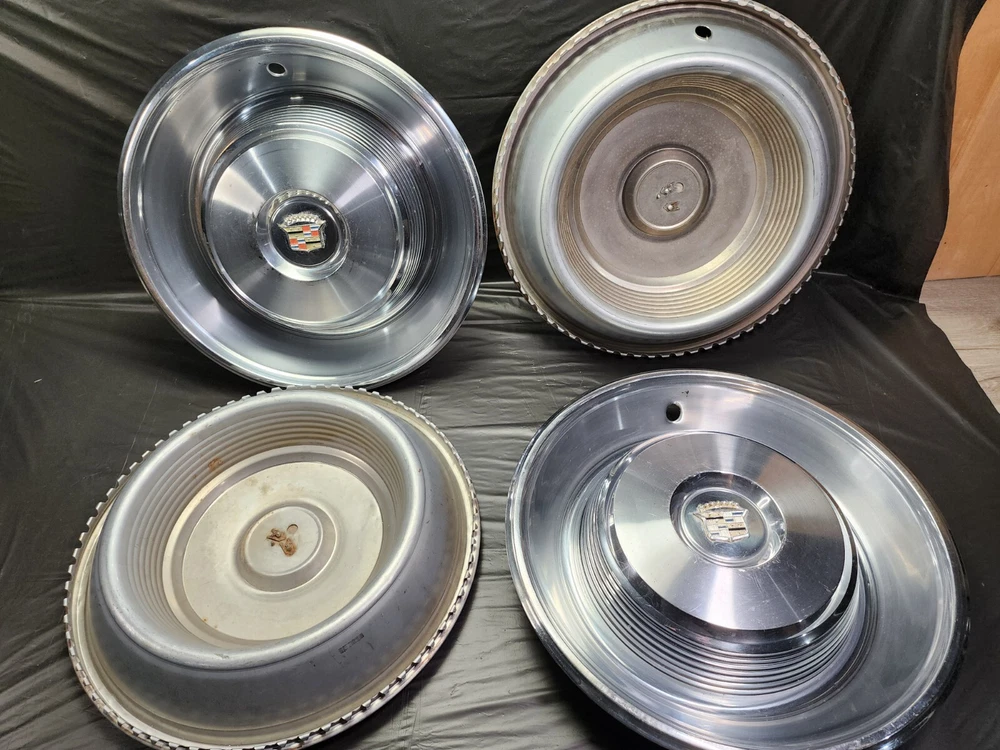 really clean set of 4 60s cadillac sombrero style hubcaps/ wheel covers for 15 in rims. in great condition regarding their age and slight use. minor fading and scuffing, could use a good polishing to bring em back to full shine, but otherwise in beautiful condition. These are Used hubcaps off of old classic cars that were driven on the road, so please see photos for complete condition as they are not all perfect. Check out more of my ebay page as we are going through and listing a ton of classic / vintage hubcaps from the the 20's 30's 40's 50's 60's 70's 80's 90's 00's and up. all different makes and models such as Ford Chevy Chevrolet GM Cadillac GMC camero nova Chevelle Nomad Bel Air Mercury Corvette Mustang Oldsmobile Pontiac Lincoln Dodge Plymouth Buick Chrysler Mopar Fairlane Volkswagen Cheiftain Challanger Charger 1500 4x4 muscle car hot rod rat rod Cars and Trucks 15in 14in 16in and so much more from full sets to sets of 2 and singles, you name it check us out!