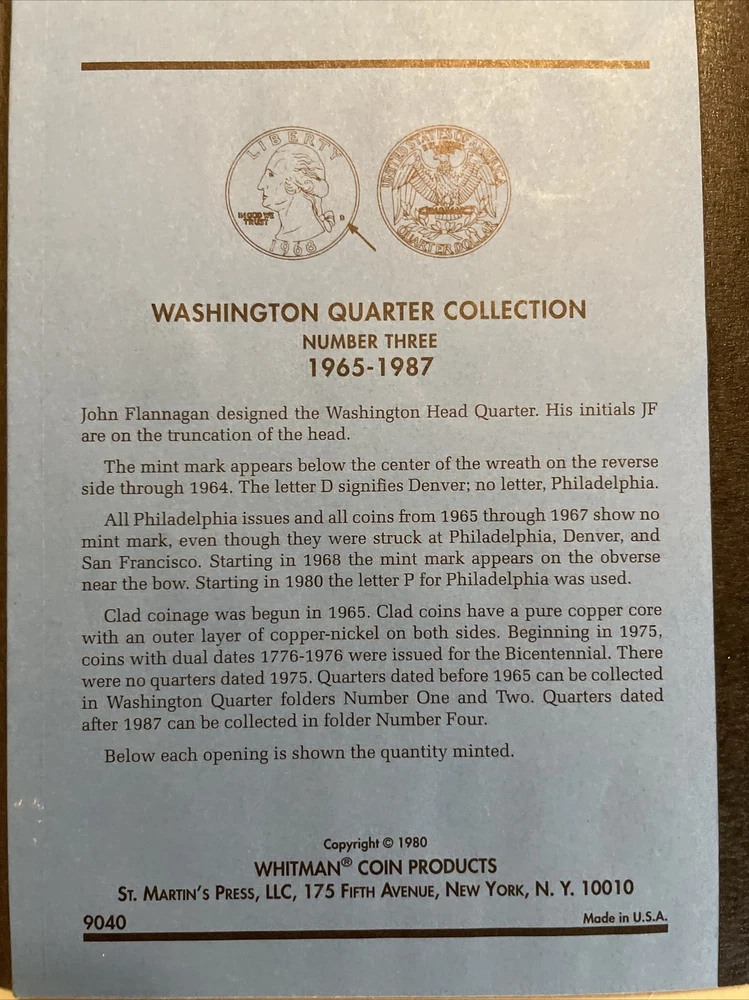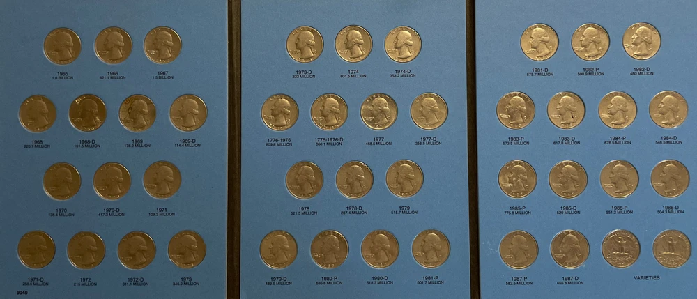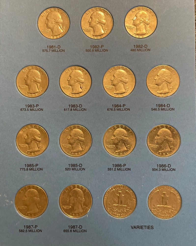 A nice circulated set and come in a Whitman album. 1965-1987 Washington Quarter set with Whitman folder includes 1982 1982 pd mints eBay Store Policies 1) PAYMENT - Please send payment within 7 days of the closing auction or item. 2) PURCHASES - If you're unhappy with your purchase, please contact us first so we can rectify the situation. We treat our customers with the up most respect. 3) QUESTIONS - Please ask! We try to take the best pictures to represent and item. With coins, grading is an art and we do our best to grade correctly. 4) PROMISE - Your satisfaction is guaranteed, and we offer a no questions asked return policy within 14 days of purchase. Please see our feedback, we are very easy to work with and contact us for any reason if you are not happy with any purchase. Thank you, Alan