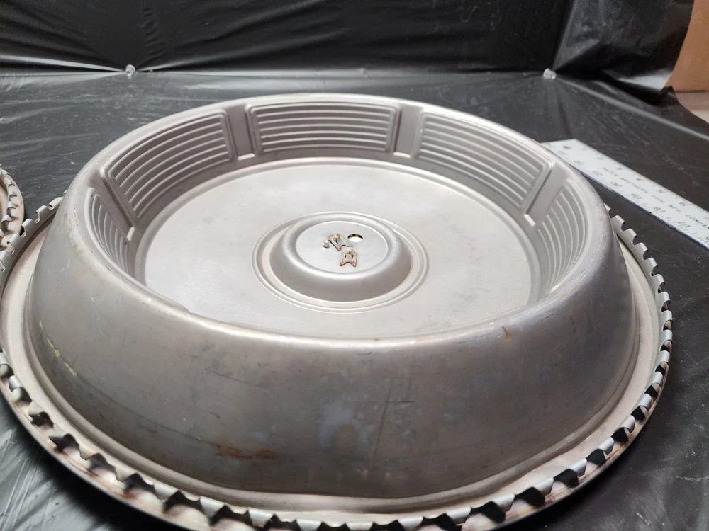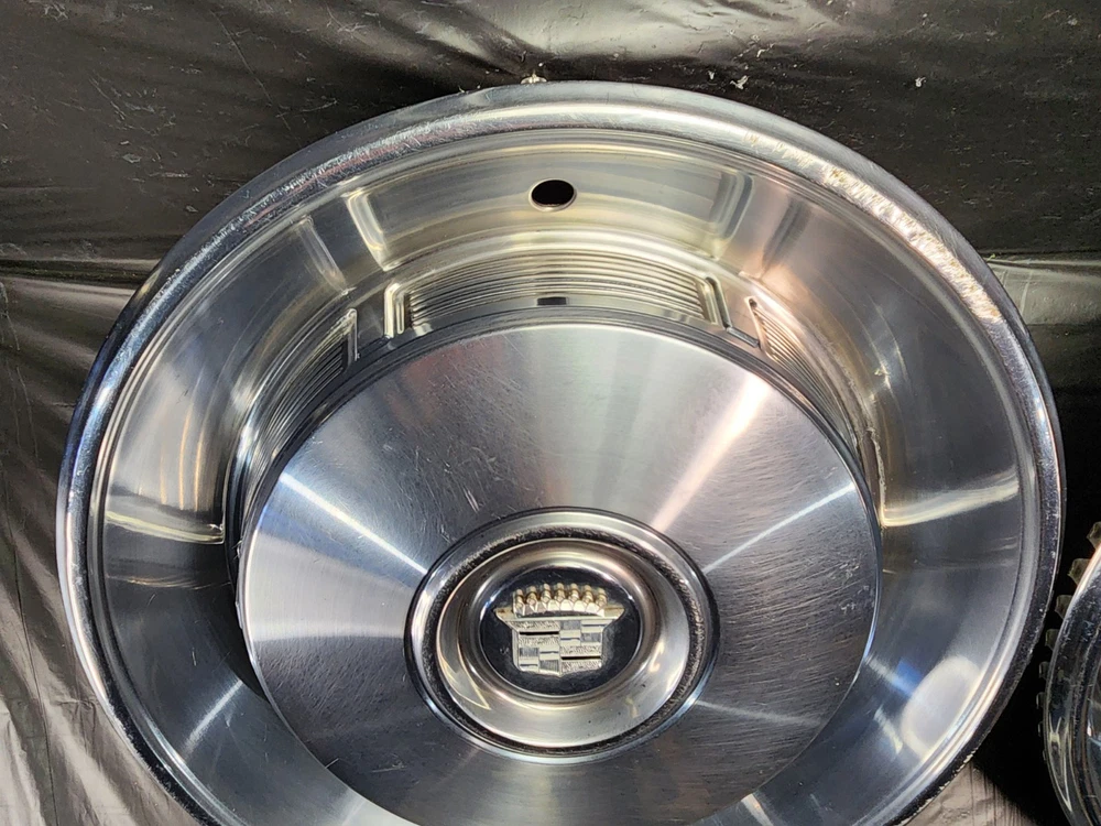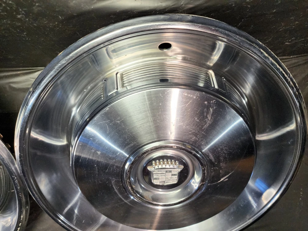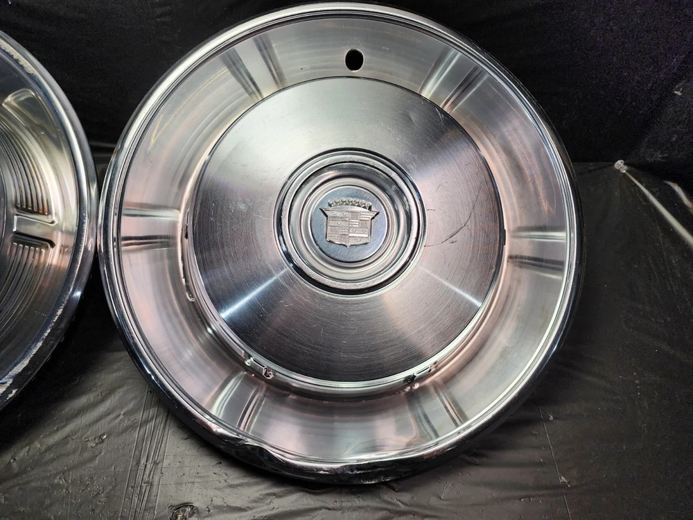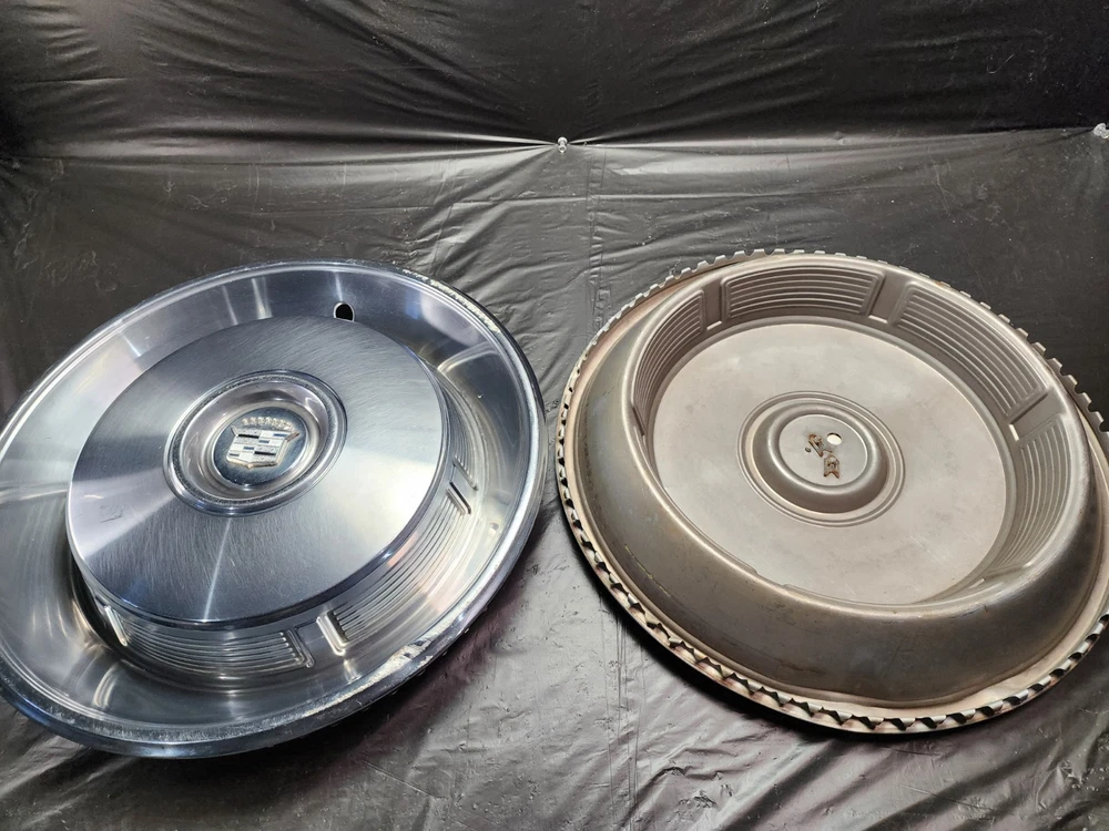 Vintage 40s 50s 60s 70s hub caps. 1966 1967 Cadillac pair of 2 Original OEM Factory OE hubcaps wheel covers center caps. in heavy use condition they have so.e deeper scratches and dings, would be great on a ratrod or as wall hangers. These are Used hubcaps off of old classic cars that were driven on the road and used, so please see photos for complete condition as they are not all perfect. Most have some fading, dings, scuffing, mineral staining, etc could use a good polishing to bring em back to full shine, but otherwise in beautiful condition. Check out more of my ebay page as we are going through and listing a ton of classic / vintage hubcaps from the the 20's 30's 40's 50's 60's 70's 80's 90's 00's and up. all different makes and models such as Ford Chevy Chevrolet GM Cadillac GMC camero nova Chevelle Nomad Bel Air Mercury Corvette Mustang Oldsmobile Pontiac Lincoln Dodge Plymouth Buick Chrysler Mopar Fairlane Volkswagen Cheiftain Challanger Charger 1500 4x4 muscle car hot rod rat rod Cars and Trucks 15in 14in 16in and so much more from full sets to sets of 2 and singles, you name it check us out!