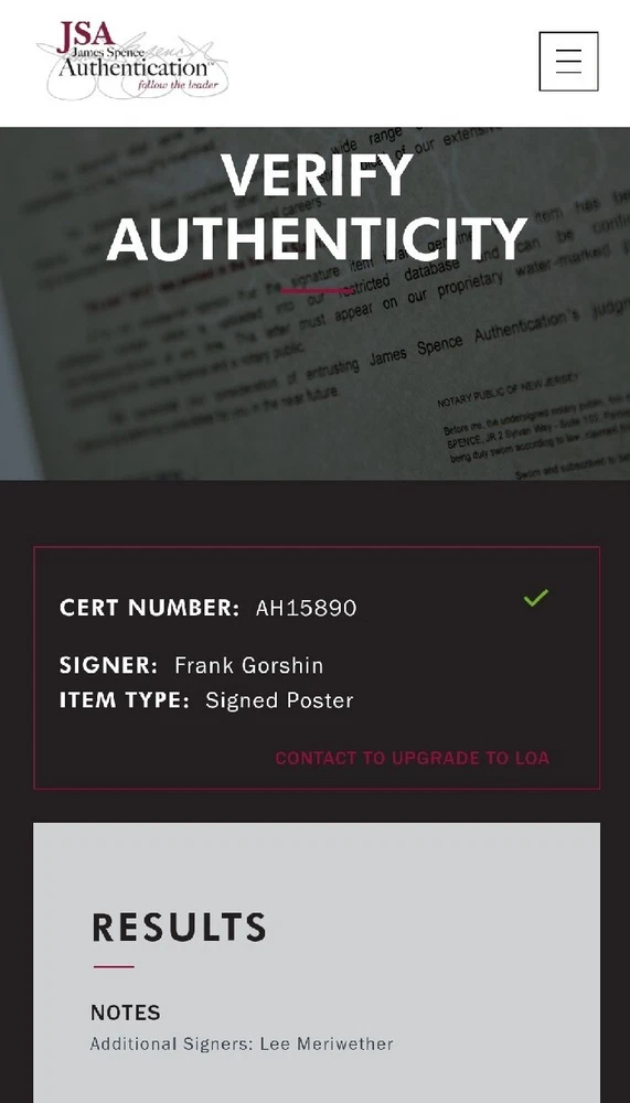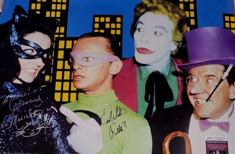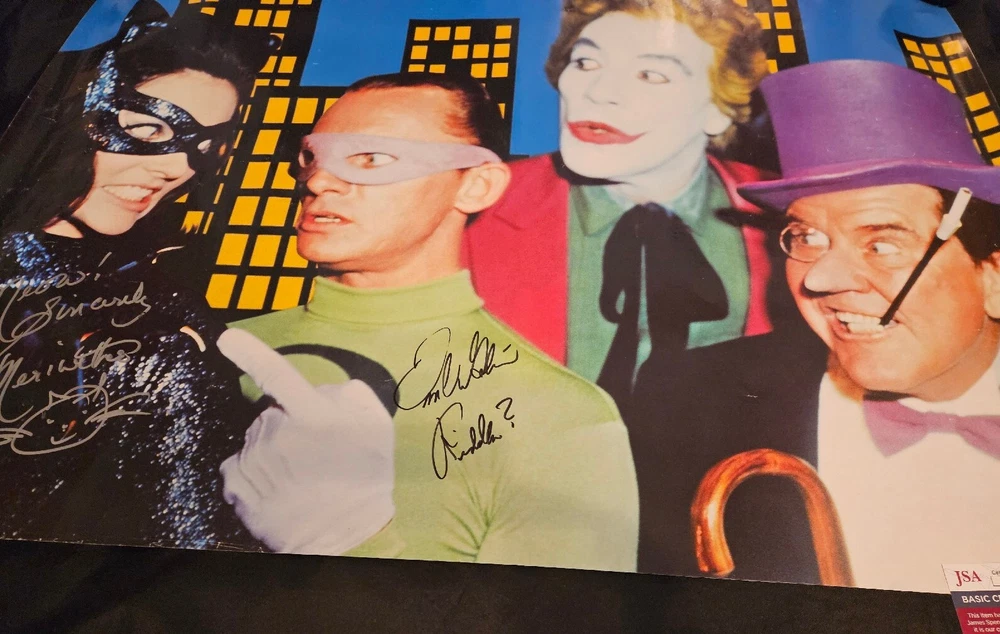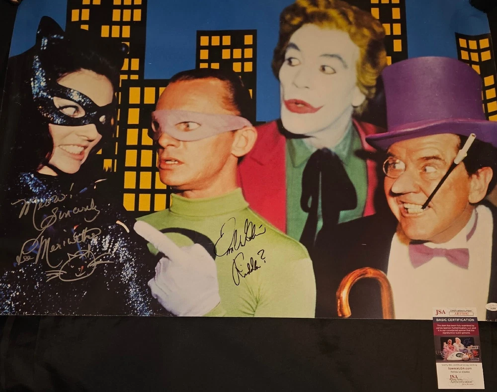 You are looking at one 23.5 x 33.5 approx. size Batman villains poster signed by Lee Meriwether & Frank Gorshin. -JSA Certified. Lee signed in silver and added a Catwoman sketch, and Frank signed in black and added Riddler? This poster was originally purchased in 2001. There is some border wear due to being framed for many years as well as some surface marks and light creases. No pinholes in the corners. Be sure to enlarge each picture for a closer inspection. Lowball offers will be automatically declined. Both autographs are HAND SIGNED and REAL. Being sold as is. THE IMPORTANT FINE PRINT Due to too many lowball offers, messaging is disabled. If you have a question or comment, please send it along with a reasonable offer. Since most individuals on eBay these days just watch, ignore offers sent, or submit lowball offers, it won’t matter to you if the item is listed for $1.00 or $1,000,000. You have no intention of doing anything except for treating eBay as an online museum. Keep on watching in the free world! On the contrary-if you are seriously interested in this item, please submit your best offer. Only reasonable offers from potential buyers with substantial feedback will be considered. Immediate payment is preferred and appreciated. Non-paying buyers and low ballers will be blocked indefinitely. RETURNS Returns are not accepted. All items are accurately described. Enlarge each picture for a closer inspection. All sales are final. SHIPPING Items are shipped as fast as possible. Recycled packaging material including biodegradable peanuts, repurposed boxes and bubble wrap is used as often as possible. All items are shipped fully insured. If signature tracking is required, it will be noted above in the item's description. FEEDBACK Positive feedback is immediately reciprocated once received. THANK YOU & HAVE A GREAT DAY!