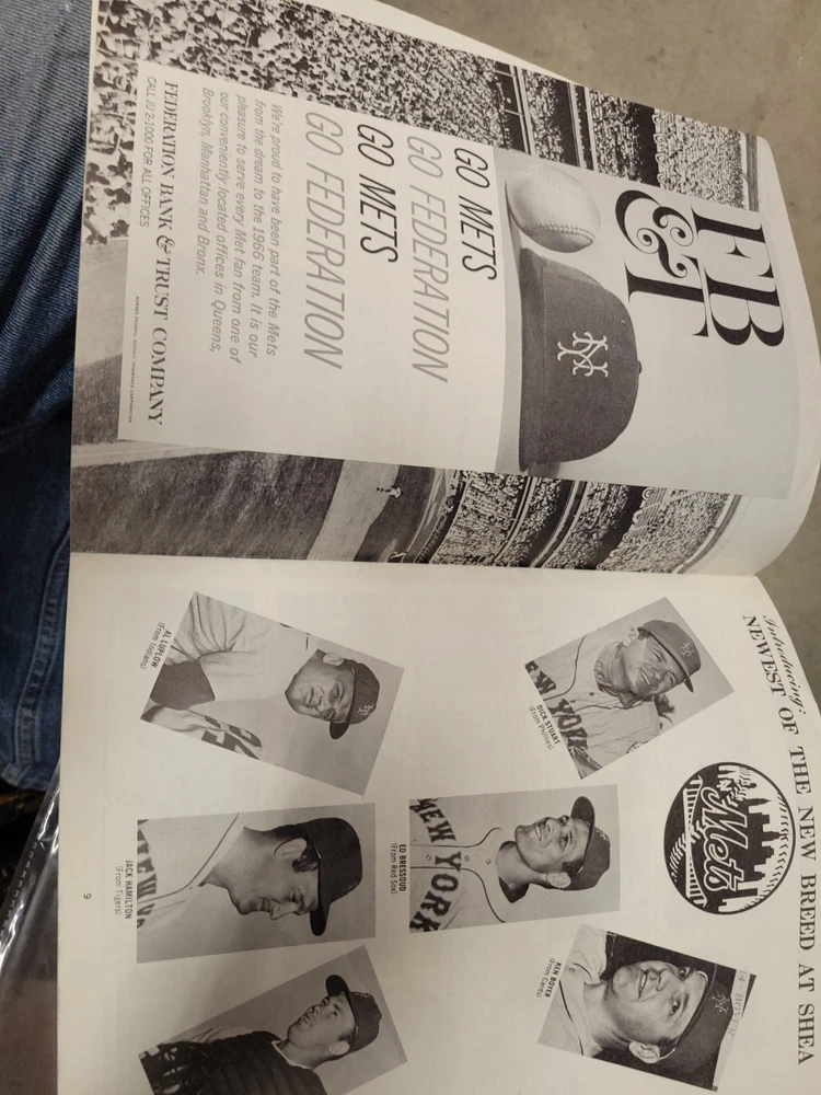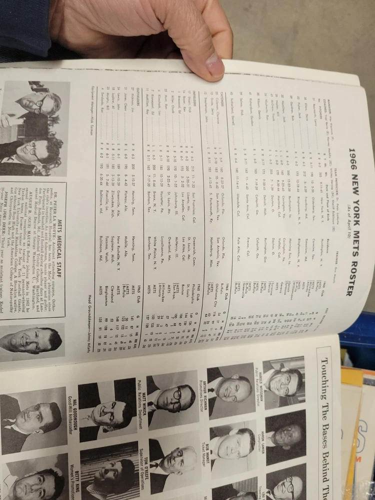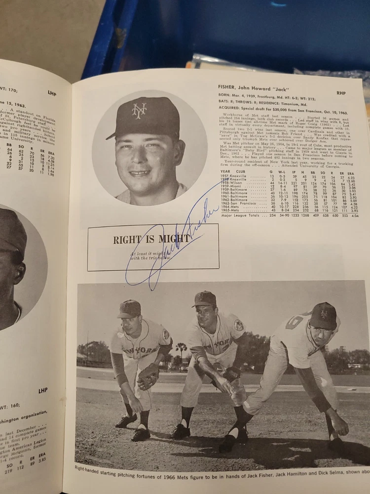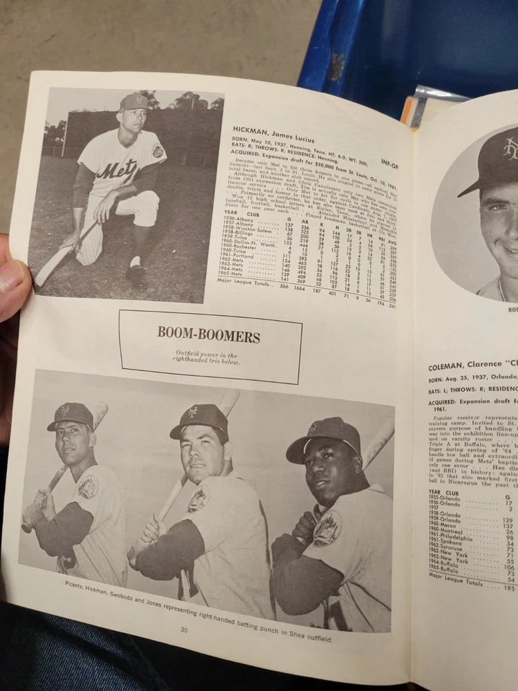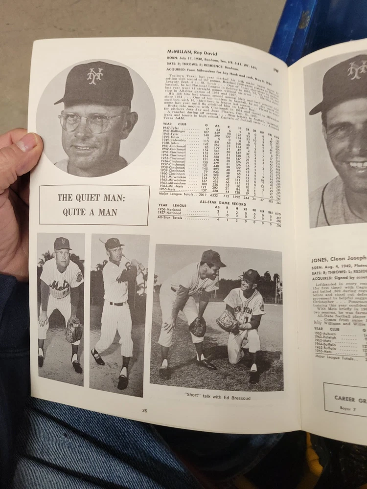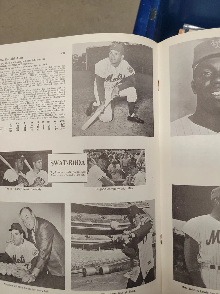 The product is a 1966 New York Mets yearbook that is signed by players including Jones, Swoboda, and Rockie. This vintage sports memorabilia item is an original publication licensed by the team and features a nostalgic look at the baseball team from that era. Perfect for collectors or fans of the New York Mets, this unique piece offers a glimpse into the history of the team and the players who signed it.