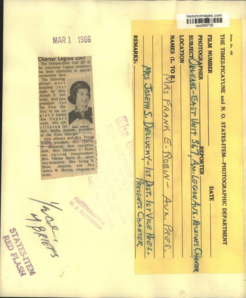 ebay template Note: Please study the images carefully to determine the condition of this vintage photograph, as it may not be in perfect condition. It may contain wrinkles, cracks, and possibly even tears due to its age and how it was handled before it got to us. A scanner may interpret colors and contrast differently than human eyes will, so it is possible that the actual photograph may be slightly darker or lighter in person. This vintage photograph is offered for sale as a collectible item and conveys no transfer of copyright. 1966 Press Photo American Legion Auxiliary president and first vice-president This is an original press photo. The Orleans-East Unit 367 of the American Legion Auxiliary has been chartered in special ceremonies here. The following officers were installed last night by Mrs. Joseph S. Dellucky, first vice-president for the First District of the Legion's Louisiana Department, who substituted for Mrs. Melba Aquada, president of the First District. New officers are Mrs. Frank Robin president; Mrs. Charles P. Johansen, first vice-president; Mrs. Houston J. Peterson, second vice-president; Mrs. Vernon Barre Sr., secretary-treasurer; Mrs. Irving R. Sison, chaplain, and Mrs. James W. Murray, sergeant-at-arms.Photo measures 9.75 x 8inches. Photo is dated 03-01-1966. PHOTO FRONT PHOTO BACK Historic Images Part Number: noo59735 Sell Smarter with Kyozou. Inventory and Ecommerce Management