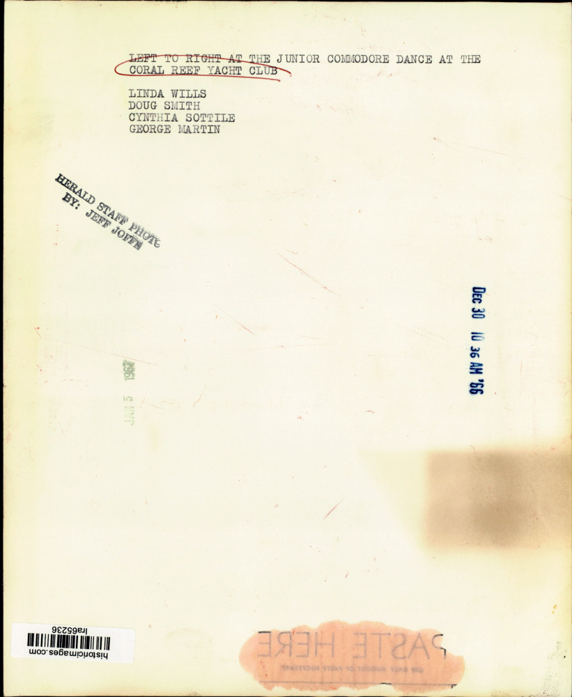 ebay template Note: Please study the images carefully to determine the condition of this vintage photograph, as it may not be in perfect condition. It may contain wrinkles, cracks, and possibly even tears due to its age and how it was handled before it got to us. A scanner may interpret colors and contrast differently than human eyes will, so it is possible that the actual photograph may be slightly darker or lighter in person. This vintage photograph is offered for sale as a collectible item and conveys no transfer of copyright. 1966 Press Photo Junior Commodore Dance at the Coral Reef Yacht Club - lra65236 This is an original press photo. Left to right at the Junior Commodore Dance at the Coral Reef Yacht Club, Linda Wills, Doug Smith, Cynthia Sottile, George MartinPhoto measures 10 x 8.25inches. Photo is dated 12-30-1966. PHOTO FRONT PHOTO BACK Historic Images Part Number: lra65236 FAQs Q: Can I just download a digital version instead? A: No, we sell only vintage originals and do not make or distribute any copies, including digital ones. Q: Do you combine shipping and invoices? A: Multiple photos won on the same seller ID combine automatically through the eBay checkout process. If you encounter problems with this, send us a message via eBay messaging and we will send you an invoice. Due to eBay limitations, we cannot combine items won on our different seller IDs for a single shipping charge. Q: How quickly do you ship the items once paid? A: We ship within one business day after your payment clears. If you do not receive an "order shipped" email from us by the close of the second business day from submitting payment, please e-mail us via eBay messaging. Q: How do you make sure my photograph arrives safely? A: We package each order between two cross-corrugated pieces of cardboard to ensure that the package is as difficult to bend as possible. We then wrap each order in a plastic sheet to help protect against moisture. We want you to rest assured that we take every precaution to ensure that the photograph you receive will be in the same condition in your care as it was in ours. Q: Will the "Historic Images" watermark be on my photo when I receive it? A: No. This is a digital watermark we use to protect our images. It is not printed on the photo. Q: What are your office hours? A: eBay for us is a business, and a very fun one to be in! We are open M-F 9 to 5 (CST). Therefore, we do not return e-mails and phone calls over the weekend. We observe the following holidays: New Years Day, Memorial Day, Fourth of July, Labor Day, Thanksgiving and the day after Thanksgiving, Christmas Eve and Christmas Day. Q: Where did all these vintage photos come from? A: These original vintage photographs are from various news service and newspaper photo archives from locations around the country including: Boston, Detroit, Tampa, Chicago, Denver, Seattle, New Orleans, Milwaukee, Portland, Spokane, and more. We do not copy or reproduce any photographs -- every item is a unique vintage piece that was housed in a news archive. Q: Can I use this photograph in my book/blog/website? A: The short answer is no. There is no transfer of copyright for republication or reproduction with these photographs when you purchase them, and only photographs taken before 1923 are currently automatically in the public domain. Permission from the copyright holder, which usually can be identified from the back of each photo, must be sought to republish or reproduce the image for any purpose. Q: Do you relist items (in case I miss an auction ending)? A: Auction items that receive no bids are relisted in our store (historicimages-store on eBay) as a fixed-price item and at a higher price than the starting auction price. Q: Do you leave feedback? A: Yes, we always leave feedback for buyers. Our software monitors when our buyers leave us feedback, then notifies us that we can leave feedback for the buyer. Rest assured, if you leave feedback, we will do the same! Check out our family of eBay IDs: historicimages01 Sports Photos historicimages02 Entertainment Photos historicimages03 Americana Photos historicimages04 International & War Photos historicimages05 Transportation Photos historicimages06 Photos of All Subjects historicimages07 Entertainment Photos historicimages08 Newsworthy Photos historicimages09 Entertainment Photos historicimages10 Sports Photos historicimages-store Our largest fixed-price selection historicimages-gallery Hand-picked photos Saturday night auctions About Us Historic Images was formed in September 2009, with a handful of scanners working out of a basement to digitize newspaper photo archives. We have since moved out of the basement, and we can now archive thousands of photos per day. Our company has worked with magazines and newspapers from Detroit, Boston, Denver, Seattle, Tampa, Chicago, and New Orleans, just to name a few. We are constantly adding to our inventory, and have assembled an archive of millions of photos to date. As our company evolved, we began our eBay business, which brings thousands of fresh auctions per week to the world's largest online auction marketplace. Our custom software systems and team of great employees allow us to efficiently scan and sell large photo archives online. At the very core of our company's DNA is a strong commitment to customer satisfaction and strict integrity for our product. Our promise to you is that we will do everything in our power to provide you a great buying experience. Copyright 2009 - Present, Historic Images, Inc. Sell Smarter with Kyozou. Inventory and Ecommerce Management