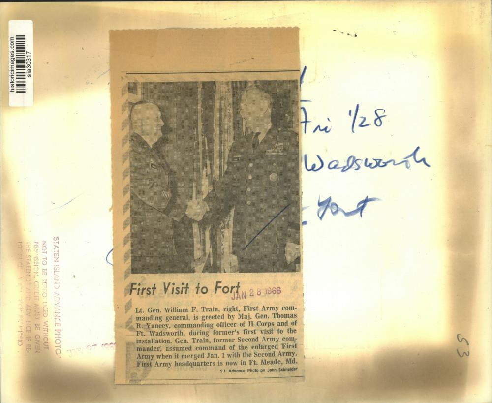 ebay template Note: Please study the images carefully to determine the condition of this vintage photograph, as it may not be in perfect condition. It may contain wrinkles, cracks, and possibly even tears due to its age and how it was handled before it got to us. A scanner may interpret colors and contrast differently than human eyes will, so it is possible that the actual photograph may be slightly darker or lighter in person. This vintage photograph is offered for sale as a collectible item and conveys no transfer of copyright. 1966 Press Photo Lt. Gen. William F. Train greeted by Maj. Gen. Thomas R. Yancey This is an original press photo. Lt. General William F. Train, right, First Army commanding general, is greeted by Maj. General Thomas R. Yancey, commanding officer of II Corps and of Ft. Wadsworth, during the former's first visit to the installation. General Train, former Second Army commander, assumed command of the enlarged First Army when it merged January 1 with the Second Army. First Army headquarters is now in Fort Meade, MarylandPhoto measures 10 x 8.25inches. Photo is dated 01-28-1966. PHOTO FRONT PHOTO BACK Historic Images Part Number: sia30317 FAQs Q: Can I just download a digital version instead? A: No, we sell only vintage originals and do not make or distribute any copies, including digital ones. Q: Do you combine shipping and invoices? A: Multiple photos won on the same seller ID combine automatically through the eBay checkout process. If you encounter problems with this, send us a message via eBay messaging and we will send you an invoice. Due to eBay limitations, we cannot combine items won on our different seller IDs for a single shipping charge. Q: How quickly do you ship the items once paid? A: We ship within one business day after your payment clears. If you do not receive an "order shipped" email from us by the close of the second business day from submitting payment, please e-mail us via eBay messaging. Q: How do you make sure my photograph arrives safely? A: We package each order between two cross-corrugated pieces of cardboard to ensure that the package is as difficult to bend as possible. We then wrap each order in a plastic sheet to help protect against moisture. We want you to rest assured that we take every precaution to ensure that the photograph you receive will be in the same condition in your care as it was in ours. Q: Will the "Historic Images" watermark be on my photo when I receive it? A: No. This is a digital watermark we use to protect our images. It is not printed on the photo. Q: What are your office hours? A: eBay for us is a business, and a very fun one to be in! We are open M-F 9 to 5 (CST). Therefore, we do not return e-mails and phone calls over the weekend. We observe the following holidays: New Years Day, Memorial Day, Fourth of July, Labor Day, Thanksgiving and the day after Thanksgiving, Christmas Eve and Christmas Day. Q: Where did all these vintage photos come from? A: These original vintage photographs are from various news service and newspaper photo archives from locations around the country including: Boston, Detroit, Tampa, Chicago, Denver, Seattle, New Orleans, Milwaukee, Portland, Spokane, and more. We do not copy or reproduce any photographs -- every item is a unique vintage piece that was housed in a news archive. Q: Can I use this photograph in my book/blog/website? A: The short answer is no. There is no transfer of copyright for republication or reproduction with these photographs when you purchase them, and only photographs taken before 1923 are currently automatically in the public domain. Permission from the copyright holder, which usually can be identified from the back of each photo, must be sought to republish or reproduce the image for any purpose. Q: Do you relist items (in case I miss an auction ending)? A: Auction items that receive no bids are relisted in our store (historicimages-store on eBay) as a fixed-price item and at a higher price than the starting auction price. Q: Do you leave feedback? A: Yes, we always leave feedback for buyers. Our software monitors when our buyers leave us feedback, then notifies us that we can leave feedback for the buyer. Rest assured, if you leave feedback, we will do the same! Check out our family of eBay IDs: historicimages01 Sports Photos historicimages02 Entertainment Photos historicimages03 Americana Photos historicimages04 International & War Photos historicimages05 Transportation Photos historicimages06 Photos of All Subjects historicimages07 Entertainment Photos historicimages08 Newsworthy Photos historicimages09 Entertainment Photos historicimages10 Sports Photos historicimages-store Our largest fixed-price selection historicimages-gallery Hand-picked photos Saturday night auctions About Us Historic Images was formed in September 2009, with a handful of scanners working out of a basement to digitize newspaper photo archives. We have since moved out of the basement, and we can now archive thousands of photos per day. Our company has worked with magazines and newspapers from Detroit, Boston, Denver, Seattle, Tampa, Chicago, and New Orleans, just to name a few. We are constantly adding to our inventory, and have assembled an archive of millions of photos to date. As our company evolved, we began our eBay business, which brings thousands of fresh auctions per week to the world's largest online auction marketplace. Our custom software systems and team of great employees allow us to efficiently scan and sell large photo archives online. At the very core of our company's DNA is a strong commitment to customer satisfaction and strict integrity for our product. Our promise to you is that we will do everything in our power to provide you a great buying experience. Copyright 2009 - Present, Historic Images, Inc. Sell Smarter with Kyozou. Inventory and Ecommerce Management