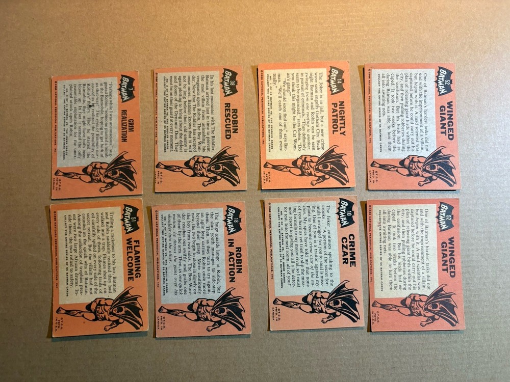 The product is a lot of 8 original 1966 Topps Batman Black Bat cards from the National Periodical series. These standard-sized trading cards feature Batman and are made of card stock. They are part of the Batman franchise and are from the TV show "Batman and Robin." The vintage cards are not autographed and are in English language, manufactured by Topps. This lot is a great addition to any Batman or vintage trading card collection for fans of the iconic superhero.