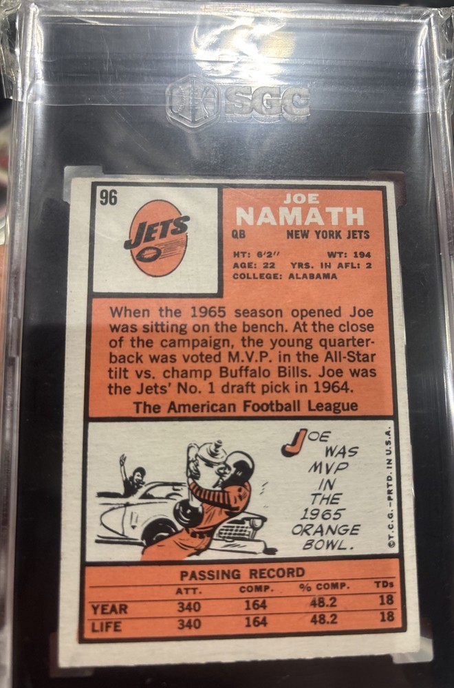 The product is a 1966 Topps Joe Namath SGC 5.5 rookie trading card. This card features Joe Namath, a legendary football player, during his rookie season in 1966. Manufactured by Topps, a well-known trading card maker, this card is a valuable collectible for fans and collectors of football memorabilia. The card is likely to be in good condition and highly sought after by enthusiasts of vintage sports trading cards.