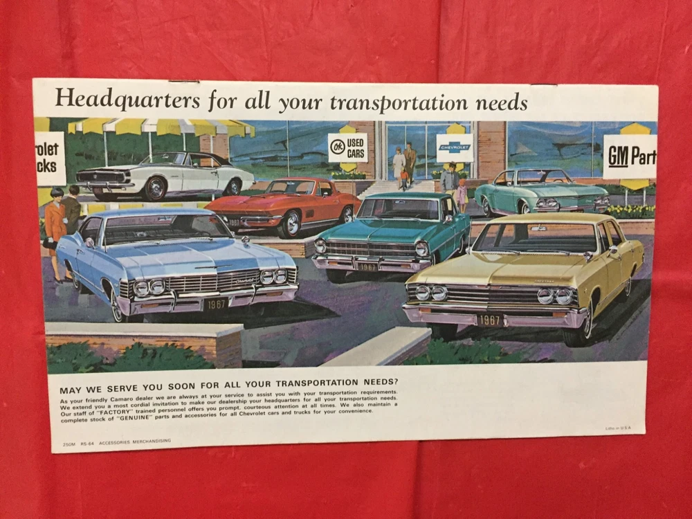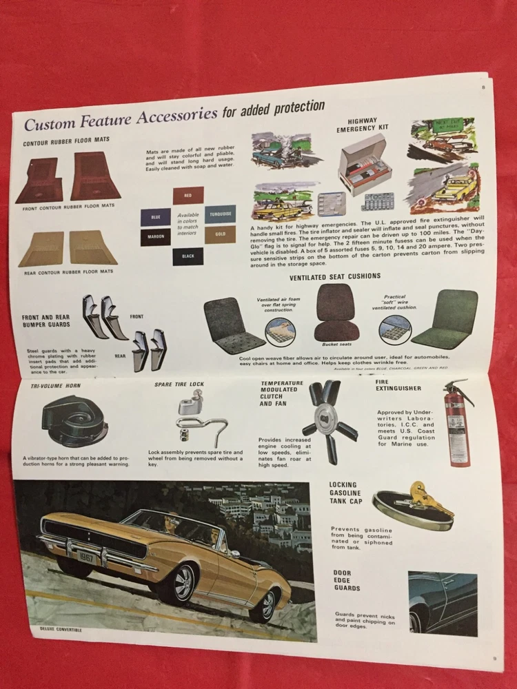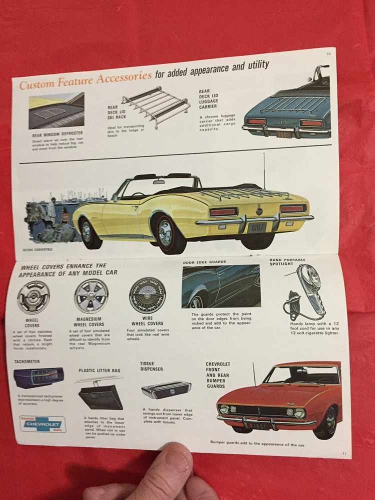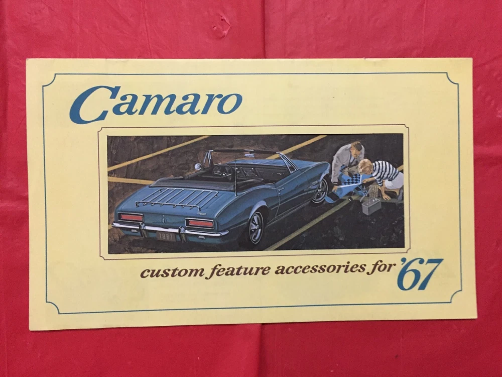 ITEM:::: This Listing is for an original 1967 CHEVROLET "CAMARO CUSTOM FEATURE ACCESSORIES" Car Dealer Sales Brochure ....... DIMENSIONS:::: About 10 3/8 by 6 1/4 inches and there are 12 pages with covers ...... CONDITION:::: The general overall condition is mostly VG... .. .. (Please refer to pictures & e-mail for details). ......... ABREVIATIONS:::: E=Excellent with no issues..... VG = Very Good with very lite issues..... G/VG = Good to Very Good with lite issues..... G + = Good+ with lite to moderate issues..... G = Good with moderate issues..... G - = Good- with moderate+ issues..... F/G = Fair to Good with quite a few issues..... F = Fair with many issues..... P = Poor with lots of issues..... Please let the pictures help you decide condition because they are an integral part of the description! Please e-mail with questions...... I will combine shipping & you will only pay $6.98 for shipping no matter how many items you accumulate! You can take up to 30 days to accumulate Items for combined shipping. Please drop me a note after your 1st win letting me know that you intend to wait to pay so that you can take advantage of combined shipping...... I will ship your Package to the address that you have registered on EBAY---Ergo, I will ship to the address that is on the shipping label when I print it from EBAY---Please do not ask me to ship to any other address---I will not do it! My goal is 100% satisfaction! I will refund 100% of your costs if you are not satisfied! Thanks for visiting!
