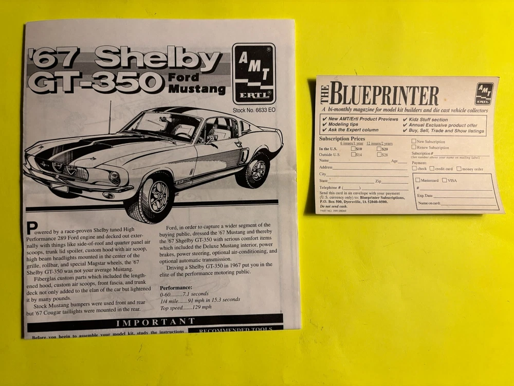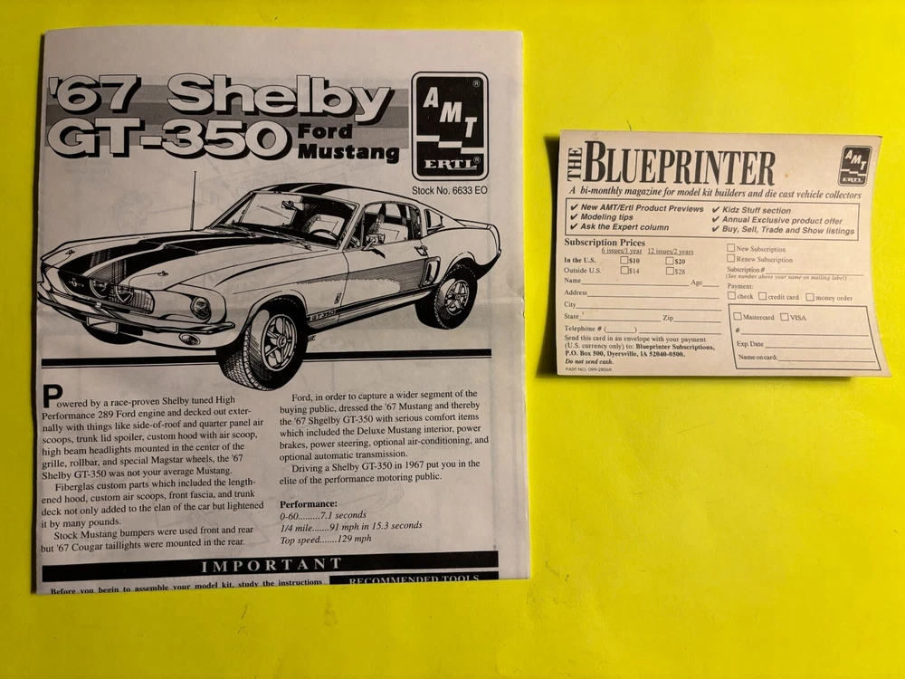 HERES A GREAT MODEL KIT FROM AMT ERTL MODELS !! ITS A 1967 FORD MUSTANG SHELBY GT-350 IN 1/25 SCALE !! KIT HAS BEEN OPENED BUT EVERYTHING IS STILL NEW AND SEALED INSIDE !! CHECK THE PICTURES WHAT YOU SEE IS WHAT YOULL GET !! BUYER PAYS 13.50 FOR USPS SHIPPING IN THE USA ONLY!!TRANSACTION MUST BE COMPLETE AT AUCTION END.I ACCEPT PAYMENTS THROUGH EBAY ONLY!! THANKS FOR LOOKING!! I DO COMBINE SHIPPING SO PLEASE CHECK MY OTHER ITEMS!! IF YOU DONT LIKE MY PRICES MAKE ME AN OFFER!! THE WORST I CAN DO IS SAY NO