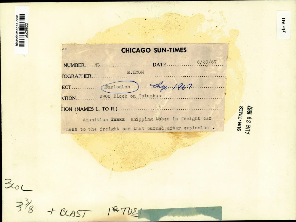 ebay template Note: Please study the images carefully to determine the condition of this vintage photograph, as it may not be in perfect condition. It may contain wrinkles, cracks, and possibly even tears due to its age and how it was handled before it got to us. A scanner may interpret colors and contrast differently than human eyes will, so it is possible that the actual photograph may be slightly darker or lighter in person. This vintage photograph is offered for sale as a collectible item and conveys no transfer of copyright. 1967 Press Photo Ammunition Next To Train Car That Exploded In Chicago, Illinois This is an original press photo. Explosion, Chicago. 2900 Block on Columbus. Ammunition shipping tubes in freight car next to the freight car that burned after explosion. Blast. Photo is dated 08/28/1967. Photo measures 10.5 x 7.75 inches.. PHOTO FRONT PHOTO BACK Historic Images Part Number: afa28822 FAQs Q: Can I just download a digital version instead? A: No, we sell only vintage originals and do not make or distribute any copies, including digital ones. Q: Do you combine shipping and invoices? A: Multiple photos won on the same seller ID combine automatically through the eBay checkout process. If you encounter problems with this, send us a message via eBay messaging and we will send you an invoice. Due to eBay limitations, we cannot combine items won on our different seller IDs for a single shipping charge. Q: How quickly do you ship the items once paid? A: We ship within one business day after your payment clears. If you do not receive an "order shipped" email from us by the close of the second business day from submitting payment, please e-mail us via eBay messaging. Q: How do you make sure my photograph arrives safely? A: We package each order between two cross-corrugated pieces of cardboard to ensure that the package is as difficult to bend as possible. We then wrap each order in a plastic sheet to help protect against moisture. We want you to rest assured that we take every precaution to ensure that the photograph you receive will be in the same condition in your care as it was in ours. Q: Will the "Historic Images" watermark be on my photo when I receive it? A: No. This is a digital watermark we use to protect our images. It is not printed on the photo. Q: What are your office hours? A: eBay for us is a business, and a very fun one to be in! We are open M-F 9 to 5 (CST). Therefore, we do not return e-mails and phone calls over the weekend. We observe the following holidays: New Years Day, Memorial Day, Fourth of July, Labor Day, Thanksgiving and the day after Thanksgiving, Christmas Eve and Christmas Day. Q: Where did all these vintage photos come from? A: These original vintage photographs are from various news service and newspaper photo archives from locations around the country including: Boston, Detroit, Tampa, Chicago, Denver, Seattle, New Orleans, Milwaukee, Portland, Spokane, and more. We do not copy or reproduce any photographs -- every item is a unique vintage piece that was housed in a news archive. Q: Can I use this photograph in my book/blog/website? A: The short answer is no. There is no transfer of copyright for republication or reproduction with these photographs when you purchase them, and only photographs taken before 1923 are currently automatically in the public domain. Permission from the copyright holder, which usually can be identified from the back of each photo, must be sought to republish or reproduce the image for any purpose. Q: Do you relist items (in case I miss an auction ending)? A: Auction items that receive no bids are relisted in our store (historicimages-store on eBay) as a fixed-price item and at a higher price than the starting auction price. Q: Do you leave feedback? A: Yes, we always leave feedback for buyers. Our software monitors when our buyers leave us feedback, then notifies us that we can leave feedback for the buyer. Rest assured, if you leave feedback, we will do the same! Check out our family of eBay IDs: historicimages01 Sports Photos historicimages02 Entertainment Photos historicimages03 Americana Photos historicimages04 International & War Photos historicimages05 Transportation Photos historicimages06 Photos of All Subjects historicimages07 Entertainment Photos historicimages08 Newsworthy Photos historicimages09 Entertainment Photos historicimages10 Sports Photos historicimages-store Our largest fixed-price selection historicimages-gallery Hand-picked photos Saturday night auctions About Us Historic Images was formed in September 2009, with a handful of scanners working out of a basement to digitize newspaper photo archives. We have since moved out of the basement, and we can now archive thousands of photos per day. Our company has worked with magazines and newspapers from Detroit, Boston, Denver, Seattle, Tampa, Chicago, and New Orleans, just to name a few. We are constantly adding to our inventory, and have assembled an archive of millions of photos to date. As our company evolved, we began our eBay business, which brings thousands of fresh auctions per week to the world's largest online auction marketplace. Our custom software systems and team of great employees allow us to efficiently scan and sell large photo archives online. At the very core of our company's DNA is a strong commitment to customer satisfaction and strict integrity for our product. Our promise to you is that we will do everything in our power to provide you a great buying experience. Copyright 2009 - Present, Historic Images, Inc. Sell Smarter with Kyozou. Inventory and Ecommerce Management