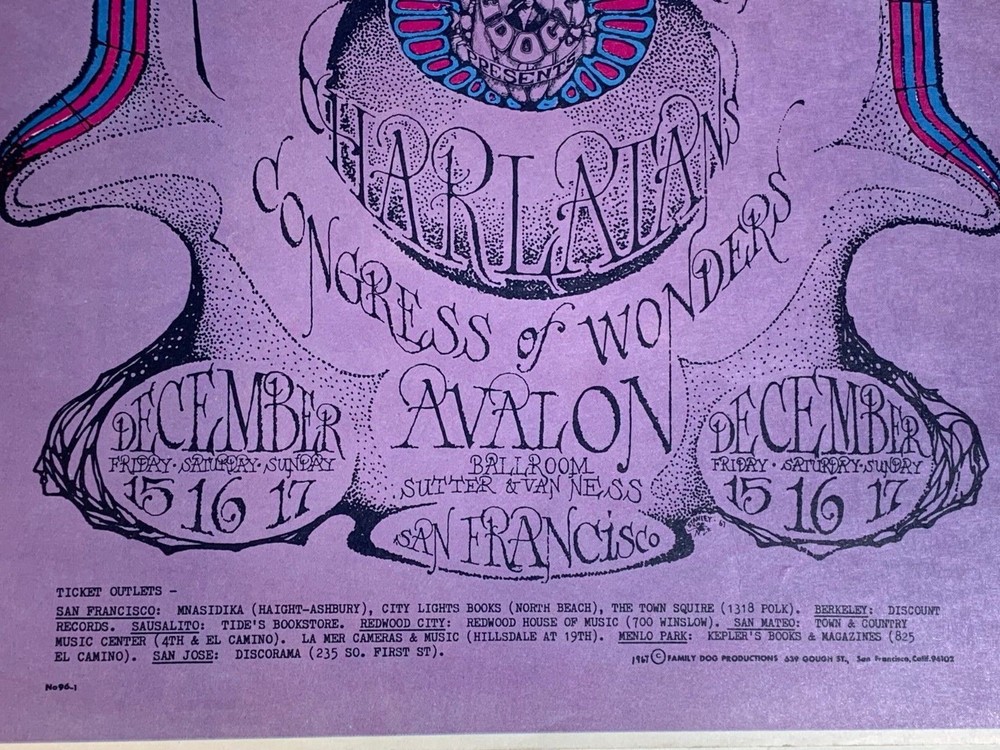 FAMILY DOG FD-96 AVALON BALLROOM A RARE Rock & Roll Item! VINTAGE RARE POSTER* *FROM CENTRAL CALIFORNIA Condition: NO TACK HOLES, CRISP, NEVER CIRCULATED! HIDDEN FOR DECADES! READY FOR YOUR ROCK COLLECTION! Size: Approximately 11 x 20 Inches Will come Securely Packaged $9.95 Priority Shipping in the U.S. $19.95 1st Class Shipping to Canada $24.95 1st Class Worldwide Shipping **WILL COMBINE SHIPPING We have other Rock Items up, please check them out! Thanks for looking, GPHWHEELS