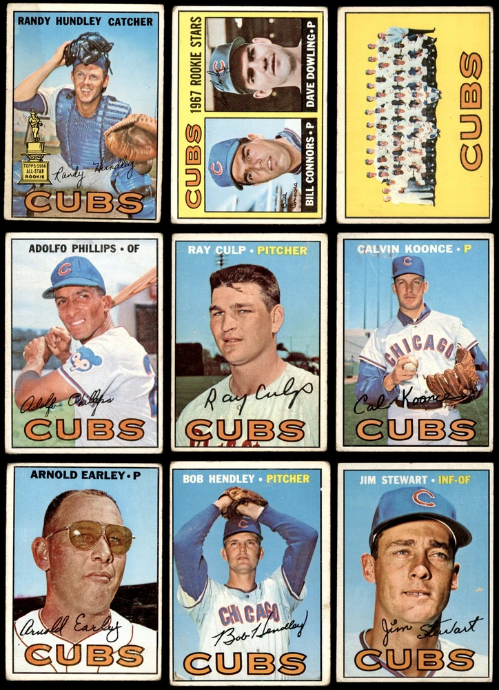 This set contains the following cards 1967 Topps #16 Bill Hands 2 - GOOD Front Back 1967 Topps #39 Curt Simmons 1 - POOR Front Back 1967 Topps #70 Ron Santo 2 - GOOD Front Back 1967 Topps #87 George Altman 1 - POOR Front Back 1967 Topps #106 Randy Hundley 1 - POOR Front Back 1967 Topps #124 Jimmy Stewart 2 - GOOD Front Back 1967 Topps #148 Adolfo Phillips 1.5 - FAIR Front Back 1967 Topps #168 Ray Culp 1 - POOR Front Back 1967 Topps #171 Cal Koonce 1.5 - FAIR Front Back 1967 Topps #185 Ken Holtzman 2 - GOOD Front Back 1967 Topps #215 Ernie Banks 3 - VG Front Back 1967 Topps #256 Bob Hendley 1 - POOR Front Back 1967 Topps #272 - Bill Connors / Dave Dowling Cubs Rookies 1 - POOR Front Back 1967 Topps #296 Glenn Beckert 2 - GOOD Front Back 1967 Topps #315 Billy Williams 3.5 - VG+ Front Back 1967 Topps #333 Ferguson Jenkins 2 - GOOD Front Back 1967 Topps #354 Cubs Team 1 - POOR Front Back 1967 Topps #388 Arnold Earley 1 - POOR Front Back 1967 Topps #419 Don Kessinger 3.5 - VG+ Front Back 1967 Topps #439 Byron Browne 1.5 - FAIR Front Back 1967 Topps #458 Lee Thomas 4 - VG/EX Front Back 1967 Topps #481 Leo Durocher 2 - GOOD Front Back 1967 Topps #524 Felix Mantilla 3 - VG Front Back This 1967 Topps Chicago Cubs Team Set contains the 1967 Topps Cubs baseball cards and makes a great gift for any Cubs fan. ?With an inventory of over 15,000 team sets, Dean's Cards has Team Sets & Near Team Sets for just about every team, in multiple conditions, for all sports, for most major sets issued between 1909 and 1979. The major problem in collecting 1967 Topps baseball card team sets is that the set has a lot of short-printed cards, which were printed in low quantities and are very expensive. Quite often these expensive cards are of unknown players, who had very short major league careers. For this reason, we have removed these cards, and they are not consdered as part of the standard team sets, but can be purchased seperately.
