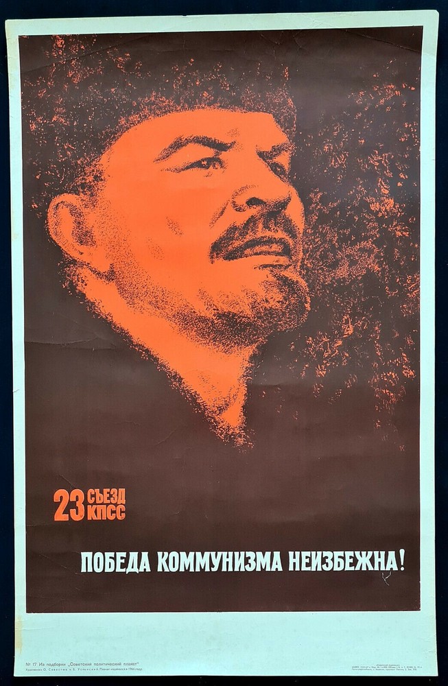 1967 Soviet Poster – 23rd CPSU Congress – The Victory of Communism is Inevitable Poster Information Poster Artist: Savostyuk O. & Uspenskiy B. Print Year: 1967 Print Run: 25,000 Language: Russian Subject: Communism Promotion Published By: "Sovetskiy Khudozhnik", Moscow Size: IN: 23 x 36 CM: 58 x 89 Condition: Flat Description & Historical Background Original Russian slogan: 23 СЪЕЗД КПСС – ПОБЕДА КОММУНИЗМА НЕИЗБЕЖНА! English translation: 23RD CONGRESS OF THE CPSU – THE VICTORY OF COMMUNISM IS INEVITABLE Issued in 1967, this bold Soviet poster commemorates the 23rd Congress of the Communist Party of the Soviet Union (CPSU). The poster declares the inevitable triumph of communism, echoing the strong ideological rhetoric of the time. Designed for display in factories, schools, and political venues across the USSR, it captures the confidence and fervor of the Brezhnev era. Style The composition reflects late Socialist Realism aesthetics—large slogans, minimalistic background, and attention-grabbing color contrast. Red and white dominate the palette, symbolizing purity of ideology and revolutionary passion. Artist Savostyuk Oleg & Uspenskiy Boris – Distinguished Soviet poster artists noted for their collaboration on political and ideological propaganda throughout the 1960s. Their works embodied the assertive tone of official Soviet messaging. Condition This poster is in flat, near to good condition with minor handling signs. Please examine images closely and feel free to request additional photos or videos. Shipped rolled in a durable archival-grade tube for safe delivery. Invest in culture: This rare visual relic of Cold War-era Soviet propaganda delivers both graphic punch and historical insight. A must-have centerpiece for collectors of ideological art or Eastern Bloc political history. PavloPosters – Where history and art meet!