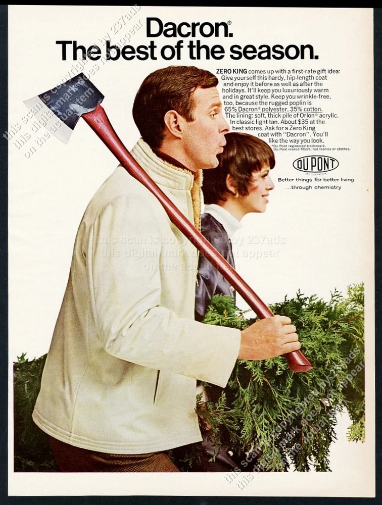 1968 axe Christmas tree couple photo Du Pont Zero King jackets vintage print ad