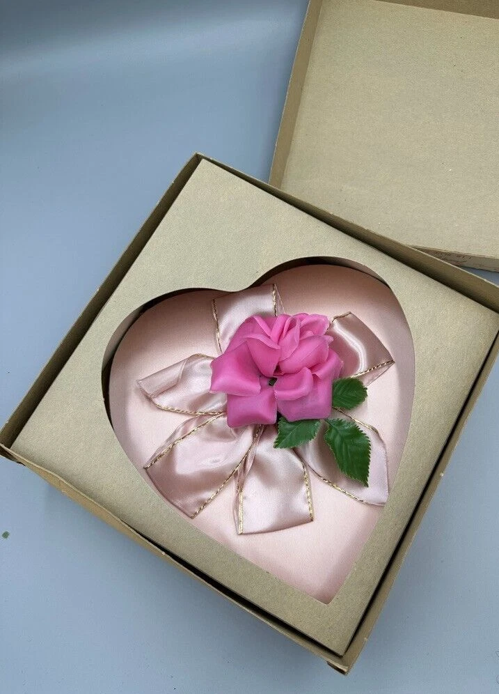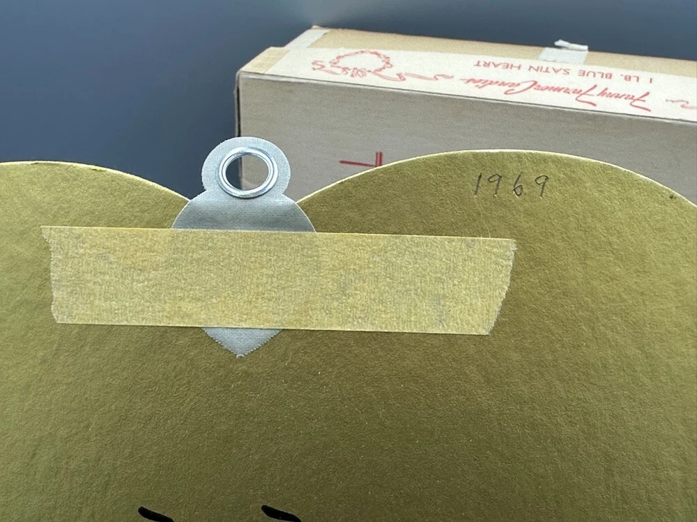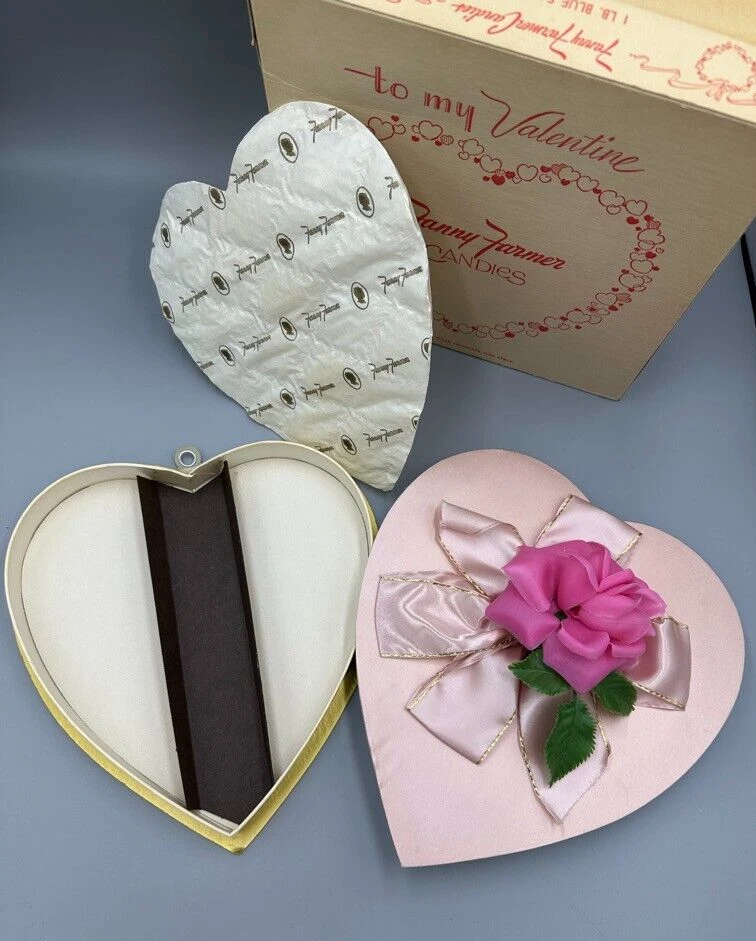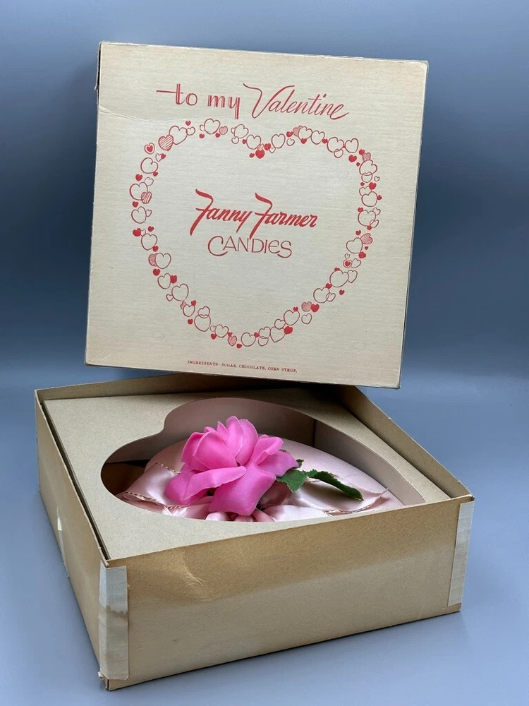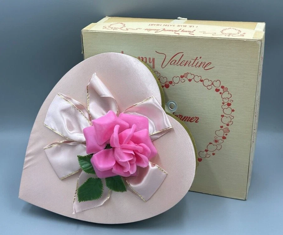 Vintage original 1969 Fanny Farmer 1 lb. pink Satin and Rose Heart Valentine chocolate candy box with outer box for blue satin heart. Heart is 9 1/4 by 10 inches. Light soil and wear. A hanger is taped to the back of the box. 1969 inked on the back of the box. The outer box was intended for a blue satin heart and contains a pink satin heart. Please see photos for condition. Guaranteed old and original.