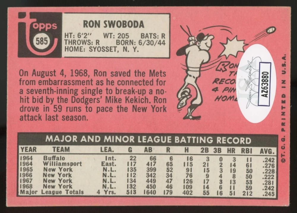 Autograph Authentication:James Spence Authentication (JSA)Year Manufactured:1969Sport:Baseballgtin13:Does not applyManufacturer:ToppsPlayer/Athlete:Ron SwobodaVintage:YesUPC:Does not applyAutographed:YesLeague:MLBTeam:New York MetsCard Number:585Card Condition:Very Good
