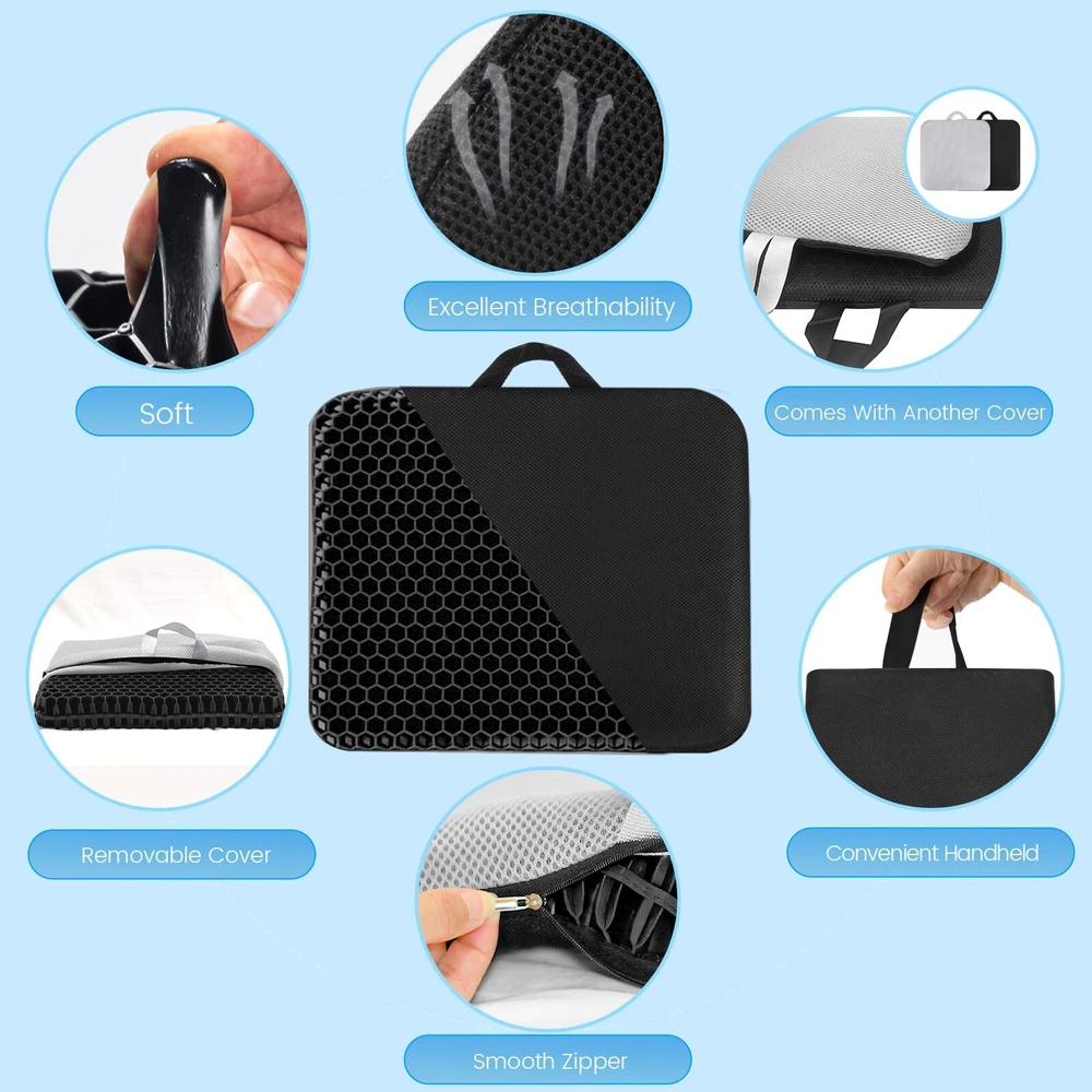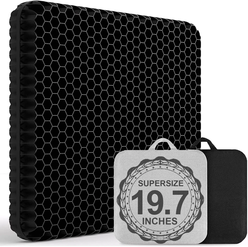🌈【EXTREMELY LARGE SIZE - 2X UPGRADING OF SEATING SURFACE】Different from the small size on the market, the size of our gel seat cushion has been increased to 19.7"x19.7"x1.77", which is equivalent to an increase of 2 times the seating area, to ensure that it can be used comfortably on any type of chair and any body shape. Extra large gel seat cushion can disperse more pressure and reduce more soreness. 🌈【PAIN AND PRESSURE RELIEF & MAGICAL CUSHIONING PROPERTIES】gel cushions for pressure sores buttocks is design to provide extremely soft support to disperses pressure and promote blood circulation, avoid discomfort caused by long time sitting. The gel pad has magical cushioning properties, even if you put the egg and sit down, the egg will not break. This is the result of a real test. If you are interested, you can also experience it with your family. 🌈【EXTRA BONUS 2ND MACHINE WASHABLE COVER】As shown in the main picture, our seat cushion comes with 2 upgraded and washable covers.The covers are designed with a smooth zipper, which facilitates the removal of the inner rubber cushion, which can better cleaned without worrying about soiling the seat. And gel cushion is different from the memory foam seat cushion. It can be washed directly with water and quickly ventilated to dry, which is convenient for storage. 🌈【GOOD BREATHABILITY AND DURABILITY COOLING SEAT CUSHION FOR LONG SITTING】The honeycomb structure gel and breathable cloth both keep the air flow to dissipate heat to let you feel cooling and comfortable, keeping your cushion cool all day. In addition, the gel material also has the characteristics of high elasticity, once it is stretched and squeezed, it immediately returns to its original shape, which has a better preformance than memory form seat cushion. 🌈【WIDELY USED】gel seat pad can be used for office chair, car seat, desk chair, wheelchair, or on outdoor patio chairs. it can also be used while bathing, swimming, boating, kayaking, kneeling while gardening, or for Pet Cushions. In addition, our oversized seat cushion also has a handle design, you can take it to Sporting Events to use on Benches.(Tips: Please put the side with non-slip dots facing down on the chair can prevent large seat cushion slipping from chair.)