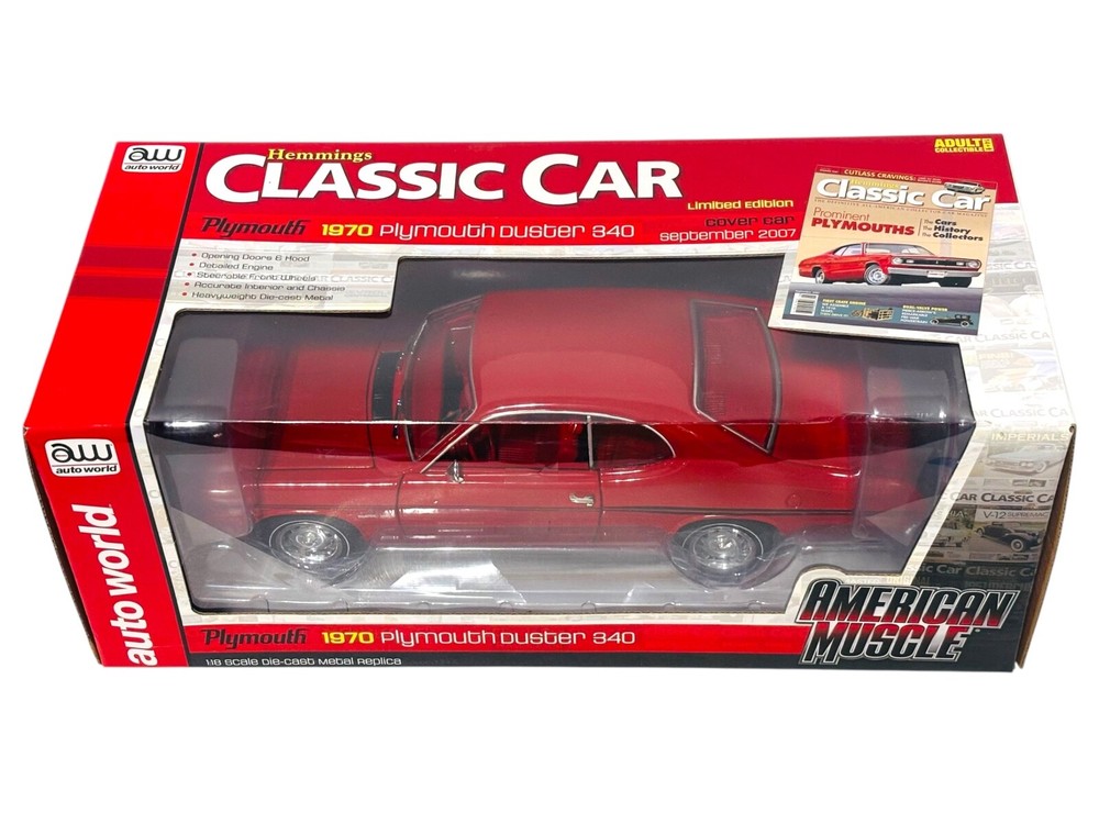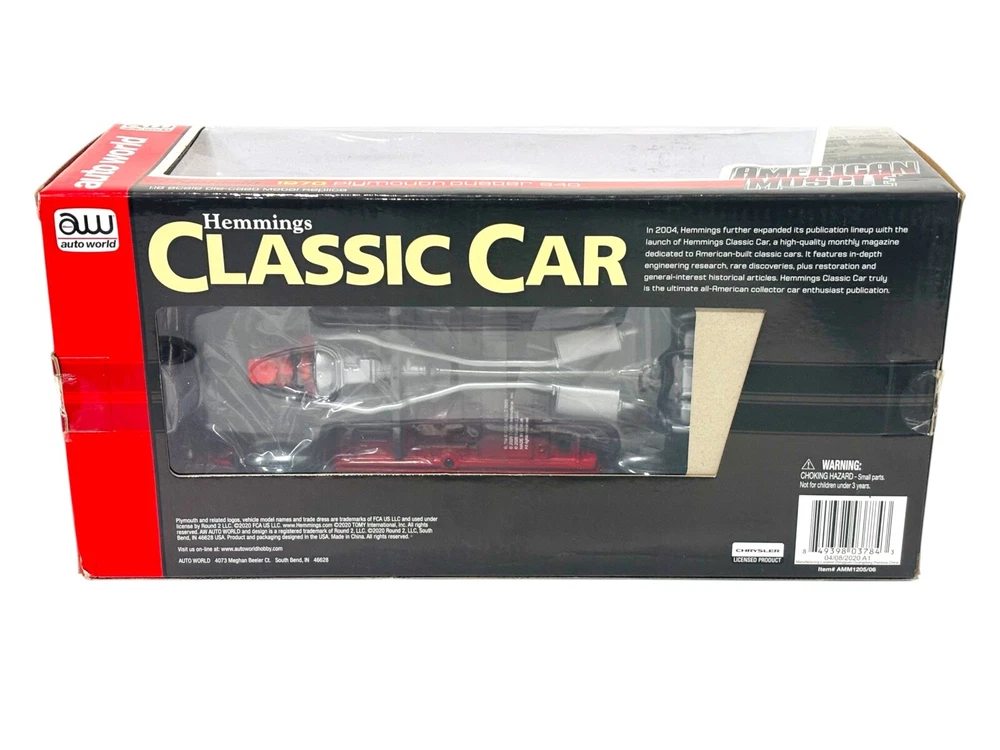 Auto World American Muscle - Hemmings Classic Cars | 1970 Plymouth Duster 340 Hardtop. 1:18 scale diecast collectible model car. This Plymouth is a 10.75"L x 4"W x 3"H diecast metal car with steerable front wheels, openable hood and doors. Featuring detailed engine, accurate interior, and chassis. This 1970 Plymouth Duster is manufactured by Auto World. Individually packed in a window box. Box size: 13.25"L x 6.1"W x 5"H. AMM1205 is in Rallye Red color. Limited Edition.