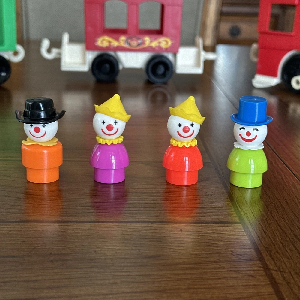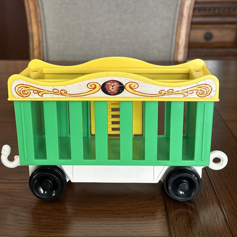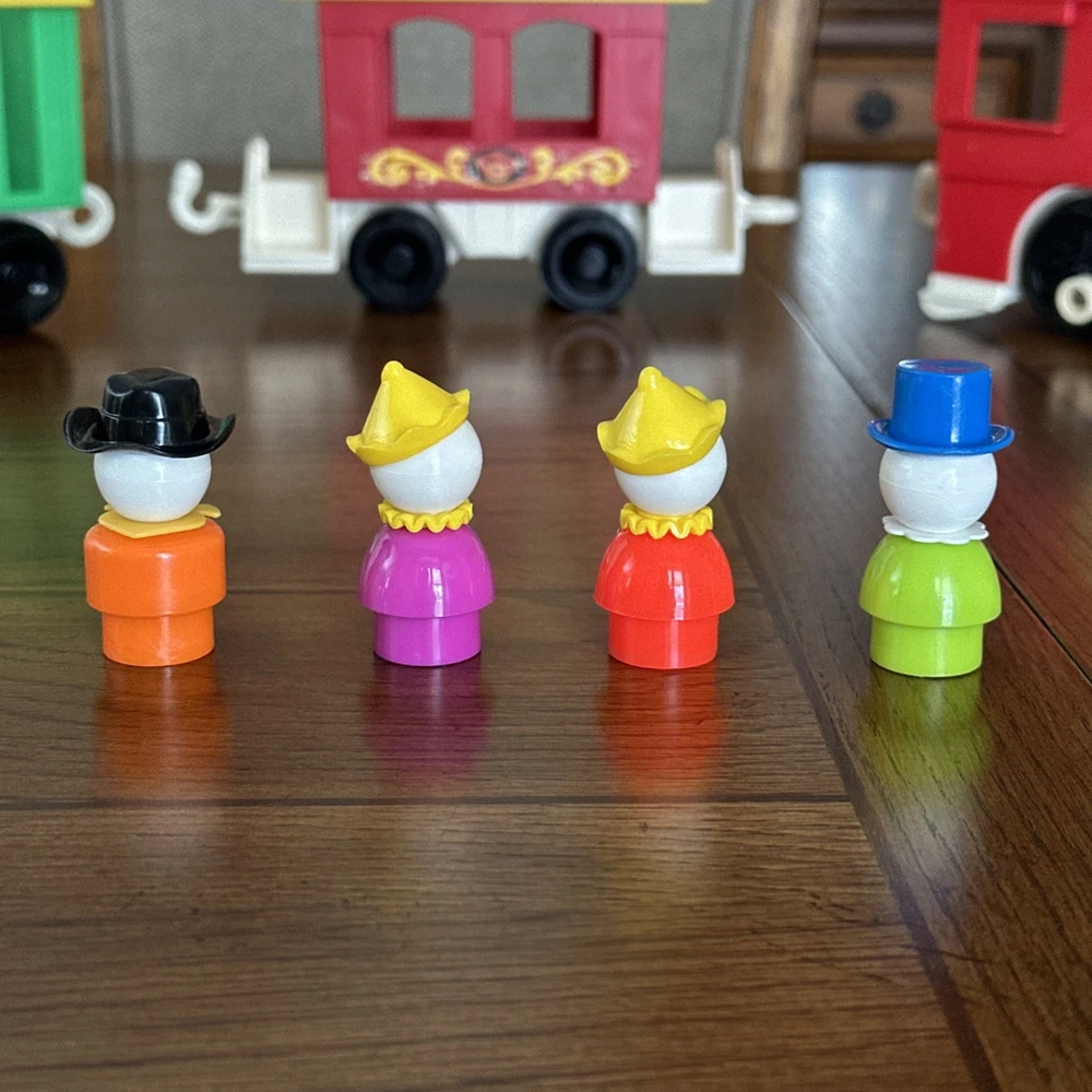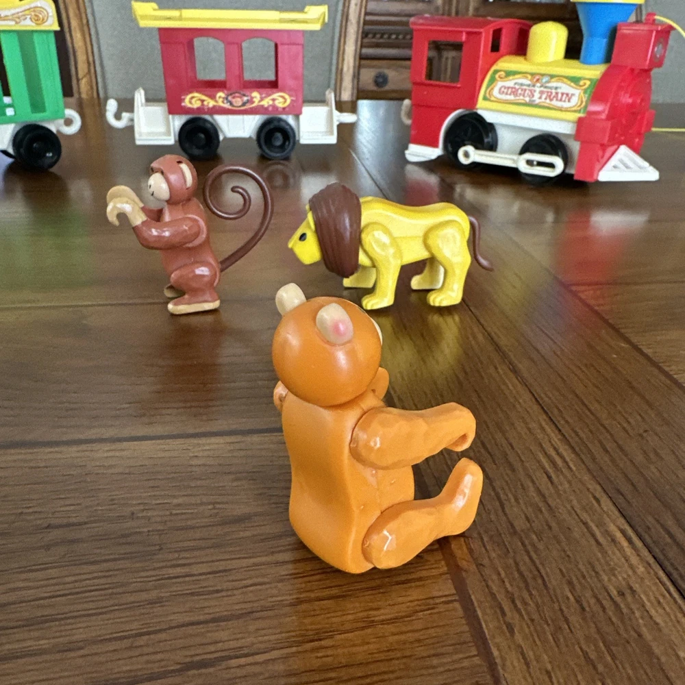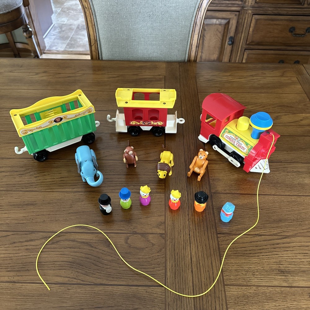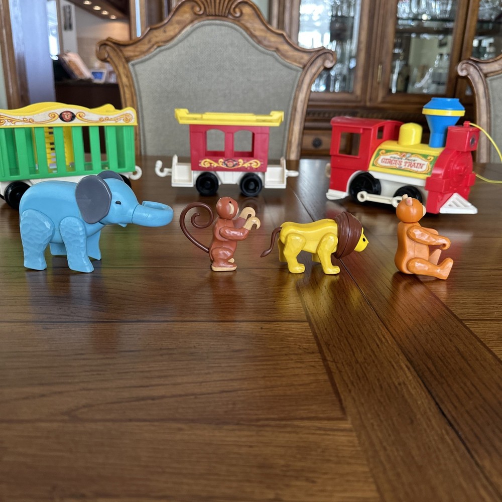 This vintage Fisher Price Little People play set is from the 1970s, featuring a Circus Train with zoo animals and circus-themed Little People. This set includes Three train cars - red engine, green cage car, red car with seats The engine car’s push down horn whistle works! Four animals - bear, monkey, lion, elephant Six people - ring master, 4 clowns, engineer The set is in great shape for its age! Notable exceptions include faded , missing, and worn stickers, rust on car metal fasteners, staining on elephant. The Little People are in excellent condition! See photos! Comes with everything in pictures.
