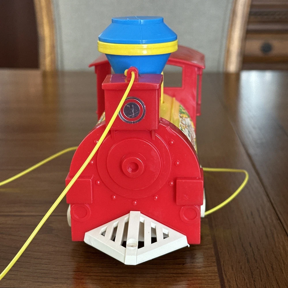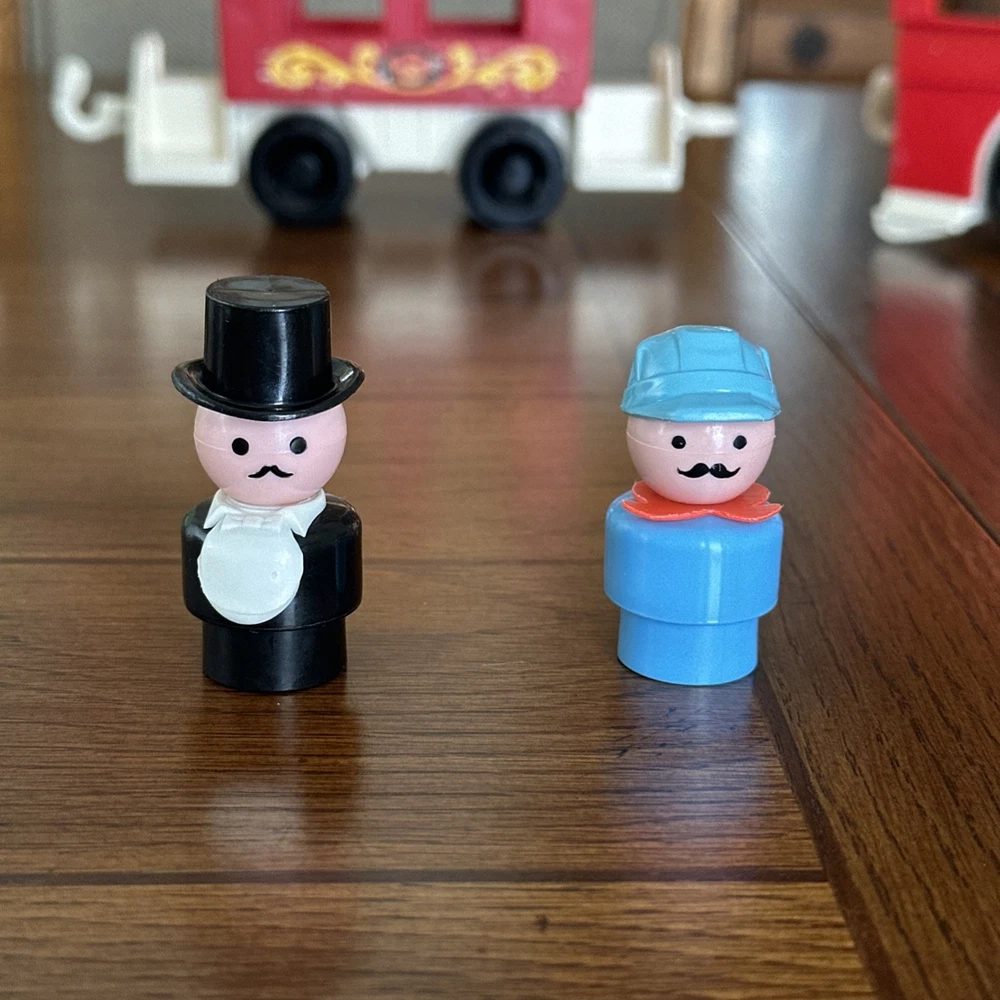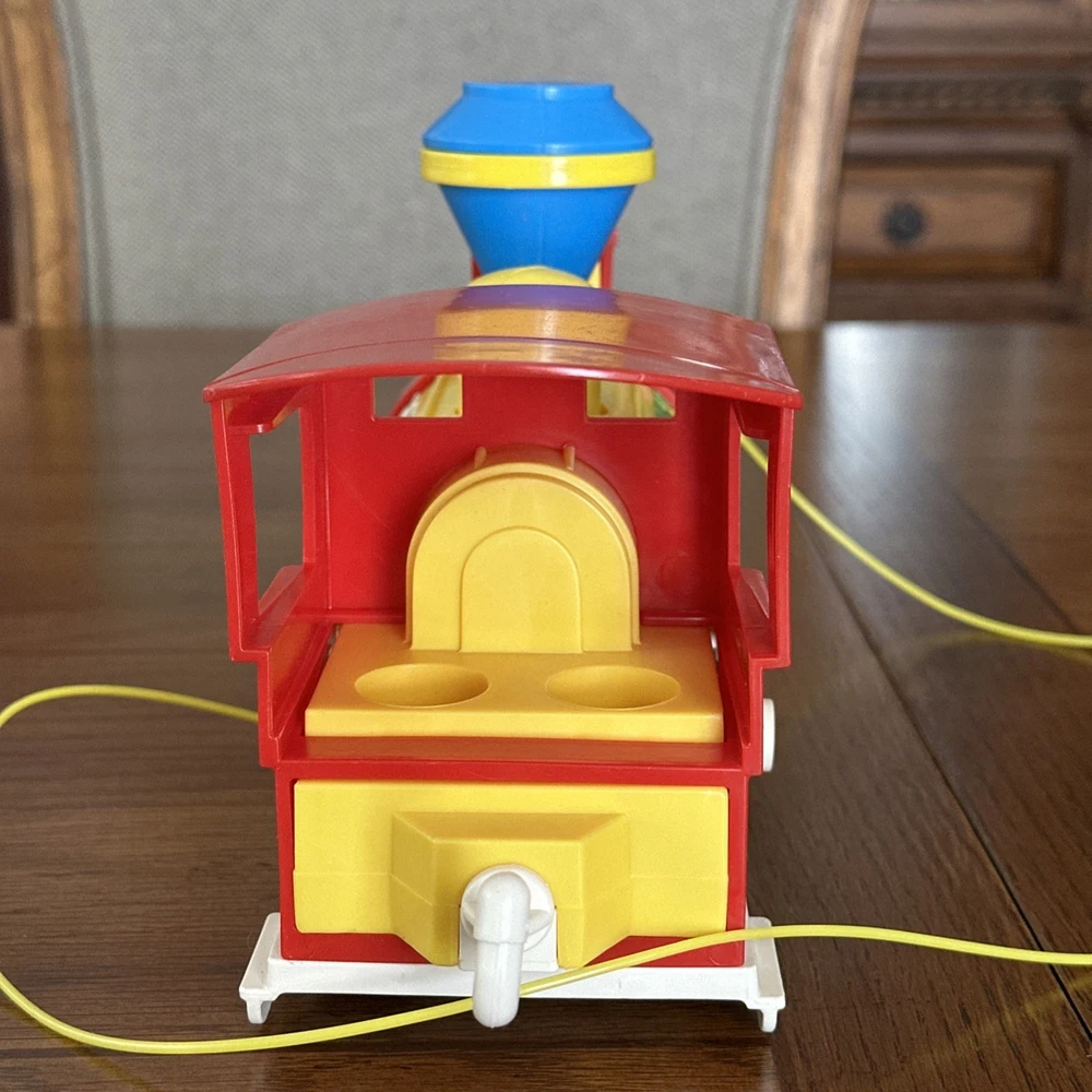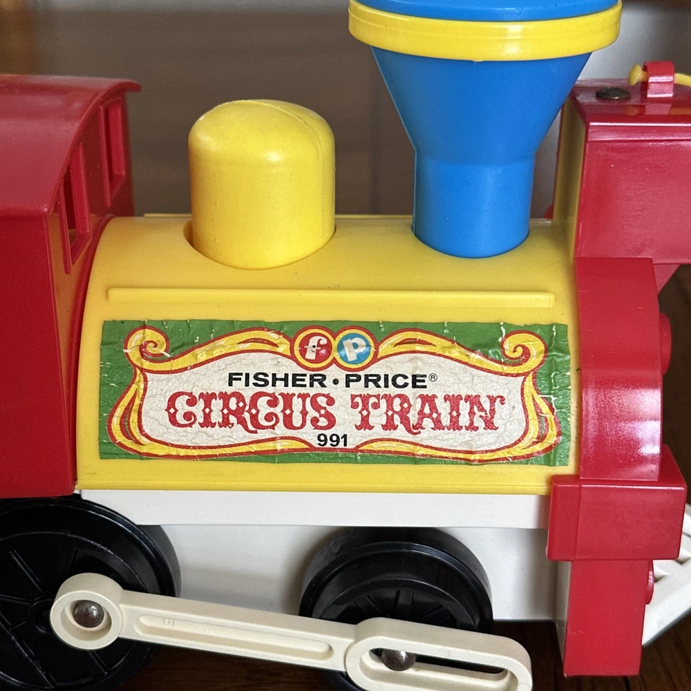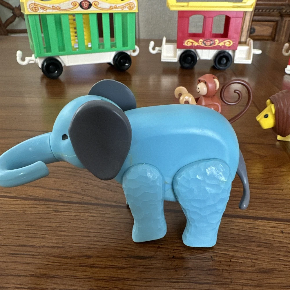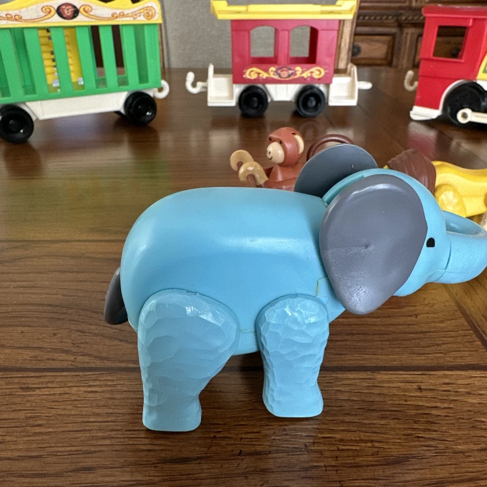 This vintage Fisher Price Little People play set is from the 1970s, featuring a Circus Train with zoo animals and circus-themed Little People. This set includes Three train cars - red engine, green cage car, red car with seats The engine car’s push down horn whistle works! Four animals - bear, monkey, lion, elephant Six people - ring master, 4 clowns, engineer The set is in great shape for its age! Notable exceptions include faded , missing, and worn stickers, rust on car metal fasteners, staining on elephant. The Little People are in excellent condition! See photos! Comes with everything in pictures.