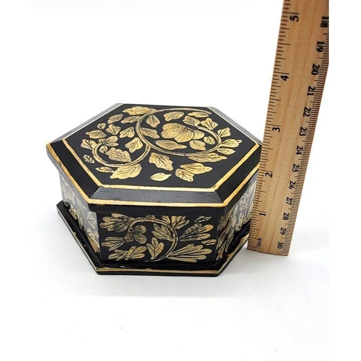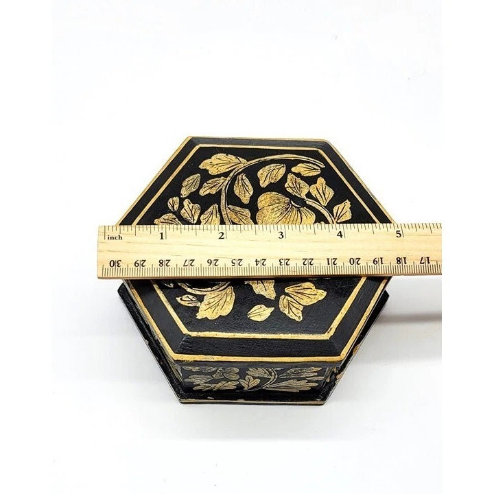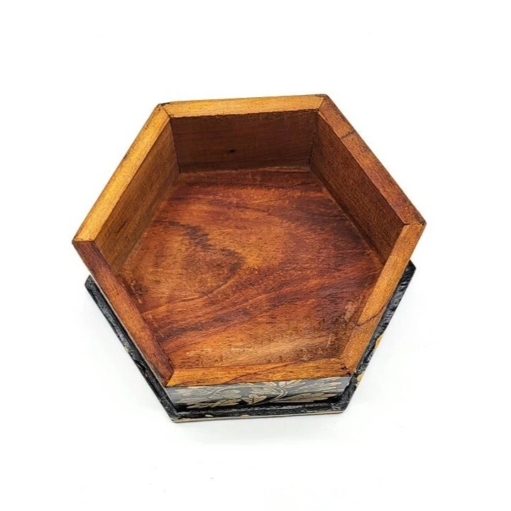 BRAND: 1790s Handmade and Hand Painted Hexagonal Wood Bos, Made in India SIZE: Approximately 5" across and 2.25" Tall. MATERIAL: Wood and Paint COLORWAY: Black and Cream Colored Accents. Brown interior of box. CARE: Hand wipe with soft cloth. CONDITION: This is a vintage wooden hexagonal hand painted box made in India 1970s. It is in very good shape and I see no cracks or signs of damage. The box is perfect for keepsakes or jewelry and would be beautiful in most decors. You can see from my photos that the bottom has some wear of the black paint which can easily touched up. Thank you for shopping with us and have a wonderful day!