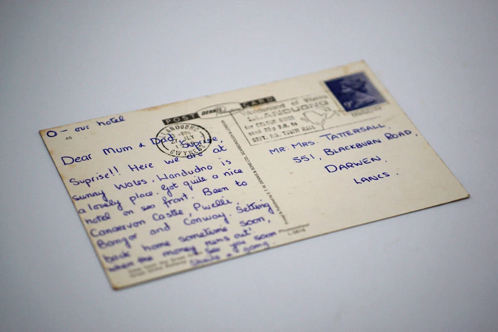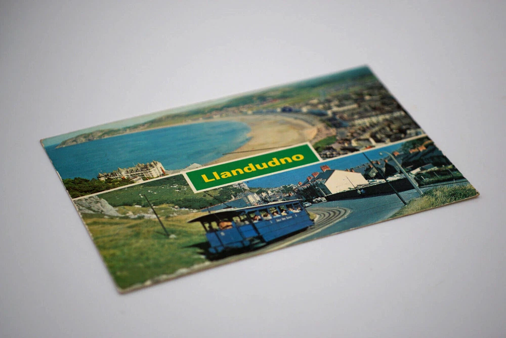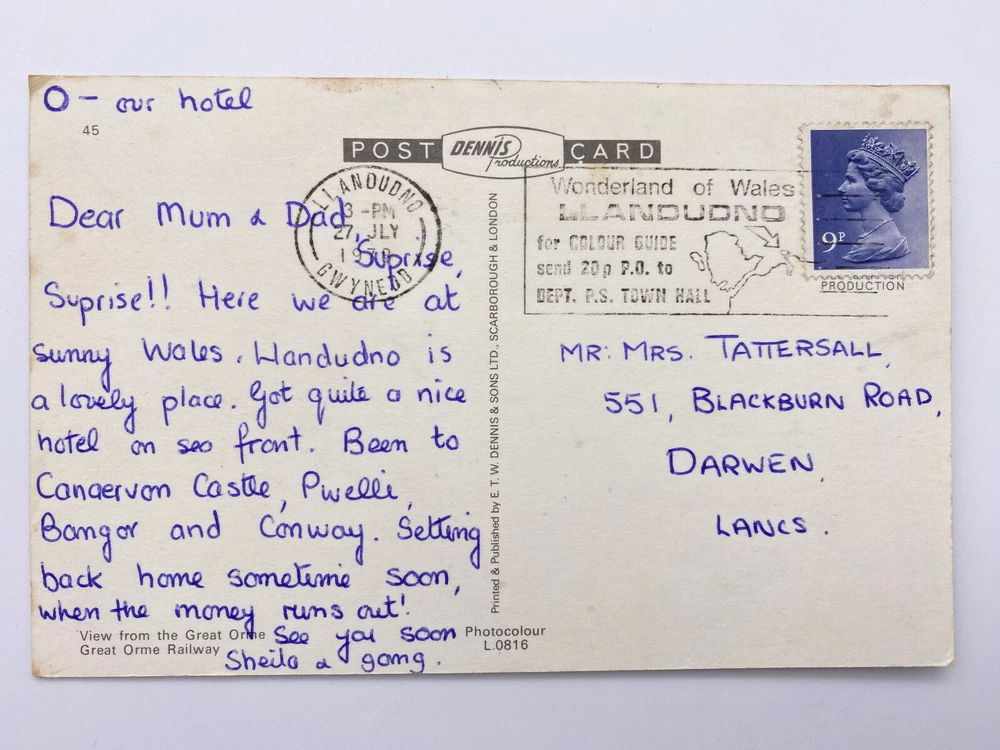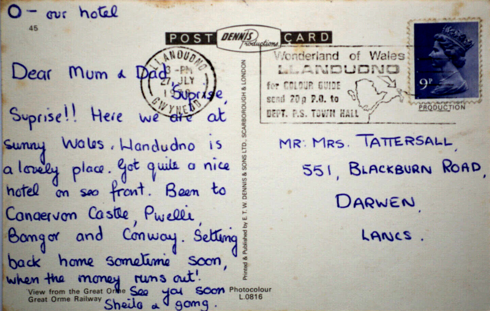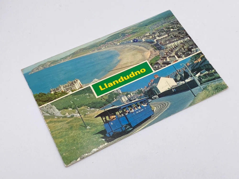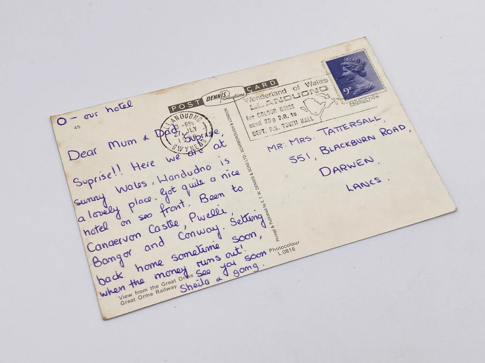 1970's Postcard Holiday Wonderland of Wales Llandudno Gwynedd Railway Beach RPPC Llandudno 5 5 GREAT ONE BAKAT 1 CARD Wonderland of Wales LLANDUDNO for COLOUR GUIDE send 20p 2.0. to DEPT. P.S. TOWN HALL 9P PRODUCTION MR: MRS. TATTERSALL 551, BLACKBURN ROAD DARWEN LANCS 0 - our hotel 45 POST DENNIS Productions Dear Mum & Dad ANDUDNO a Pad -PM JLY 1 Supride GWYNEAS Suprise!! Here we are at Sunny Wales. Handudno is lovely place. Got quite a nice hotel on seo front. Been to a Cangervon Castle, Pwelli 7 Bangor and Conway. Setting back home sometime soon, when the money runs out! View from the Great Orthe Soo Great Orme Railway Sheila a you Printed & Published by E. T. W. DENNIS & SONS LTD., SCARBOROUGH & LONDON Soon Photocolour gong. L.0816 Posted. Good vintage condition. Minor bending on all corners. Edges have some of its paint gone. Dirt spots and stains mark on both sides of the postcard. Good condition for its age . Please look at the photos for condition details.