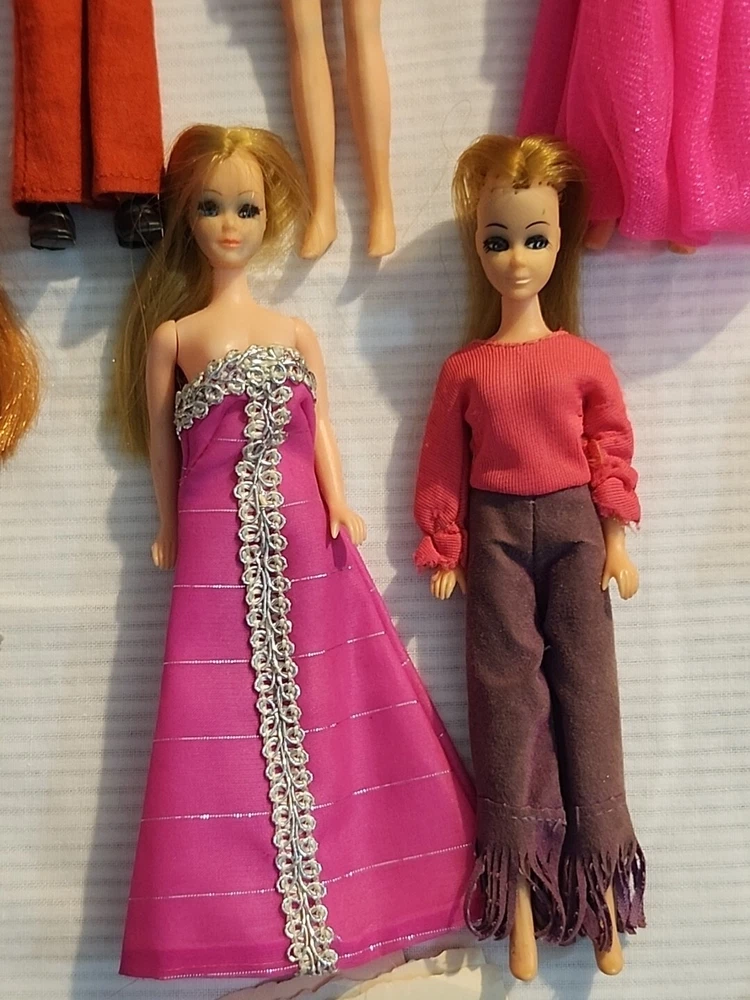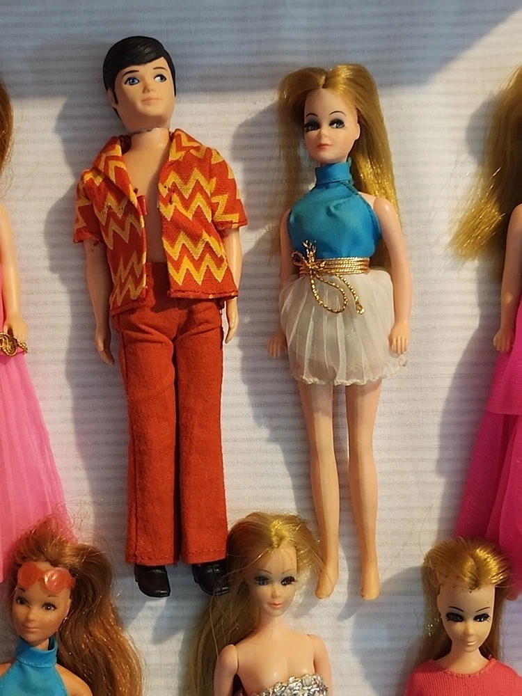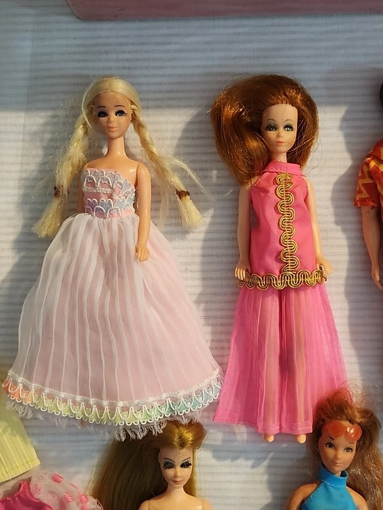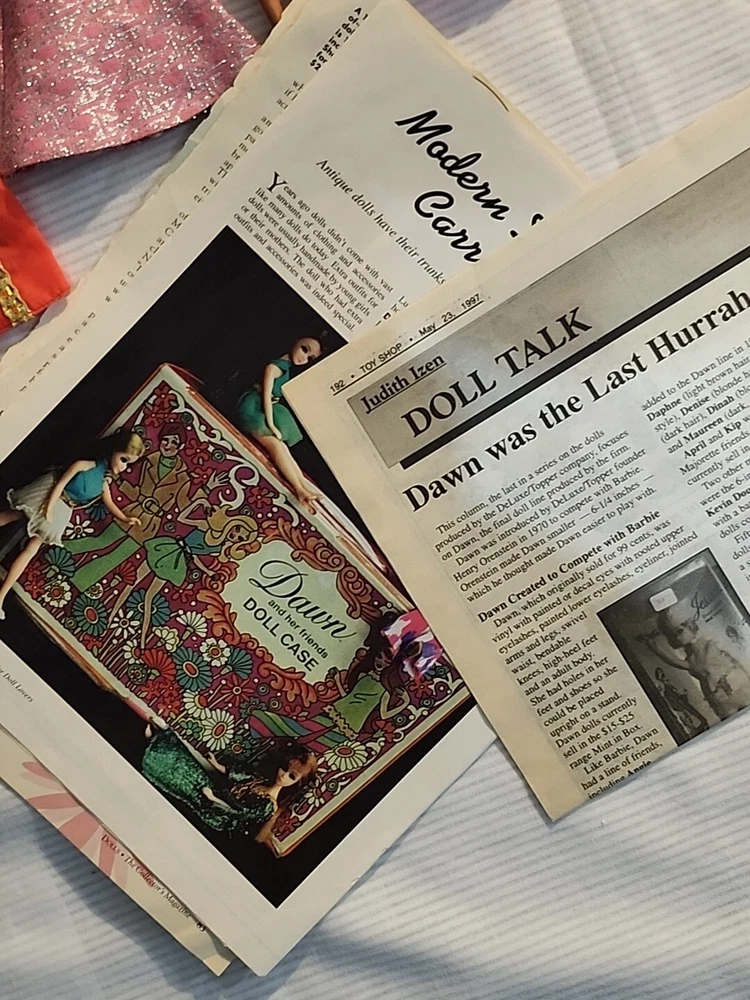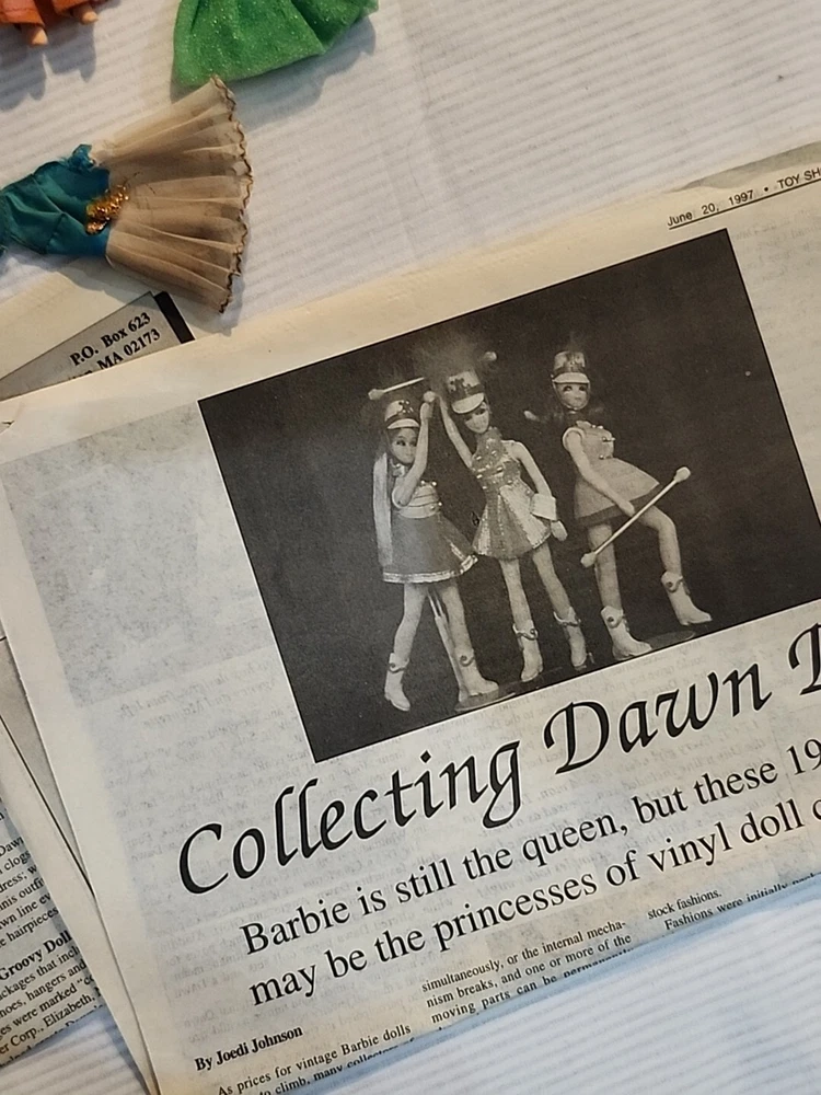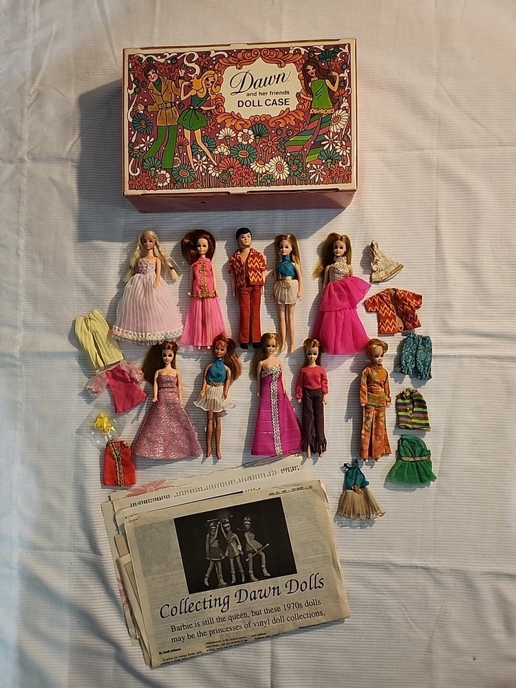 Nice size lot of Dawn and friends' dolls, clothing, carrying case and some news articles. The lot includes: 10 dolls dressed in original clothing Extra clothing and a pair of shoes carrying case - excellent shaped BUT the handle has broken off clipped news articles from previous owner