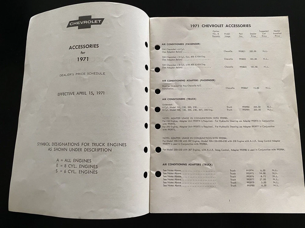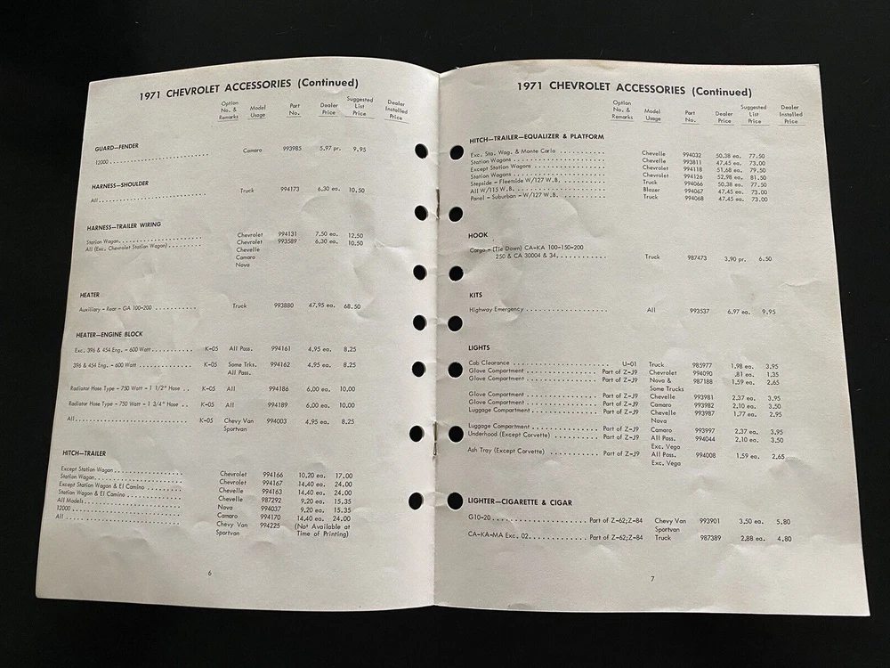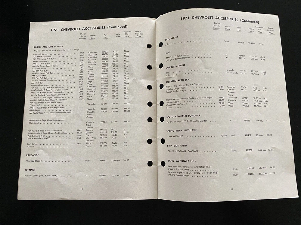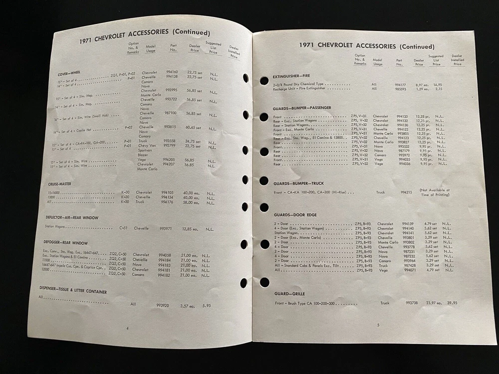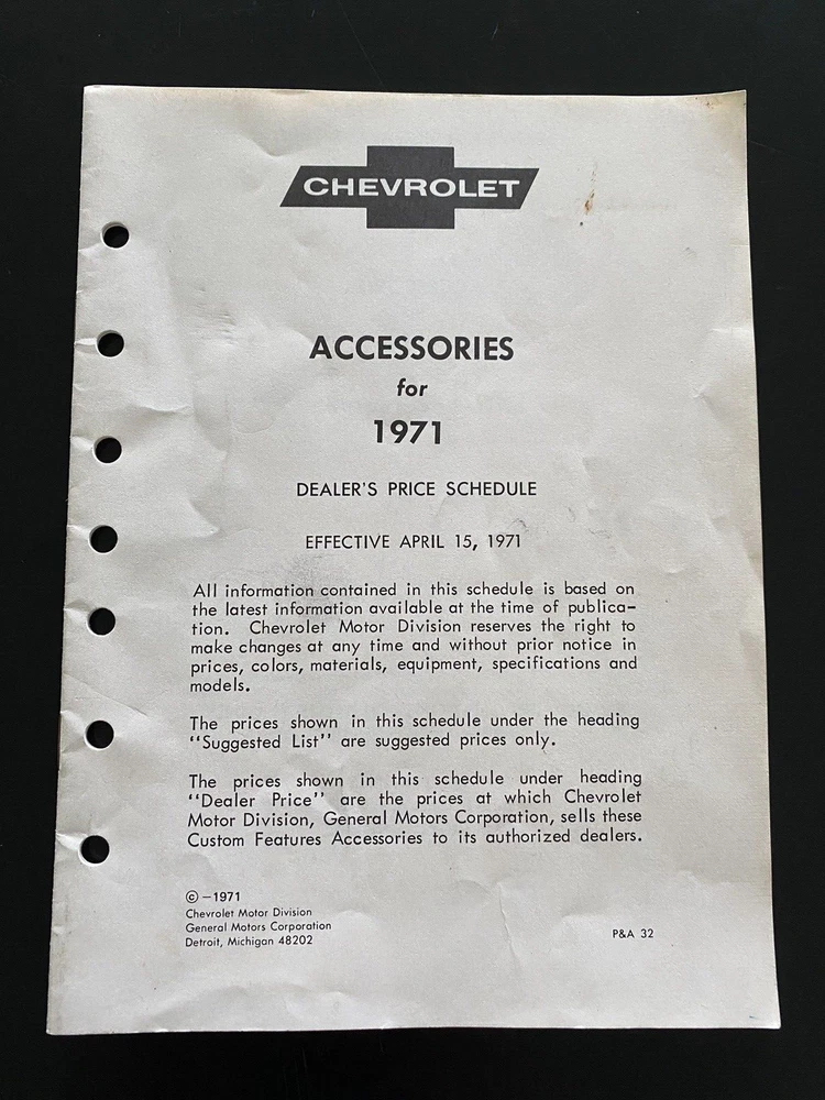 Up for your consideration is a 1971 Chevrolet Accessories Dealer's Price Schedule effective April 15, 1971. Available for all Passenger Car Models. Rare piece of Chevrolet literature. 14 pages. Measures 4 1/2" x 8 1/2". Impala Caprice Chevelle SS Nova Monte Carlo Camaro RS Z/28 Corvette Booklet is in Good Condition! Please view my photos for further review. No Shipping Outside of the USA!