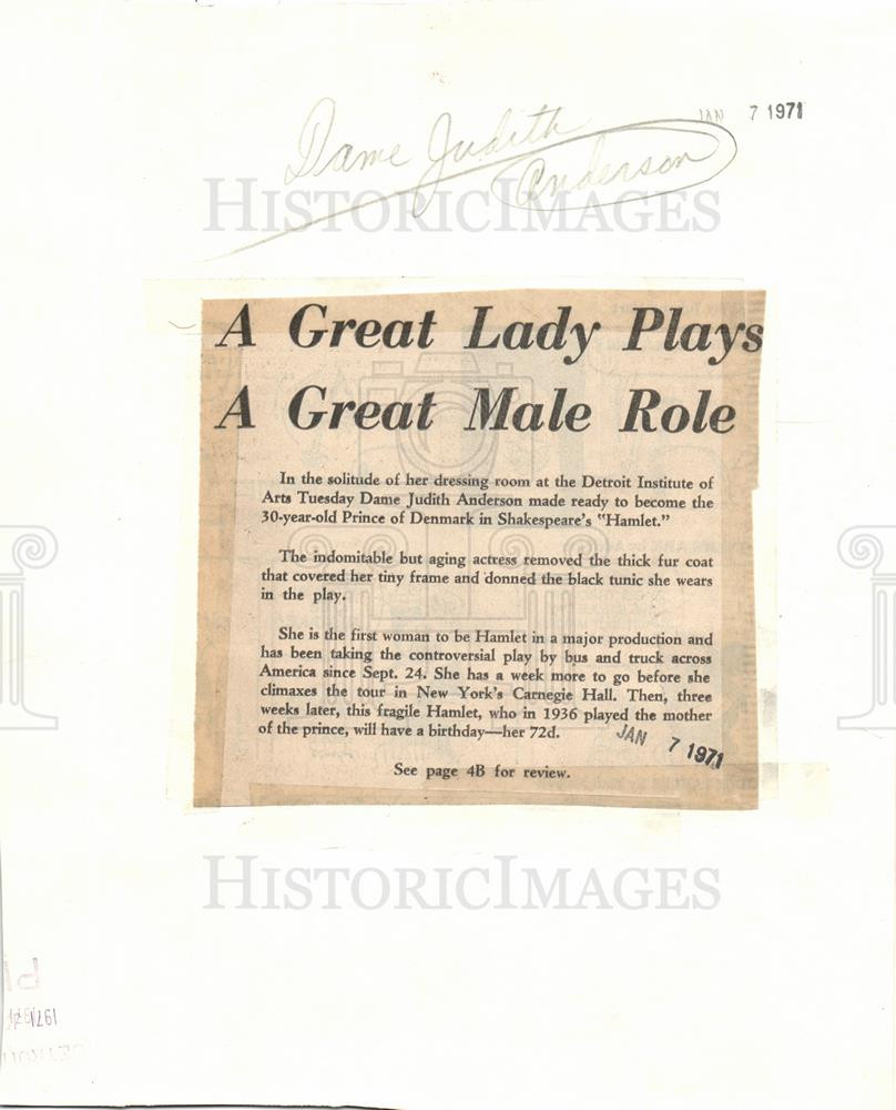 ebay template Note: Please study the images carefully to determine the condition of this vintage photograph, as it may not be in perfect condition. It may contain wrinkles, cracks, and possibly even tears due to its age and how it was handled before it got to us. A scanner may interpret colors and contrast differently than human eyes will, so it is possible that the actual photograph may be slightly darker or lighter in person. This vintage photograph is offered for sale as a collectible item and conveys no transfer of copyright. 1971 Press Photo Dame Judith Anderson Actress - dfpb59407 Dame Judith Anderson. A Great Lady Plays, A Great Male Role, in the solitude of her dressing room at the Detroit Institute of Arts. Photo measures 8.25 x 10 inches. Photo is dated 01/07/1971. PHOTO FRONT PHOTO BACK Historic Images Part Number: dfpb59407 FAQs Q: Can I just download a digital version instead? A: No, we sell only vintage originals and do not make or distribute any copies, including digital ones. Q: Do you combine shipping and invoices? A: Multiple photos won on the same seller ID combine automatically through the eBay checkout process. If you encounter problems with this, send us a message via eBay messaging and we will send you an invoice. Due to eBay limitations, we cannot combine items won on our different seller IDs for a single shipping charge. Q: How quickly do you ship the items once paid? A: We ship within one business day after your payment clears. If you do not receive an "order shipped" email from us by the close of the second business day from submitting payment, please e-mail us via eBay messaging. Q: How do you make sure my photograph arrives safely? A: We package each order between two cross-corrugated pieces of cardboard to ensure that the package is as difficult to bend as possible. We then wrap each order in a plastic sheet to help protect against moisture. We want you to rest assured that we take every precaution to ensure that the photograph you receive will be in the same condition in your care as it was in ours. Q: Will the "Historic Images" watermark be on my photo when I receive it? A: No. This is a digital watermark we use to protect our images. It is not printed on the photo. Q: What are your office hours? A: eBay for us is a business, and a very fun one to be in! We are open M-F 9 to 5 (CST). Therefore, we do not return e-mails and phone calls over the weekend. We observe the following holidays: New Years Day, Memorial Day, Fourth of July, Labor Day, Thanksgiving and the day after Thanksgiving, Christmas Eve and Christmas Day. Q: Where did all these vintage photos come from? A: These original vintage photographs are from various news service and newspaper photo archives from locations around the country including: Boston, Detroit, Tampa, Chicago, Denver, Seattle, New Orleans, Milwaukee, Portland, Spokane, and more. We do not copy or reproduce any photographs -- every item is a unique vintage piece that was housed in a news archive. Q: Can I use this photograph in my book/blog/website? A: The short answer is no. There is no transfer of copyright for republication or reproduction with these photographs when you purchase them, and only photographs taken before 1923 are currently automatically in the public domain. Permission from the copyright holder, which usually can be identified from the back of each photo, must be sought to republish or reproduce the image for any purpose. Q: Do you relist items (in case I miss an auction ending)? A: Auction items that receive no bids are relisted in our store (historicimages-store on eBay) as a fixed-price item and at a higher price than the starting auction price. Q: Do you leave feedback? A: Yes, we always leave feedback for buyers. Our software monitors when our buyers leave us feedback, then notifies us that we can leave feedback for the buyer. Rest assured, if you leave feedback, we will do the same! Check out our family of eBay IDs: historicimages01 Sports Photos historicimages02 Entertainment Photos historicimages03 Americana Photos historicimages04 International & War Photos historicimages05 Transportation Photos historicimages06 Photos of All Subjects historicimages07 Entertainment Photos historicimages08 Newsworthy Photos historicimages09 Entertainment Photos historicimages10 Sports Photos historicimages-store Our largest fixed-price selection historicimages-gallery Hand-picked photos Saturday night auctions About Us Historic Images was formed in September 2009, with a handful of scanners working out of a basement to digitize newspaper photo archives. We have since moved out of the basement, and we can now archive thousands of photos per day. Our company has worked with magazines and newspapers from Detroit, Boston, Denver, Seattle, Tampa, Chicago, and New Orleans, just to name a few. We are constantly adding to our inventory, and have assembled an archive of millions of photos to date. As our company evolved, we began our eBay business, which brings thousands of fresh auctions per week to the world's largest online auction marketplace. Our custom software systems and team of great employees allow us to efficiently scan and sell large photo archives online. At the very core of our company's DNA is a strong commitment to customer satisfaction and strict integrity for our product. Our promise to you is that we will do everything in our power to provide you a great buying experience. Copyright 2009 - Present, Historic Images, Inc. Sell Smarter with Kyozou. Inventory and Ecommerce Management