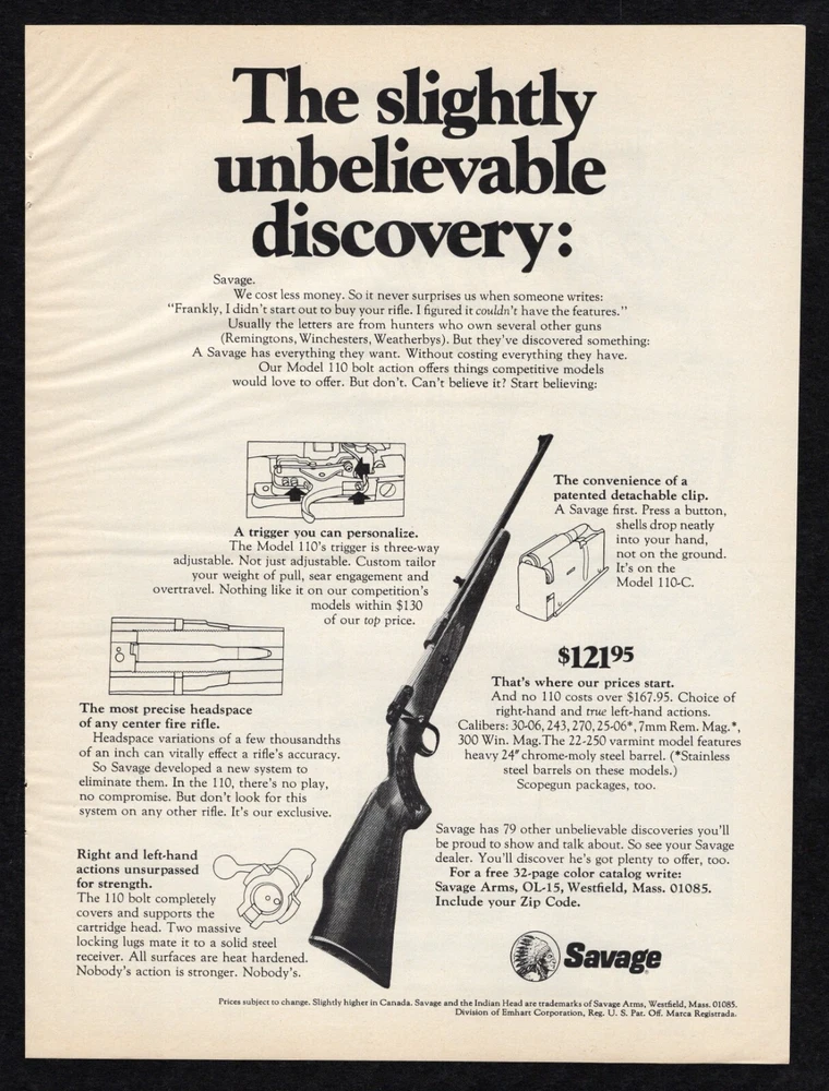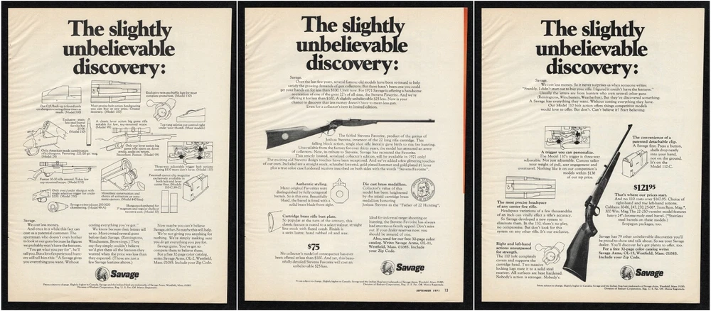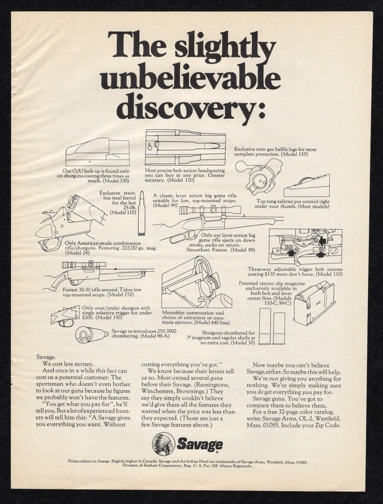 19 71 Savage Arms Guns Slightly Unbelievable Discovery Cost Less Money Print Ad Suitable for Framing This is an original Ad removed from its original magazine. Ad Description/Company Name : Side 1 : Savage Arms Guns – We Cost Less Money The Slightly Unbelievable Discovery: A Savage gives you everything you want. Without costing everything you’ve got. 3 Pages of themed (slightly unbelievable) Savage ads, each ad on it’s own single page, so you can display all three pages side by side by side. Side 2 : On the back: page 1: No Ads page 2: North American School of Conservation page 3: English Leather Shave Cream and After Shave Publication Date: 19 71 September Publication Name: Outdoor Life Magazine Size: Approx 8 ¼” x 1 1 ” Condition : Used. These are original pages from original magazines. They are very old, and usually stored in less-than-perfect environments. F oxing, fading, discoloration are common and present to some degree . Also staple holes, corner folds, edge damage, creases, ripples, scuffs , smudges and other imperfections are normal . Pages may show pressure marks from production or years of storage . Images are NOT matted or framed. I only trim the spine edge , leaving the other three sides untouched. The images are the EXACT SAME PAGE BEING SOLD, AS IS . PLEASE EXAMINE CLOSELY AND MAKE YOUR OWN JUDGMENT. NOTE: Ripples. Your satisfaction guaranteed. If you have any questions or qualms, feel free to ask! Magazine ads are shipped in: 2-mil Clear Polypropylene Magazine Bags with a white backer board, in a Rigid Mailer, in a sealed Poly Mailer, marked "Handle With Care, Do not Bend" and shipped USPS. We DO combine shipping for multiple purchases!
