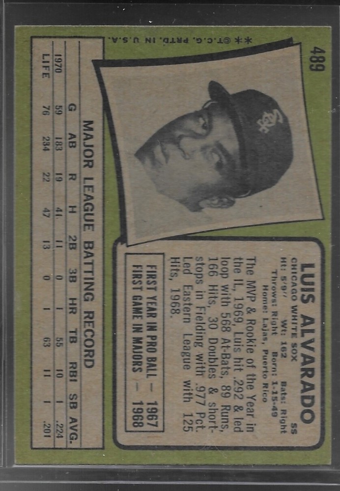 1971 Topps - #489 Luis Alvarado Color, gloss are good. Despite the age of the cards the colors appear to be close to newly opened. Very minimal surface wear. Corners and edges show some light wear in isolated areas as they are 40 plus year old cards. I do my best to evaluate each card carefully but please examine high-resolution pic as price of card is determined by that pic. All cards are shipped in a brand new Ultra-Pro Premium top loader with an Ultra-Pro premium plastic sleeve to protect your card for years. Please read our reviews. Customers are pleased with their card purchases from NMMT Vintage. Tired of dealers sending lazy careless shipments of your cards? We are different! Customers rave about our care in shipping and handling your treasure regardless of its value.eBay Standard envelope shipping will have a small cardboard support as well as the Ultra-Pro Premium top loader/penny sleeve. First class shipping will have two cardboard backers as well as the Ultra-Pro Premium top loader/penny sleeve and will be mailed in a protective mailer. Will combine shipping after $5.25 in shipping is reached and USPS Ground Advantage will be used to ship your order. Any shipping over 5.75 dollars will be refunded.