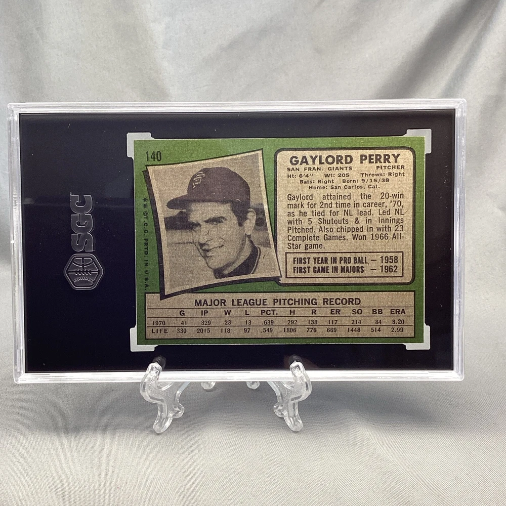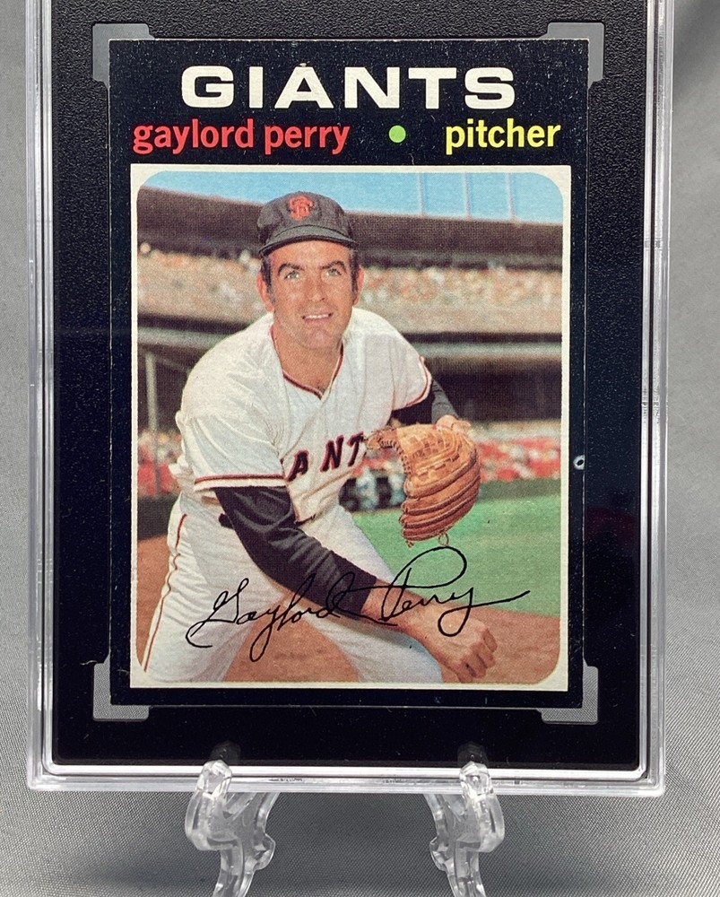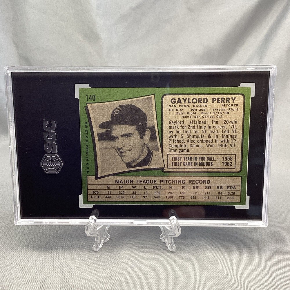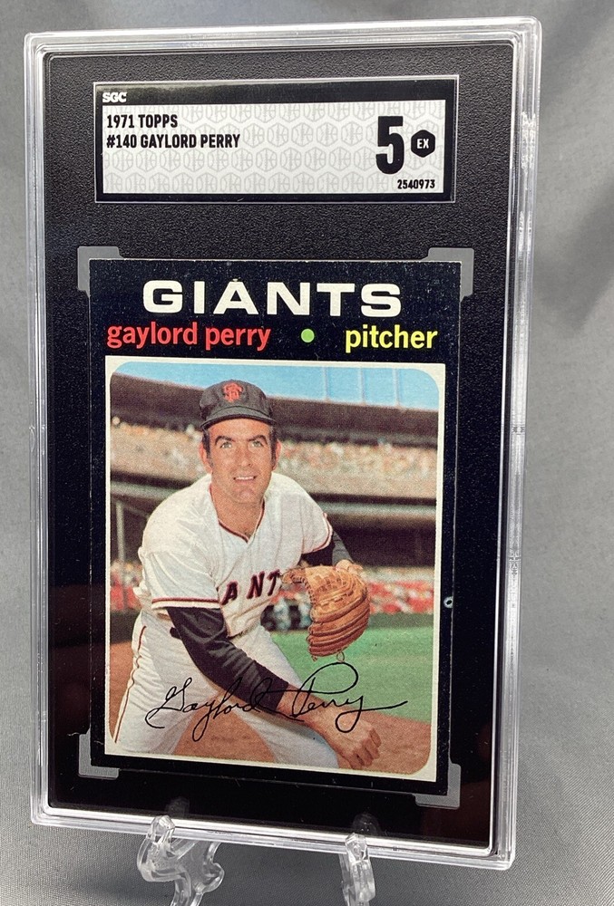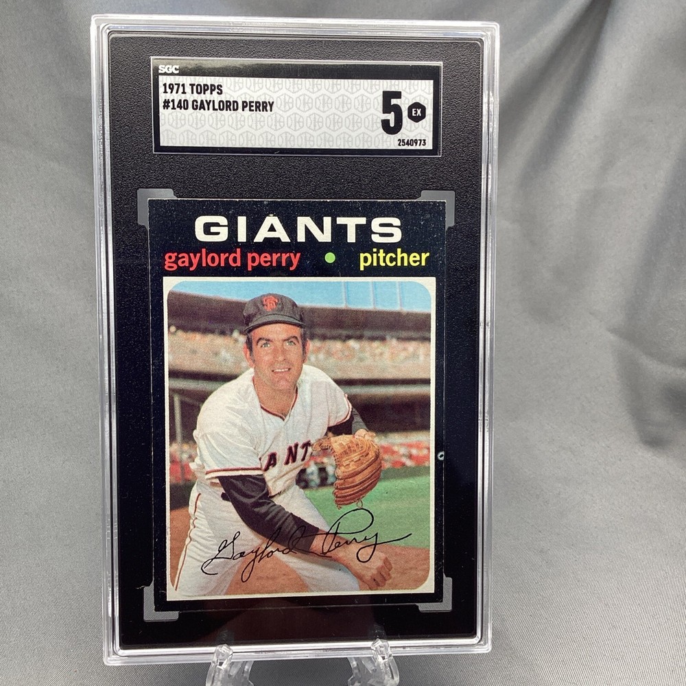 A 1971 Topps Gaylord Perry #140 baseball card featuring the San Francisco Giants in the MLB World Series. This original trading card is part of the 1971 Topps Baseball set and has a black border. It is made of paperboard and card stock, with a thickness of 35 Pt. The card is in excellent condition, graded SGC 5.