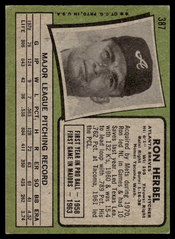 About Me Other Listings Feedback Add to Favorites Contact Me Iowa Discount Sportscards 1971 Topps Ron Herbel Atlanta Braves #387 No stock photo / These are real scans or pictures Details Description: Ron Herbel Category: Baseball Year: 1971 Product: Topps Team: Atlanta Braves Card Number: 387 Dimensions: 3½" x 2½" SKU: BL B0001 R05 S (14) Listing By Kronocard trading cards software v2.8.2.3