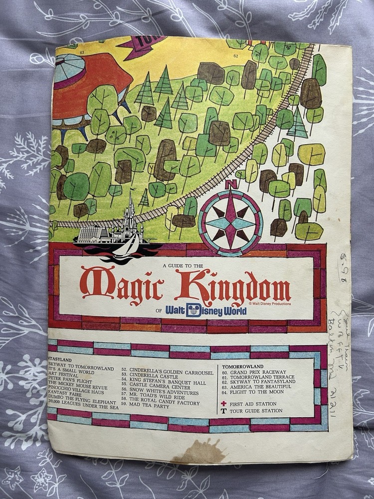 Approximately 25” x 28” inches original Walt Disney World opening year (1971) souvenir park map. This map has a few signs of wear (some stains and pencil scribbles in one corner). It will be shipped in its folded form, as that is how it has been stored.