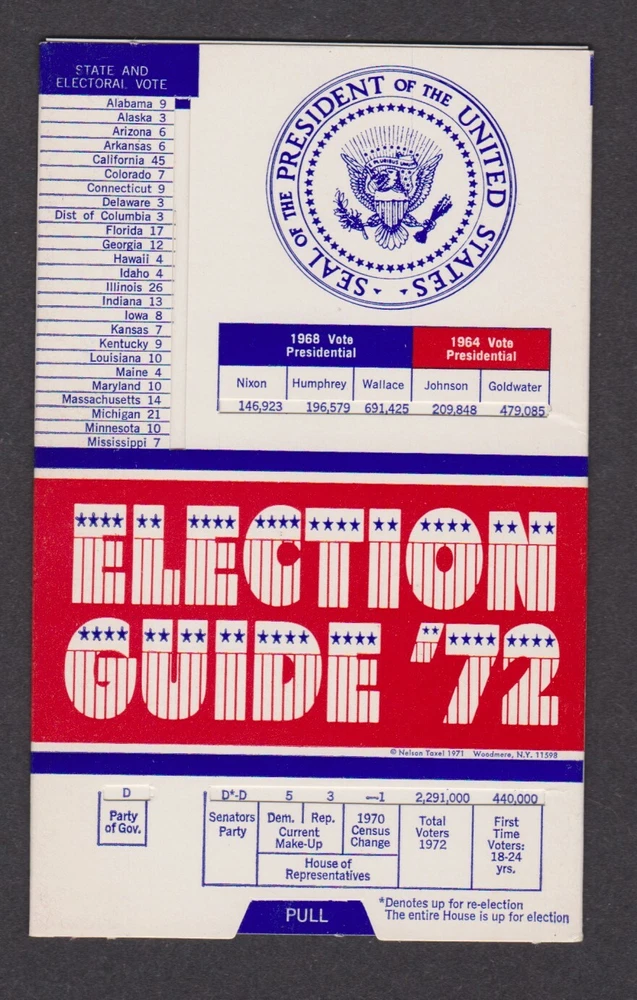 Nicely done cardboard election guide--issued for 1972 election. One can pull tab at bottom which will enable the card to move which will show results of previous elections by each state--last one to show is 1968 campaign. About 3.75 x 6.25" in size. Near excellent condtion. Track Page Views With Auctiva's FREE Counter