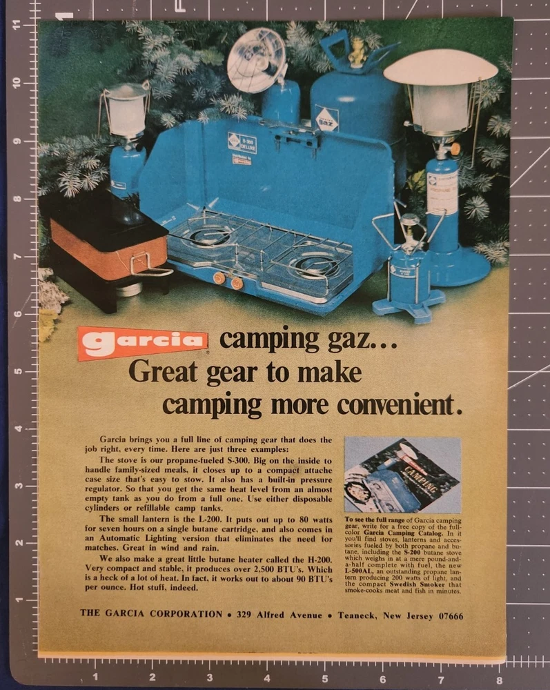 Perfect for framing! 1972 GARCIA CAMPING GEAR PRINT AD. Fishing Hunting Garage Shop Outdoor Cabin Art. Original 11"x8.25". This page is from a Vintage Magazine. The page is in good condition with light age toning. This is an original advertisement and not a reproduction. I carefully removed this from the magazine it was originally in. It will be stored and shipped in a plastic sleeve with a backing board. If you like this please check our other listings as we upload similar items daily.