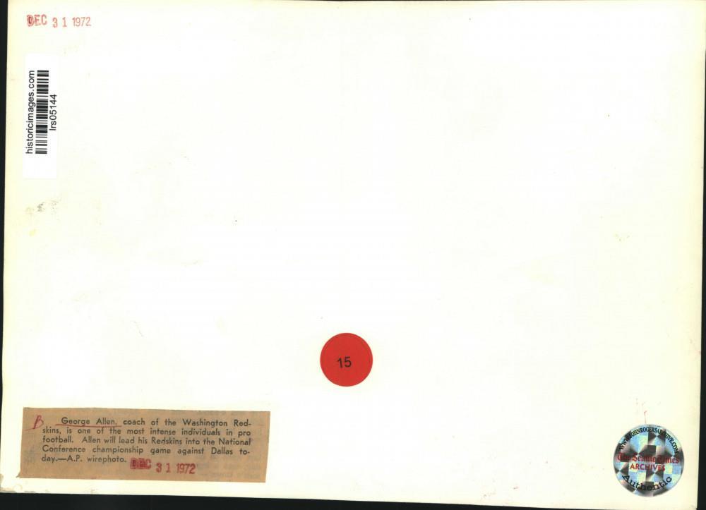 ebay template Note: Please study the images carefully to determine the condition of this vintage photograph, as it may not be in perfect condition. It may contain wrinkles, cracks, and possibly even tears due to its age and how it was handled before it got to us. A scanner may interpret colors and contrast differently than human eyes will, so it is possible that the actual photograph may be slightly darker or lighter in person. This vintage photograph is offered for sale as a collectible item and conveys no transfer of copyright. 1972 Press Photo Washington Redskins Coach George Allen is an intense individual This is an original press photo. George Allen, coach of the Washington Redskins is one of the most intense individuals in pro football. Allen will lead his Redskins into the National Conference championship game against Dallas today. Photo measures 10 x 7 inches. Photo is dated 12-31-1972. PHOTO FRONT PHOTO BACK Historic Images Part Number: lrs05144 FAQs Q: Can I just download a digital version instead? A: No, we sell only vintage originals and do not make or distribute any copies, including digital ones. Q: Do you combine shipping and invoices? A: Multiple photos won on the same seller ID combine automatically through the eBay checkout process. If you encounter problems with this, send us a message via eBay messaging and we will send you an invoice. Due to eBay limitations, we cannot combine items won on our different seller IDs for a single shipping charge. Q: How quickly do you ship the items once paid? A: We ship within one business day after your payment clears. If you do not receive an "order shipped" email from us by the close of the second business day from submitting payment, please e-mail us via eBay messaging. Q: How do you make sure my photograph arrives safely? A: We package each order between two cross-corrugated pieces of cardboard to ensure that the package is as difficult to bend as possible. We then wrap each order in a plastic sheet to help protect against moisture. We want you to rest assured that we take every precaution to ensure that the photograph you receive will be in the same condition in your care as it was in ours. Q: Will the "Historic Images" watermark be on my photo when I receive it? A: No. This is a digital watermark we use to protect our images. It is not printed on the photo. Q: What are your office hours? A: eBay for us is a business, and a very fun one to be in! We are open M-F 9 to 5 (CST). Therefore, we do not return e-mails and phone calls over the weekend. We observe the following holidays: New Years Day, Memorial Day, Fourth of July, Labor Day, Thanksgiving and the day after Thanksgiving, Christmas Eve and Christmas Day. Q: Where did all these vintage photos come from? A: These original vintage photographs are from various news service and newspaper photo archives from locations around the country including: Boston, Detroit, Tampa, Chicago, Denver, Seattle, New Orleans, Milwaukee, Portland, Spokane, and more. We do not copy or reproduce any photographs -- every item is a unique vintage piece that was housed in a news archive. Q: Can I use this photograph in my book/blog/website? A: The short answer is no. There is no transfer of copyright for republication or reproduction with these photographs when you purchase them, and only photographs taken before 1923 are currently automatically in the public domain. Permission from the copyright holder, which usually can be identified from the back of each photo, must be sought to republish or reproduce the image for any purpose. Q: Do you relist items (in case I miss an auction ending)? A: Auction items that receive no bids are relisted in our store (historicimages-store on eBay) as a fixed-price item and at a higher price than the starting auction price. Q: Do you leave feedback? A: Yes, we always leave feedback for buyers. Our software monitors when our buyers leave us feedback, then notifies us that we can leave feedback for the buyer. Rest assured, if you leave feedback, we will do the same! Check out our family of eBay IDs: historicimages01 Sports Photos historicimages02 Entertainment Photos historicimages03 Americana Photos historicimages04 International & War Photos historicimages05 Transportation Photos historicimages06 Photos of All Subjects historicimages07 Entertainment Photos historicimages08 Newsworthy Photos historicimages09 Entertainment Photos historicimages10 Sports Photos historicimages-store Our largest fixed-price selection historicimages-gallery Hand-picked photos Saturday night auctions About Us Historic Images was formed in September 2009, with a handful of scanners working out of a basement to digitize newspaper photo archives. We have since moved out of the basement, and we can now archive thousands of photos per day. Our company has worked with magazines and newspapers from Detroit, Boston, Denver, Seattle, Tampa, Chicago, and New Orleans, just to name a few. We are constantly adding to our inventory, and have assembled an archive of millions of photos to date. As our company evolved, we began our eBay business, which brings thousands of fresh auctions per week to the world's largest online auction marketplace. Our custom software systems and team of great employees allow us to efficiently scan and sell large photo archives online. At the very core of our company's DNA is a strong commitment to customer satisfaction and strict integrity for our product. Our promise to you is that we will do everything in our power to provide you a great buying experience. Copyright 2009 - Present, Historic Images, Inc. Sell Smarter with Kyozou. Inventory and Ecommerce Management