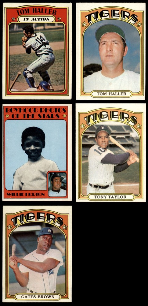 This set contains the following cards 1972 Topps #34 - Billy Martin In Action 2 - GOOD Front Back 1972 Topps #83 Dalton Jones 4 - VG/EX Front Back 1972 Topps #90 - Reggie Jackson / Norm Cash / Bill Melton AL HR Leaders 3 - VG Front Back 1972 Topps #94 - Vida Blue / Mickey Lolich / Wilbur Wood AL Pitching Leaders 3 - VG Front Back 1972 Topps #96 - Vida Blue / Joe Coleman / Mickey Lolich AL Strikeout Leaders 3 - VG Front Back 1972 Topps #120 Bill Freehan 3 - VG Front Back 1972 Topps #175 Tom Haller 6 - EX/MT Front Back 1972 Topps #176 - Tom Haller In Action 5 - EX Front Back 1972 Topps #187 Gates Brown 7 - NM Front Back 1972 Topps #239 Tom Timmermann 4 - VG/EX Front Back 1972 Topps #257 - Jim Foor / Tim Hosley / Paul Jata Tigers Rookies 3 - VG Front Back 1972 Topps #284 Ike Brown 7 - NM Front Back 1972 Topps #337 Mike Kilkenny 6 - EX/MT Front Back 1972 Topps #367 Ron Perranoski 7 - NM Front Back 1972 Topps #494 - Willie Horton Boyhood Photo 4 - VG/EX Front Back 1972 Topps #511 Tony Taylor 7 - NM Front Back This is a 1972 Topps Detroit Tigers Near Team Set. Dean's Cards has designed our Near Complete Team Sets using the majority of cards for that team - leaving out the expensive super-star rookie cards, high numbers, short-prints, and multi-player rookie cards, reducing the price. the other cards can then be added, from our inventory of over a million cards, as your budget allows. For the exact cards contained in this set, as well as their front and back scans, please see the description below. Set breakdown by grade: Number of Cards in Set 16 Average Grade - Weighted by Value 5.46 - EX+ Average Grade - Unweighted 4.63 - VG/EX+ Grade Breakdown 7 - NM 4 6 - EX/MT 2 5 - EX 1 4 - VG/EX 3 3 - VG 5 2 - GOOD 1 . This near team set contains 16 cards out of the possible 31 cards. This is not a complete set. This set does not include the following cards: #6 Fred Scherman, #33 Billy Martin, #150 Norm Cash, #216 Joe Niekro, #319 Aurelio Rodriguez, #385 Mickey Stanley, #408 Jim Northrup, #450 Mickey Lolich, #487 Tigers Team, #535 Ed Brinkman, #600 Al Kaline, #640 Joe Coleman, #725 Dick McAuliffe, #750 Willie Horton, #783 Les Cain Dean's Cards offers a 100% Money Back Satisfaction Guarantee on all purchases. Just contact us within 10 days of the purchase date and we will refund your money or, when possible, replace the cards. 1972 Topps Detroit Tigers Near Team Set 5.5 - EX+ 6908791 (16 / 31 cards) If the scan in the listing says ACTUAL IMAGE, you will receive the card pictured. For cards issued after 1983, we will often use representative images and you will not receive the exact card pictured. Shipping Policy You only pay shipping on the first item. If you order multiple items on the same order, you will only be charged once for shipping. We do not combine shipping on multiple orders. To avoid multiple shipping charges we recommend using eBay's "Add to Cart" feature to check out multiple items in one transaction, or please request and allow for us to send an invoice to reflect the combined shipping charges. Canadian customers - We send all of our Canadian/International packages with tracking and cannot make any exceptions to this policy. Negotiating Prices All prices are final and we do not negotiate. This policy is to ensure that everyone knows that they are getting our best possible price. So please do not ask us to negotiate on price. Return Policy Dean's Cards has a 100% Money Back Satisfaction Guarantee on all purchases, as long as the product is returned within 30 days of receiving the product. Card Grading Each card is first reviewed by a member of our team, in order to detect any flaws that may not be visible on a scan, such as wrinkles, creases, print spots, or light stains. The vast majority of our vintage cards are professionally graded by the Dean's Cards Grading Software and include a 100% satisfaction guarantee. Our grading is on par with PSA standards when it comes to corners, centering and flaws - and tends to grade a bit tougher than PSA, on cards with a tilted image or rough edges. This grading software was developed to provide far better grading and consistency than can be achieved using the human eye. Determining the card's grade The sharpness of the corners and the degree to which a card was cut off-center determines the maximum possible grade that the card can receive. The card's grade is further reduced by any flaws or blemishes that it may have. Each card is evaluated on the following characteristics and assigned a score. Corners - Each corner of a card is individually analyzed, and then assigned a score on how square, sharp, and flawless it appears. Centering - The borders are measured, at multiple points along the edge, to determine the horizontal and vertical centering and tilt. Defects - The card is examined for imperfections, such as: size, print flaws, dings, stains, creases, or other wear which could lower its grade. Bonus for Perfect Centering - A vintage card, with near perfect centering, is given a one-half grade bonus. So when you buy one of our cards with a half-grade (e.g. 3.5 or 6.5) it will appear perfectly centered, both vertically and horizontally. Grading Criteria Worst Corner - A card can grade only as high as the worst corner will allow. Average Corner Tilt - The difference in width of a card border near the top, compared to the bottom. OCT - The sum of how far a card is Off-Center, plus its Tilt. Minimum Centering Requirements Eye Appeal - The combination of a card's centering, corners and tilt. Well-Centered - Cards that appear perfectly centered receive a bonus of one-half grade. Flaws, defects and other imperfections - can lower a card's grade. Card Backs - the above criteria is also considered, for the back of the cards, but does not inflict as severe of a penalty to its grade. Packaging Once scanned, the cards are placed in "soft" sleeves, which have an open top for easy removal. The Dean's Cards label is placed on the top back of the card sleeve. Ever