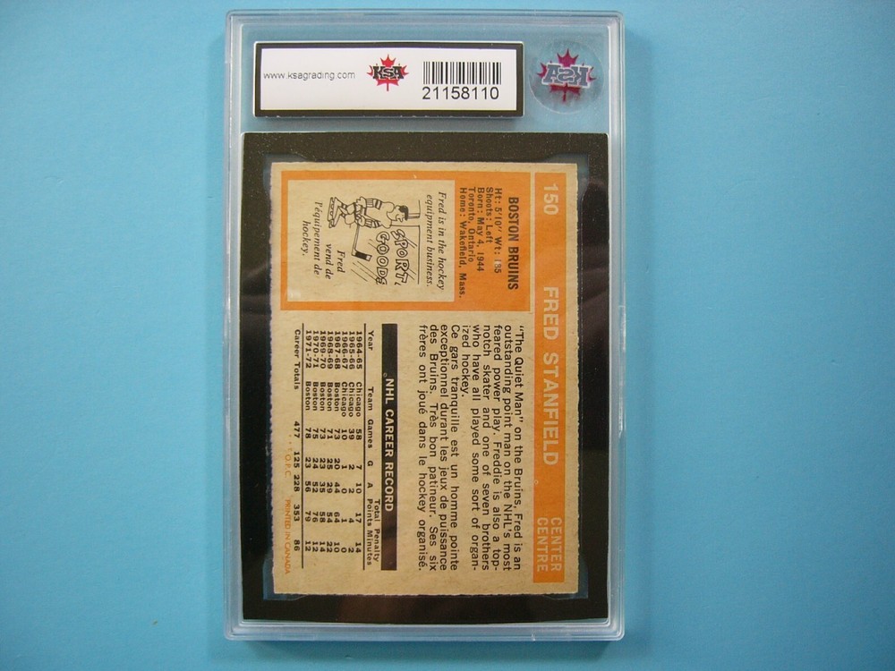 YOU ARE BIDDING ON A 1972/73 O-PEE-CHEE NHL HOCKEY CARD #150 FRED STANFIELD, BOSTON BRUINS. CARD IS GRADED 10 BY KSA IN GEM MINT CONDITION. SEE SCANS FOR FURTHER CONDITION. GREAT COLOUR & GLOSS--A SUPER SHARP, CLEAN & ATTRACTIVE CARD FROM THIS VALUABLE O-PEE-CHEE HOCKEY SET!!! THANK YOU FOR LOOKING AND GOOD LUCK!!! -------------------------------------------------------------------------------------------------------------------------------- SHIPPING WITH TRACKING AND INSURANCE WITHIN CANADA IS $12.50, TO THE UNITED STATES $15.00 AND INTERNATIONALLY $60.00 (EVERYWHERE ELSE). ITEM WILL BE CAREFULLY PACKAGED SO AS NOT TO GET DAMAGED DURING SHIPPING. IF YOU WOULD LIKE EXPEDITED SECURE SHIPPING WITH TRACKING & INSURANCE SHIPPING WITHIN CANADA IS $16.00, TO THE UNITED STATES IS $25.00 AND EVERYWHERE ELSE $50.00. I DO COMBINE SHIPPING ON MULTIPLE PURCHASES--ONLY 50 CENTS PER ADDITIONAL GRADED CARD OR ONLY 20 CENTS MORE PER ADDITIONAL SINGLE UNGRADED PHOTO OR CARD. TAKE A LOOK AT MY OTHER AUCTIONS AND SAVE ON SHIPPING!!!