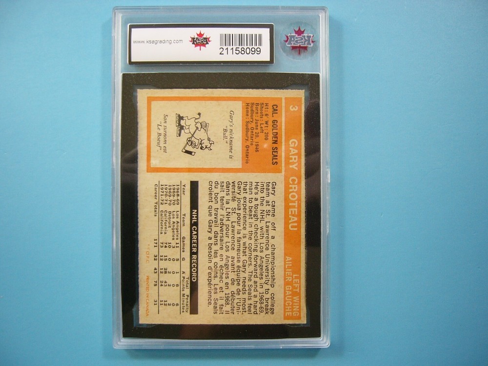 YOU ARE BIDDING ON A 1972/73 O-PEE-CHEE NHL HOCKEY CARD #3 GARY CROTEAU, CALIFORNIA GOLDEN SEALS. CARD IS GRADED 10 BY KSA IN GEM MINT CONDITION. SEE SCANS FOR FURTHER CONDITION. GREAT COLOUR & GLOSS--A SUPER SHARP, CLEAN & ATTRACTIVE CARD FROM THIS VALUABLE O-PEE-CHEE HOCKEY SET!!! THANK YOU FOR LOOKING AND GOOD LUCK!!! -------------------------------------------------------------------------------------------------------------------------------- SHIPPING WITH TRACKING AND INSURANCE WITHIN CANADA IS $12.50, TO THE UNITED STATES $15.00 AND INTERNATIONALLY $60.00 (EVERYWHERE ELSE). ITEM WILL BE CAREFULLY PACKAGED SO AS NOT TO GET DAMAGED DURING SHIPPING. IF YOU WOULD LIKE EXPEDITED SECURE SHIPPING WITH TRACKING & INSURANCE SHIPPING WITHIN CANADA IS $16.00, TO THE UNITED STATES IS $25.00 AND EVERYWHERE ELSE $50.00. I DO COMBINE SHIPPING ON MULTIPLE PURCHASES--ONLY 50 CENTS PER ADDITIONAL GRADED CARD OR ONLY 20 CENTS MORE PER ADDITIONAL SINGLE UNGRADED PHOTO OR CARD. TAKE A LOOK AT MY OTHER AUCTIONS AND SAVE ON SHIPPING!!!