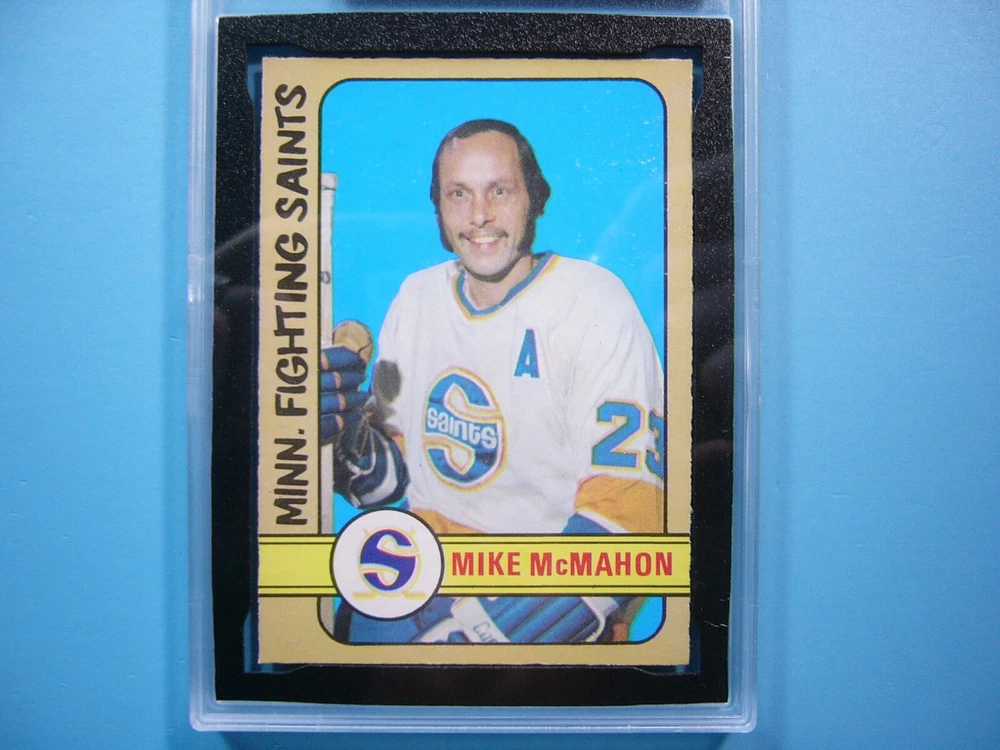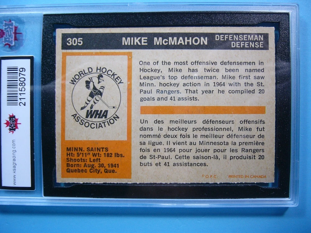 YOU ARE BIDDING ON A RARE THIRD-SERIES 1972/73 O-PEE-CHEE WHA HOCKEY CARD #305 MIKE MCMAHON, MINNESOTA FIGHTING SAINTS. CARD IS GRADED 10 BY KSA IN GEM MINT CONDITION. SEE SCANS FOR FURTHER CONDITION. GREAT COLOUR & GLOSS--A SUPER SHARP, CLEAN & ATTRACTIVE CARD FROM THIS VALUABLE O-PEE-CHEE HOCKEY SET!!! THANK YOU FOR LOOKING AND GOOD LUCK!!! -------------------------------------------------------------------------------------------------------------------------------- SHIPPING WITHIN CANADA WITH TRACKING & INSURANCE IS $12.50, TO THE UNITED STATES $15.00 AND INTERNATIONALLY $60.00 (EVERYWHERE ELSE). ITEM WILL BE CAREFULLY PACKAGED SO AS NOT TO GET DAMAGED DURING SHIPPING. WE DO COMBINE SHIPPING ON MULTIPLE PURCHASES--ONLY $1.00 PER ADDITIONAL GRADED CARD OR ONLY 25 CENTS MORE PER ADDITIONAL SINGLE UNGRADED PHOTO OR CARD. TAKE A LOOK AT MY OTHER AUCTIONS AND SAVE ON SHIPPING!!!