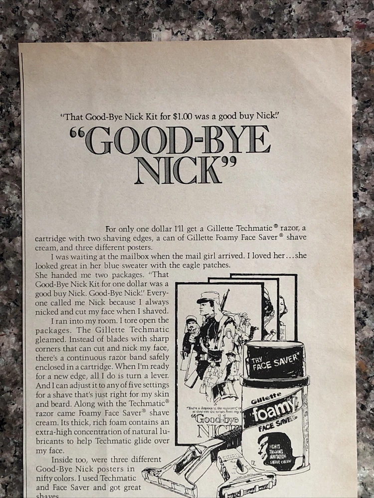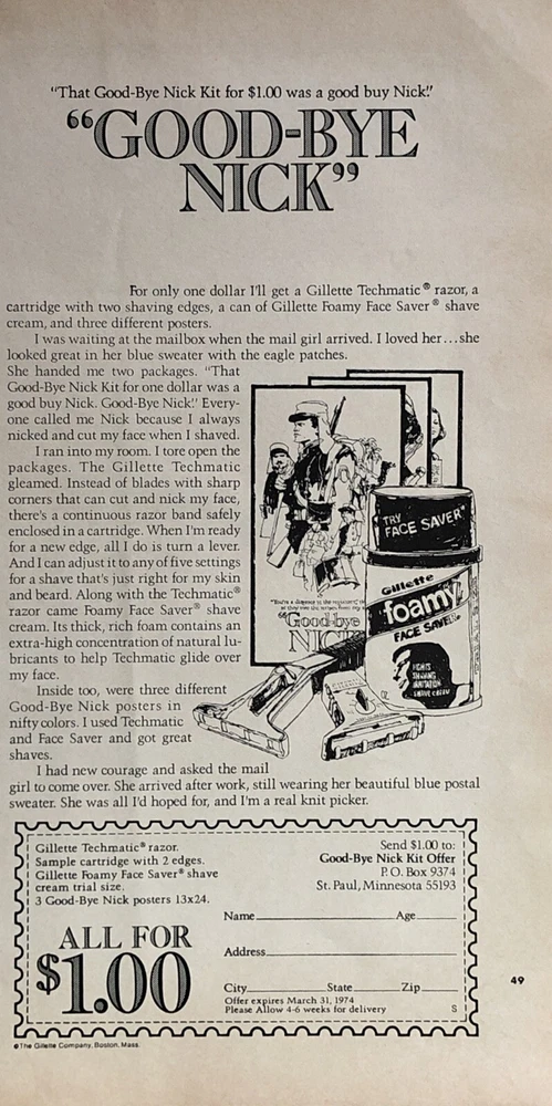 The product is a vintage magazine print ad from 1973 for the Gillette Goodbye Nick Shaving Kit, featuring a razor, blades and cream. The ad is approximately 5"x11" in black and white, showcasing Gillette's shaving products. It was created in the United States and is an original piece from the 1970s.