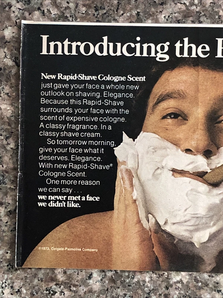 The product is a vintage magazine print ad for Palmolive Rapid-Shave Shaving Cream from 1973. The ad features a Cologne Scent and an elegant design typical of the 70s. The approximate size is 5"x8" and it was made in the United States. The theme of the ad is centered around shaving and razors.