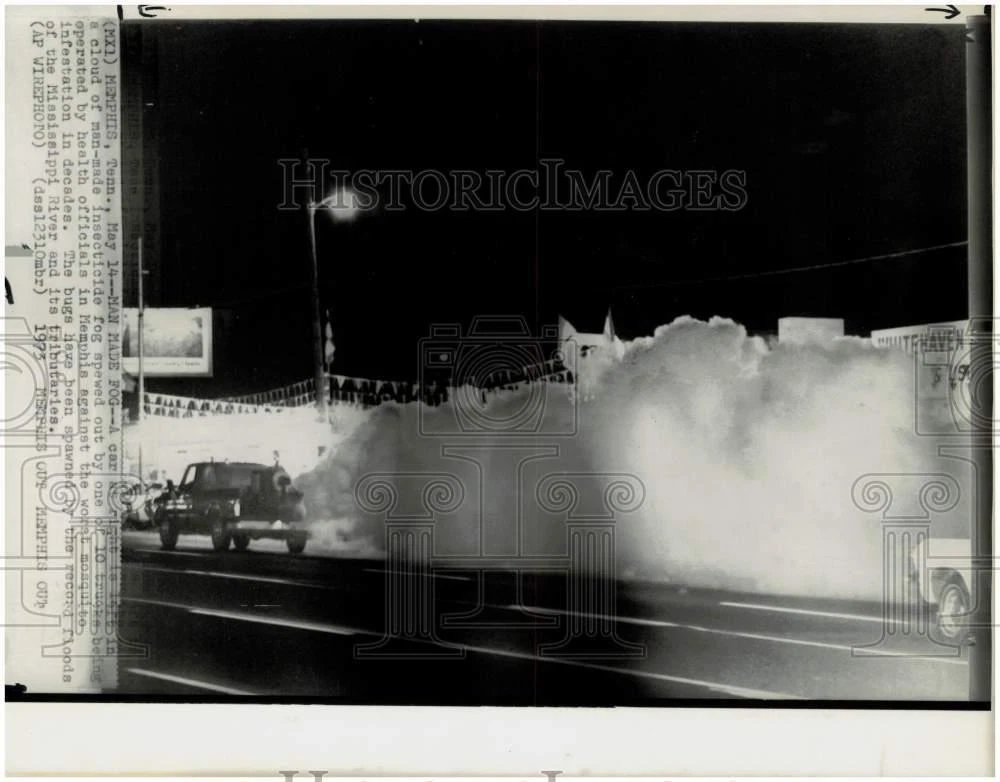 ebay template Note: Please study the images carefully to determine the condition of this vintage photograph, as it may not be in perfect condition. It may contain wrinkles, cracks, and possibly even tears due to its age and how it was handled before it got to us. A scanner may interpret colors and contrast differently than human eyes will, so it is possible that the actual photograph may be slightly darker or lighter in person. This vintage photograph is offered for sale as a collectible item and conveys no transfer of copyright. 1973 Press Photo Car covered in man-made insecticide fog in Memphis, Tennessee. This is an original press photo. Memphis, TN: Man Made Fog-A car at right is left in a cloud of man-made insecticide fog spewed out by one of 10 trucks being operated by health officials in Memphis against the worst mosquito infestation in decades. The bugs have been spawned by the record floods of the Mississippi River and its tributaries. PesticidesPhoto measures 10.5 x 8.25inches. Photo is dated 05-14-1973. PHOTO FRONT PHOTO BACK Historic Images Part Number: hpw21572 Sell Smarter with Kyozou. Inventory and Ecommerce Management