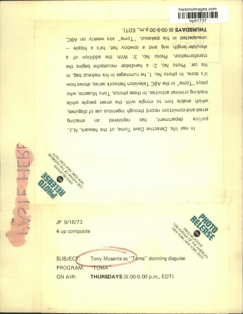 ebay template Note: Please study the images carefully to determine the condition of this vintage photograph, as it may not be in perfect condition. It may contain wrinkles, cracks, and possibly even tears due to its age and how it was handled before it got to us. A scanner may interpret colors and contrast differently than human eyes will, so it is possible that the actual photograph may be slightly darker or lighter in person. This vintage photograph is offered for sale as a collectible item and conveys no transfer of copyright. 1973 Press Photo Tony Musante stars in the TV Series "Toma" on ABC - lrp51737 This is an original press photo. In real life, Detective Dave Toma, of the Newark, New Jersey police department, has registered an amazing arrest-and-conviction record through ingenious uses of disguises, which enable him to mingle with the street people while tracking criminal activities. In these photos, Tony Musante, who plays "Toma" in the ABC Television Network series, shows how it's done. In photo No. 1, he rummages in his makeup bag, in his car. Photo No. 2: a handlebar mustache begins the transformation. Photo No. 3: With the addition of a shoulder-length wig and a cowboy hat, he's a hippie - unsuspected in his stakeout. "Toma" airs weekly on ABC Thursdays (8:00-9:00 PM, EDT).Photo measures 7.25 x 9.25inches. Photo is dated 09-08-1973. PHOTO FRONT PHOTO BACK Historic Images Part Number: lrp51737 FAQs Q: Can I just download a digital version instead? A: No, we sell only vintage originals and do not make or distribute any copies, including digital ones. Q: Do you combine shipping and invoices? A: Multiple photos won on the same seller ID combine automatically through the eBay checkout process. If you encounter problems with this, send us a message via eBay messaging and we will send you an invoice. Due to eBay limitations, we cannot combine items won on our different seller IDs for a single shipping charge. Q: How quickly do you ship the items once paid? A: We ship within one business day after your payment clears. If you do not receive an "order shipped" email from us by the close of the second business day from submitting payment, please e-mail us via eBay messaging. Q: How do you make sure my photograph arrives safely? A: We package each order between two cross-corrugated pieces of cardboard to ensure that the package is as difficult to bend as possible. We then wrap each order in a plastic sheet to help protect against moisture. We want you to rest assured that we take every precaution to ensure that the photograph you receive will be in the same condition in your care as it was in ours. Q: Will the "Historic Images" watermark be on my photo when I receive it? A: No. This is a digital watermark we use to protect our images. It is not printed on the photo. Q: What are your office hours? A: eBay for us is a business, and a very fun one to be in! We are open M-F 9 to 5 (CST). Therefore, we do not return e-mails and phone calls over the weekend. We observe the following holidays: New Years Day, Memorial Day, Fourth of July, Labor Day, Thanksgiving and the day after Thanksgiving, Christmas Eve and Christmas Day. Q: Where did all these vintage photos come from? A: These original vintage photographs are from various news service and newspaper photo archives from locations around the country including: Boston, Detroit, Tampa, Chicago, Denver, Seattle, New Orleans, Milwaukee, Portland, Spokane, and more. We do not copy or reproduce any photographs -- every item is a unique vintage piece that was housed in a news archive. Q: Can I use this photograph in my book/blog/website? A: The short answer is no. There is no transfer of copyright for republication or reproduction with these photographs when you purchase them, and only photographs taken before 1923 are currently automatically in the public domain. Permission from the copyright holder, which usually can be identified from the back of each photo, must be sought to republish or reproduce the image for any purpose. Q: Do you relist items (in case I miss an auction ending)? A: Auction items that receive no bids are relisted in our store (historicimages-store on eBay) as a fixed-price item and at a higher price than the starting auction price. Q: Do you leave feedback? A: Yes, we always leave feedback for buyers. Our software monitors when our buyers leave us feedback, then notifies us that we can leave feedback for the buyer. Rest assured, if you leave feedback, we will do the same! Check out our family of eBay IDs: historicimages01 Sports Photos historicimages02 Entertainment Photos historicimages03 Americana Photos historicimages04 International & War Photos historicimages05 Transportation Photos historicimages06 Photos of All Subjects historicimages07 Entertainment Photos historicimages08 Newsworthy Photos historicimages09 Entertainment Photos historicimages10 Sports Photos historicimages-store Our largest fixed-price selection historicimages-gallery Hand-picked photos Saturday night auctions About Us Historic Images was formed in September 2009, with a handful of scanners working out of a basement to digitize newspaper photo archives. We have since moved out of the basement, and we can now archive thousands of photos per day. Our company has worked with magazines and newspapers from Detroit, Boston, Denver, Seattle, Tampa, Chicago, and New Orleans, just to name a few. We are constantly adding to our inventory, and have assembled an archive of millions of photos to date. As our company evolved, we began our eBay business, which brings thousands of fresh auctions per week to the world's largest online auction marketplace. Our custom software systems and team of great employees allow us to efficiently scan and sell large photo archives online. At the very core of our company's DNA is a strong commitment to customer satisfaction and strict integrity for our product. Our promise to you is that we will do everything in our power to provid