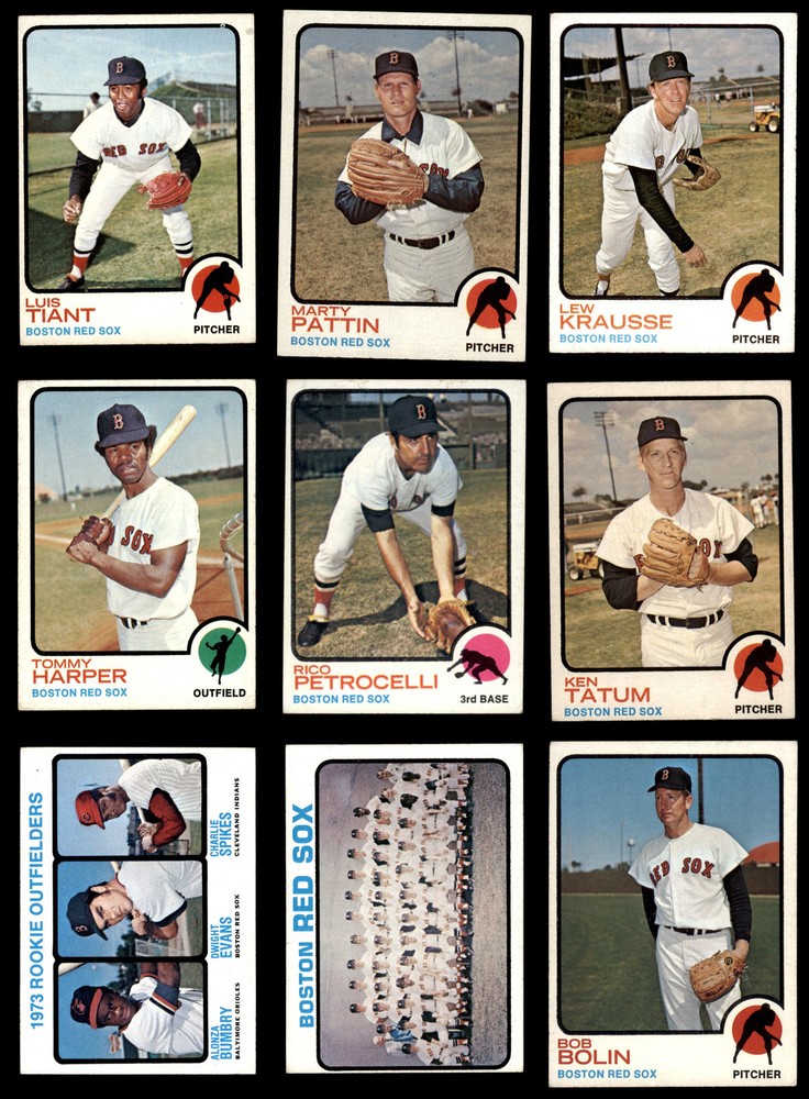 This set contains the following cards 1973 Topps #14 Sonny Siebert 3 - VG Front Back 1973 Topps #40 Reggie Smith 4 - VG/EX Front Back 1973 Topps #65 - Steve Carlton / Luis Tiant ERA Leaders 3 - VG Front Back 1973 Topps #69 Phil Gagliano 3 - VG Front Back 1973 Topps #96 Doug Griffin 3 - VG Front Back 1973 Topps #114 Lynn McGlothen 3 - VG Front Back 1973 Topps #131 BRN - Eddie Kasko / Doug Camilli / Don Lenhardt / Eddie Popowski / Lee Stange Red Sox Leaders 3 - VG Front Back 1973 Topps #143 John Curtis 3 - VG Front Back 1973 Topps #165 Luis Aparicio 3 - VG Front Back 1973 Topps #193 Carlton Fisk 2 - GOOD Front Back 1973 Topps #224 Bill Lee 4 - VG/EX Front Back 1973 Topps #245 Carl Yastrzemski 3 - VG Front Back 1973 Topps #270 Luis Tiant 4 - VG/EX Front Back 1973 Topps #291 Rogelio Moret 4 - VG/EX Front Back 1973 Topps #317 Danny Cater 3 - VG Front Back 1973 Topps #365 Rico Petrocelli 4 - VG/EX Front Back 1973 Topps #388 Ben Oglivie 4 - VG/EX Front Back 1973 Topps #415 Marty Pattin 5 - EX Front Back 1973 Topps #437 John Kennedy 4 - VG/EX Front Back 1973 Topps #463 Ken Tatum 4 - VG/EX Front Back 1973 Topps #491 Bob Montgomery 4 - VG/EX Front Back 1973 Topps #518 Bob Veale 4 - VG/EX Front Back 1973 Topps #541 Bobby Bolin 3 - VG Front Back 1973 Topps #566 Lew Krausse 6 - EX/MT Front Back 1973 Topps #596 Red Sox Team 4 - VG/EX Front Back 1973 Topps #614 - Dwight Evans / Al Bumbry / Charlie Spikes Rookie Outfielders 6 - EX/MT Front Back 1973 Topps #620 Tommy Harper 4 - VG/EX Front Back 1973 Topps Boston Red Sox Team Set has all of the standard cards. The cards not included are expensive multi-team rookie cards, that were left out of the team set to keep the cost down. The 1973 Topps was the first set to feature all of multi-player rookie cards by position, instead of by their respective teams. To make a bad idea even worse, Topps waited until 7th Series to issue this cards, making them expensive, as well as undesired. As a result, the 1973 Topps multi-player rookie cards are not considered part of 1973 Topps Team Sets. We feel that they do not offer enough value to team sets to offset the additional expense. If you dis-agree, the 1973 multi-team rookie cards can be purchased individually on our site. Set breakdown by grade: Number of Cards in Set 27 Average Grade - Weighted by Value 4.72 - VG/EX+ Average Grade - Unweighted 3.70 - VG+ Grade Breakdown 6 - EX/MT 2 5 - EX 1 4 - VG/EX 12 3 - VG 11 2 - GOOD 1 The following cards are omitted from this set: #616 Rookie Pitchers - Norm Angelini / Steve Blateric / Mike Garman, #477 All-Time Victory Leader - Cy Young and #607 Rookie Shortstops - Ray Busse / Pepe Frias / Mario Guerrero Dean's Cards offers a 100% Money Back Satisfaction Guarantee on all purchases. Just contact us within 10 days of the purchase date and we will refund your money or, when possible, replace the cards. 1973 Topps Boston Red Sox Team Set 4.5 - VG/EX+ 6910743 If the scan in the listing says ACTUAL IMAGE, you will receive the card pictured. For cards issued after 1983, we will often use representative images and you will not receive the exact card pictured. Shipping Policy You only pay shipping on the first item. If you order multiple items on the same order, you will only be charged once for shipping. We do not combine shipping on multiple orders. To avoid multiple shipping charges we recommend using eBay's "Add to Cart" feature to check out multiple items in one transaction, or please request and allow for us to send an invoice to reflect the combined shipping charges. Canadian customers - We send all of our Canadian/International packages with tracking and cannot make any exceptions to this policy. Negotiating Prices All prices are final and we do not negotiate. This policy is to ensure that everyone knows that they are getting our best possible price. So please do not ask us to negotiate on price. Return Policy Dean's Cards has a 100% Money Back Satisfaction Guarantee on all purchases, as long as the product is returned within 30 days of receiving the product. Card Grading Each card is first reviewed by a member of our team, in order to detect any flaws that may not be visible on a scan, such as wrinkles, creases, print spots, or light stains. The vast majority of our vintage cards are professionally graded by the Dean's Cards Grading Software and include a 100% satisfaction guarantee. Our grading is on par with PSA standards when it comes to corners, centering and flaws - and tends to grade a bit tougher than PSA, on cards with a tilted image or rough edges. This grading software was developed to provide far better grading and consistency than can be achieved using the human eye. Determining the card's grade The sharpness of the corners and the degree to which a card was cut off-center determines the maximum possible grade that the card can receive. The card's grade is further reduced by any flaws or blemishes that it may have. Each card is evaluated on the following characteristics and assigned a score. Corners - Each corner of a card is individually analyzed, and then assigned a score on how square, sharp, and flawless it appears. Centering - The borders are measured, at multiple points along the edge, to determine the horizontal and vertical centering and tilt. Defects - The card is examined for imperfections, such as: size, print flaws, dings, stains, creases, or other wear which could lower its grade. Bonus for Perfect Centering - A vintage card, with near perfect centering, is given a one-half grade bonus. So when you buy one of our cards with a half-grade (e.g. 3.5 or 6.5) it will appear perfectly centered, both vertically and horizontally. Grading Criteria Worst Corner - A card can grade only as high as the worst corner will allow. Average Corner Tilt - The difference in width of a card border near the top, compared to the bottom. OCT - The sum of how far a card is Off-Center, plus its Tilt. Minimum Centering Requirements Eye Appeal - The combination of a card's center