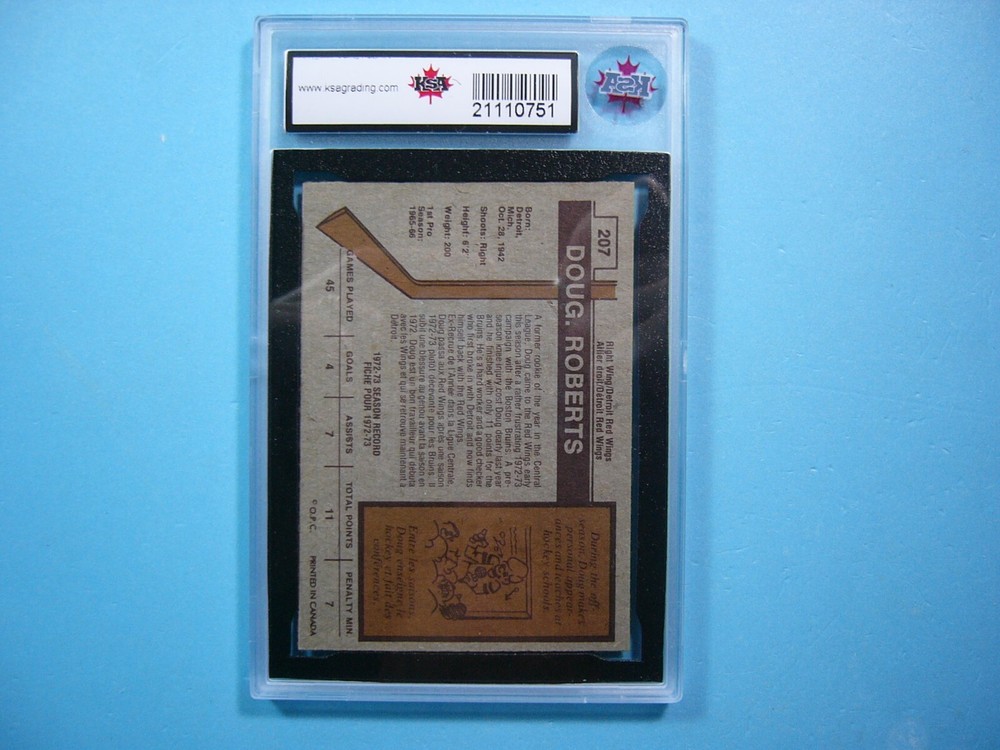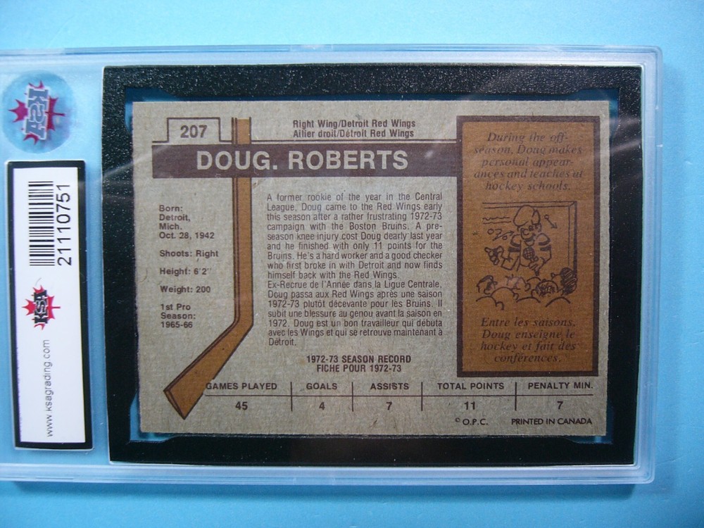 YOU ARE BIDDING ON A 1973/74 O-PEE-CHEE NHL HOCKEY CARD #207 DOUG ROBERTS, DETROIT RED WINGS . CARD IS GRADED 10 BY KSA IN GEM MINT CONDITION. GREAT COLOUR & GLOSS--A SUPER SHARP, CLEAN & ATTRACTIVE CARD FROM THIS VALUABLE O-PEE-CHEE HOCKEY SET!!! THANK YOU FOR LOOKING AND GOOD LUCK!!! -------------------------------------------------------------------------------------------------------------------------------- SHIPPING WITHIN CANADA IS $4.99. SHIPPING TO THE UNITED STATES IS $8.99 AND INCLUDES TRACKING & INSURANCE. SHIPPING INTERNATIONALLY (ANYWHERE ELSE) IS $25.00 AND INCLUDES TRACKING & INSURANCE. ITEM WILL BE CAREFULLY PACKAGED SO AS NOT TO GET DAMAGED DURING SHIPPING. IF YOU ARE IN CANADA AND WOULD LIKE SHIPPING WITH TRACKING & INSURANCE INCLUDED COST IS $12.99. PLEASE CONTACT US BEFORE PAYMENT IS MADE TO ADJUST THE INVOICE ACCORDINGLY. WE DO COMBINE SHIPPING ON MULTIPLE PURCHASES--ONLY $1.00 MORE FOR EACH ADDITIONAL SINGLE GRADED CARD OR ONLY 25 CENTS MORE FOR EACH ADDITIONAL SINGLE UNGRADED CARD. TAKE A LOOK AT OUR OTHER AUCTIONS AND SAVE ON SHIPPING!!!
