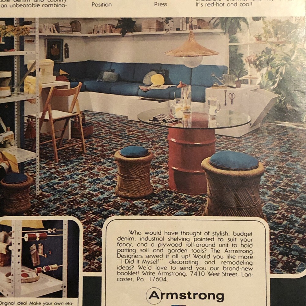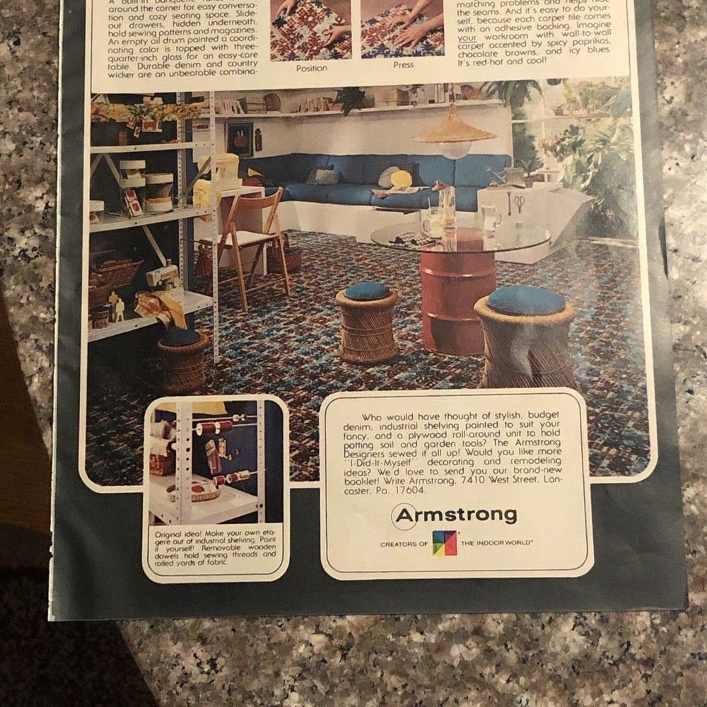 The product is a vintage 1974 Armstrong Carpet Tile magazine print ad featuring a multi-color design. This original ad showcases the brand's home décor theme and was created in the United States. The press advertisement measures approximately 8"x11" and is a collectible piece that would appeal to those interested in vintage household advertising.